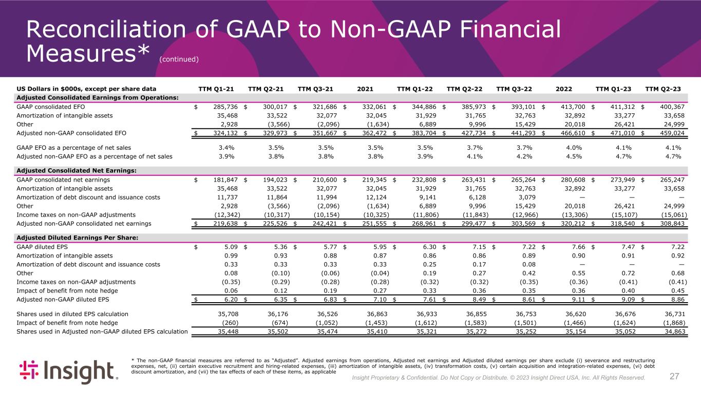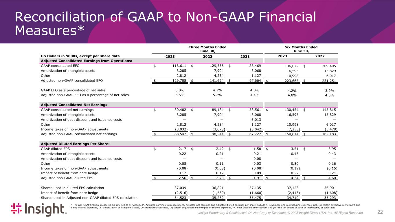 Insight Proprietary & Confidential. Do Not Copy or Distribute. © 2022 Insight Direct USA, Inc. All Rights Reserved. 223 Reconciliation of GAAP to Non-GAAP Financial Measures* Three Months Ended June 30, Six Months Ended June 30, US Dollars in $000s, except per share data 2023 2022 2021 2023 2022 Adjusted Consolidated Earnings from Operations: GAAP consolidated EFO $ 118,611 $ 129,556 $ 88,469 196,072 $ 209,405 Amortization of intangible assets 8,285 7,904 8,068 16,595 15,829 Other 2,812 4,234 1,127 10,998 6,017 Adjusted non-GAAP consolidated EFO $ 129,708 $ 141,694 $ 97,664 $ 223,665 $ 231,251 GAAP EFO as a percentage of net sales 5.0 % 4.7 % 4.0 % 4.2 % 3.9 % Adjusted non-GAAP EFO as a percentage of net sales 5.5 % 5.2 % 4.4 % 4.8 % 4.3 % Adjusted Consolidated Net Earnings: GAAP consolidated net earnings $ 80,482 $ 89,184 $ 58,561 $ 130,454 $ 145,815 Amortization of intangible assets 8,285 7,904 8,068 16,595 15,829 Amortization of debt discount and issuance costs — — 3,013 — — Other 2,812 4,234 1,127 10,998 6,017 Income taxes on non-GAAP adjustments (3,032) (3,078) (3,042) (7,233) (5,478) Adjusted non-GAAP consolidated net earnings $ 88,547 $ 98,244 $ 67,727 $ 150,814 $ 162,183 Adjusted Diluted Earnings Per Share: GAAP diluted EPS $ 2.17 $ 2.42 $ 1.58 $ 3.51 $ 3.95 Amortization of intangible assets 0.22 0.21 0.21 0.45 0.43 Amortization of debt discount and issuance costs — — 0.08 — — Other 0.08 0.11 0.03 0.30 0.16 Income taxes on non-GAAP adjustments (0.08) (0.08) (0.08) (0.19) (0.15) Impact of benefit from note hedge 0.17 0.12 0.09 0.27 0.21 Adjusted non-GAAP diluted EPS $ 2.56 $ 2.78 $ 1.91 $ 4.34 $ 4.60 Shares used in diluted EPS calculation 37,039 36,821 37,135 37,123 36,901 Impact of benefit from note hedge (2,516) (1,539) (1,660) (2,413) (1,608) Shares used in Adjusted non-GAAP diluted EPS calculation 34,523 35,282 35,475 34,710 35,293 * The non-GAAP financial measures are referred to as “Adjusted”. Adjusted earnings from operations, Adjusted net earnings and Adjusted diluted earnings per share exclude (i) severance and restructuring expenses, net, (ii) certain executive recruitment and hiring-related expenses, (iii) amortization of intangible assets, (iv) transformation costs, (v) certain acquisition and integration-related expenses, (vi) debt discount amortization, and (vii) the tax effects of each of these items, as applicable
