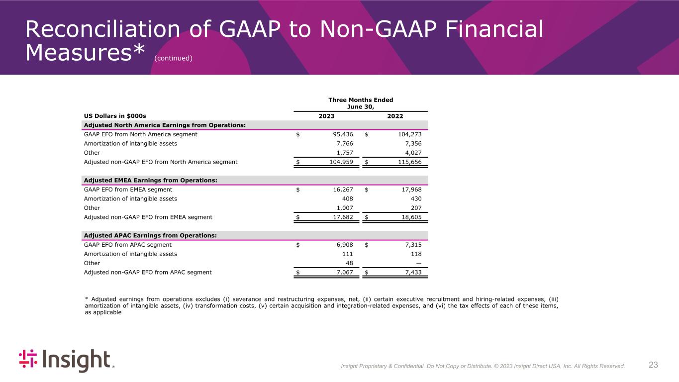 Insight Proprietary & Confidential. Do Not Copy or Distribute. © 2022 Insight Direct USA, Inc. All Rights Reserved. 233 Reconciliation of GAAP to Non-GAAP Financial Measures* (continued) Three Months Ended June 30, US Dollars in $000s 2023 2022 Adjusted North America Earnings from Operations: GAAP EFO from North America segment $ 95,436 $ 104,273 Amortization of intangible assets 7,766 7,356 Other 1,757 4,027 Adjusted non-GAAP EFO from North America segment $ 104,959 $ 115,656 Adjusted EMEA Earnings from Operations: GAAP EFO from EMEA segment $ 16,267 $ 17,968 Amortization of intangible assets 408 430 Other 1,007 207 Adjusted non-GAAP EFO from EMEA segment $ 17,682 $ 18,605 Adjusted APAC Earnings from Operations: GAAP EFO from APAC segment $ 6,908 $ 7,315 Amortization of intangible assets 111 118 Other 48 — Adjusted non-GAAP EFO from APAC segment $ 7,067 $ 7,433 * Adjusted earnings from operations excludes (i) severance and restructuring expenses, net, (ii) certain executive recruitment and hiring-related expenses, (iii) amortization of intangible assets, (iv) transformation costs, (v) certain acquisition and integration-related expenses, and (vi) the tax effects of each of these items, as applicable