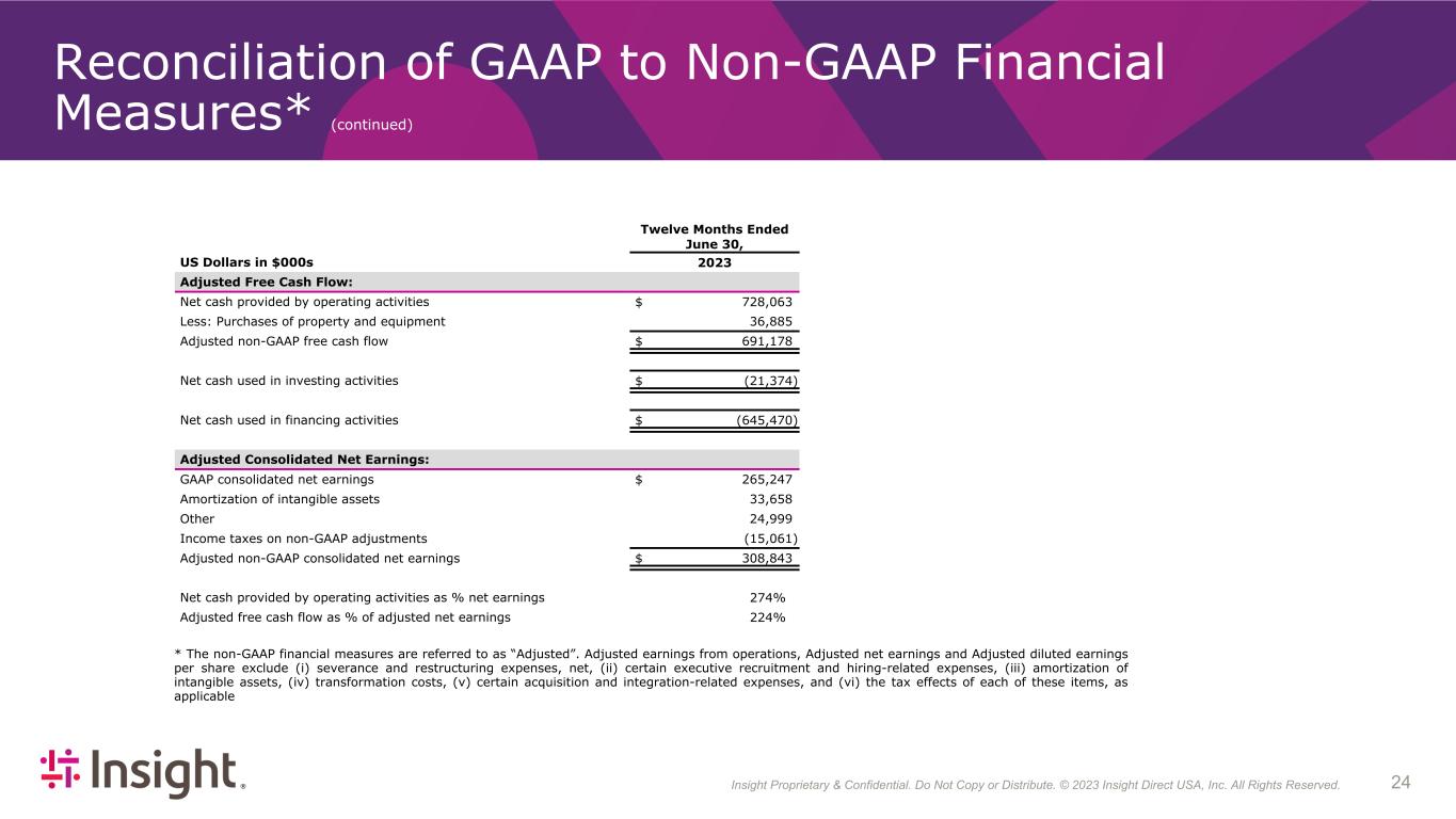 Insight Proprietary & Confidential. Do Not Copy or Distribute. © 2022 Insight Direct USA, Inc. All Rights Reserved. 243 Reconciliation of GAAP to Non-GAAP Financial Measures* (continued) Twelve Months Ended June 30, US Dollars in $000s 2023 Adjusted Free Cash Flow: Net cash provided by operating activities $ 728,063 Less: Purchases of property and equipment 36,885 Adjusted non-GAAP free cash flow $ 691,178 Net cash used in investing activities $ (21,374) Net cash used in financing activities $ (645,470) Adjusted Consolidated Net Earnings: GAAP consolidated net earnings $ 265,247 Amortization of intangible assets 33,658 Other 24,999 Income taxes on non-GAAP adjustments (15,061) Adjusted non-GAAP consolidated net earnings $ 308,843 Net cash provided by operating activities as % net earnings 274 % Adjusted free cash flow as % of adjusted net earnings 224 % * The non-GAAP financial measures are referred to as “Adjusted”. Adjusted earnings from operations, Adjusted net earnings and Adjusted diluted earnings per share exclude (i) severance and restructuring expenses, net, (ii) certain executive recruitment and hiring-related expenses, (iii) amortization of intangible assets, (iv) transformation costs, (v) certain acquisition and integration-related expenses, and (vi) the tax effects of each of these items, as applicable