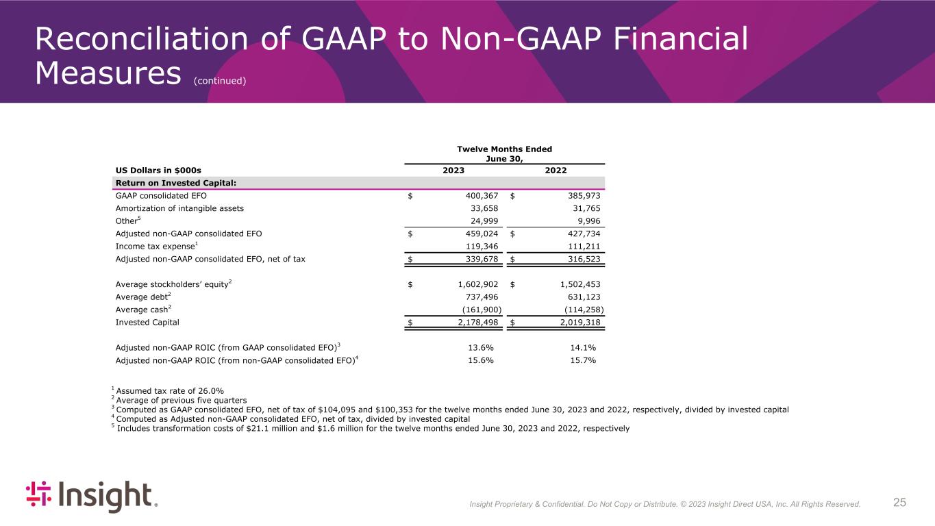 Insight Proprietary & Confidential. Do Not Copy or Distribute. © 2022 Insight Direct USA, Inc. All Rights Reserved. 253 Reconciliation of GAAP to Non-GAAP Financial Measures (continued) 1 Assumed tax rate of 26.0% 2 Average of previous five quarters 3 Computed as GAAP consolidated EFO, net of tax of $104,095 and $100,353 for the twelve months ended June 30, 2023 and 2022, respectively, divided by invested capital 4 Computed as Adjusted non-GAAP consolidated EFO, net of tax, divided by invested capital 5 Includes transformation costs of $21.1 million and $1.6 million for the twelve months ended June 30, 2023 and 2022, respectively Twelve Months Ended June 30, US Dollars in $000s 2023 2022 Return on Invested Capital: GAAP consolidated EFO $ 400,367 $ 385,973 Amortization of intangible assets 33,658 31,765 Other5 24,999 9,996 Adjusted non-GAAP consolidated EFO $ 459,024 $ 427,734 Income tax expense1 119,346 111,211 Adjusted non-GAAP consolidated EFO, net of tax $ 339,678 $ 316,523 Average stockholders’ equity2 $ 1,602,902 $ 1,502,453 Average debt2 737,496 631,123 Average cash2 (161,900) (114,258) Invested Capital $ 2,178,498 $ 2,019,318 Adjusted non-GAAP ROIC (from GAAP consolidated EFO)3 13.6 % 14.1 % Adjusted non-GAAP ROIC (from non-GAAP consolidated EFO)4 15.6 % 15.7 %
