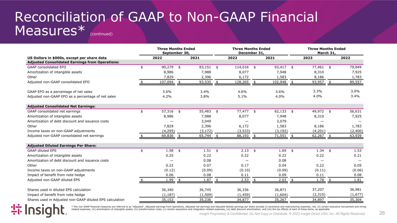 Insight Proprietary & Confidential. Do Not Copy or Distribute. © 2022 Insight Direct USA, Inc. All Rights Reserved. 263 Reconciliation of GAAP to Non-GAAP Financial Measures* (continued) Three Months Ended Three Months Ended Three Months Ended September 30, December 31, March 31, US Dollars in $000s, except per share data 2022 2021 2022 2021 2023 2022 Adjusted Consolidated Earnings from Operations: GAAP consolidated EFO $ 90,279 $ 83,151 $ 114,016 $ 93,417 $ 77,461 $ 79,849 Amortization of intangible assets 8,986 7,988 8,077 7,948 8,310 7,925 Other 7,829 2,396 6,172 1,583 8,186 1,783 Adjusted non-GAAP consolidated EFO $ 107,094 $ 93,535 $ 128,265 $ 102,948 $ 93,957 $ 89,557 GAAP EFO as a percentage of net sales 3.6 % 3.4 % 4.6 % 3.6 % 3.3% 3.0% Adjusted non-GAAP EFO as a percentage of net sales 4.2 % 3.8 % 5.1 % 4.0 % 4.0% 3.4% Adjusted Consolidated Net Earnings: GAAP consolidated net earnings $ 57,316 $ 55,483 $ 77,477 $ 62,133 $ 49,972 $ 56,631 Amortization of intangible assets 8,986 7,988 8,077 7,948 8,310 7,925 Amortization of debt discount and issuance costs — 3,049 — 3,079 — — Other 7,829 2,396 6,172 1,583 8,186 1,783 Income taxes on non-GAAP adjustments (4,295) (3,172) (3,533) (3,192) (4,201) (2,400) Adjusted non-GAAP consolidated net earnings $ 69,836 $ 65,744 $ 88,193 $ 71,551 $ 62,267 $ 63,939 Adjusted Diluted Earnings Per Share: GAAP diluted EPS $ 1.58 $ 1.51 $ 2.13 $ 1.69 $ 1.34 $ 1.53 Amortization of intangible assets 0.25 0.22 0.22 0.22 0.22 0.21 Amortization of debt discount and issuance costs — 0.08 — 0.08 — — Other 0.22 0.07 0.17 0.04 0.22 0.05 Income taxes on non-GAAP adjustments (0.12) (0.09) (0.10) (0.09) (0.11) (0.06) Impact of benefit from note hedge 0.06 0.08 0.11 0.09 0.11 0.08 Adjusted non-GAAP diluted EPS $ 1.99 $ 1.87 $ 2.53 $ 2.03 $ 1.78 $ 1.81 Shares used in diluted EPS calculation 36,340 36,745 36,336 36,871 37,207 36,981 Impact of benefit from note hedge (1,187) (1,509) (1,459) (1,604) (2,310) (1,677) Shares used in Adjusted non-GAAP diluted EPS calculation 35,153 35,236 34,877 35,267 34,897 35,304 * The non-GAAP financial measures are referred to as “Adjusted”. Adjusted earnings from operations, Adjusted net earnings and Adjusted diluted earnings per share exclude (i) severance and restructuring expenses, net, (ii) certain executive recruitment and hiring- related expenses, (iii) amortization of intangible assets, (iv) transformation costs, (v) certain acquisition and integration-related expenses, (vi) debt discount amortization, and (vii) the tax effects of each of these items, as applicable