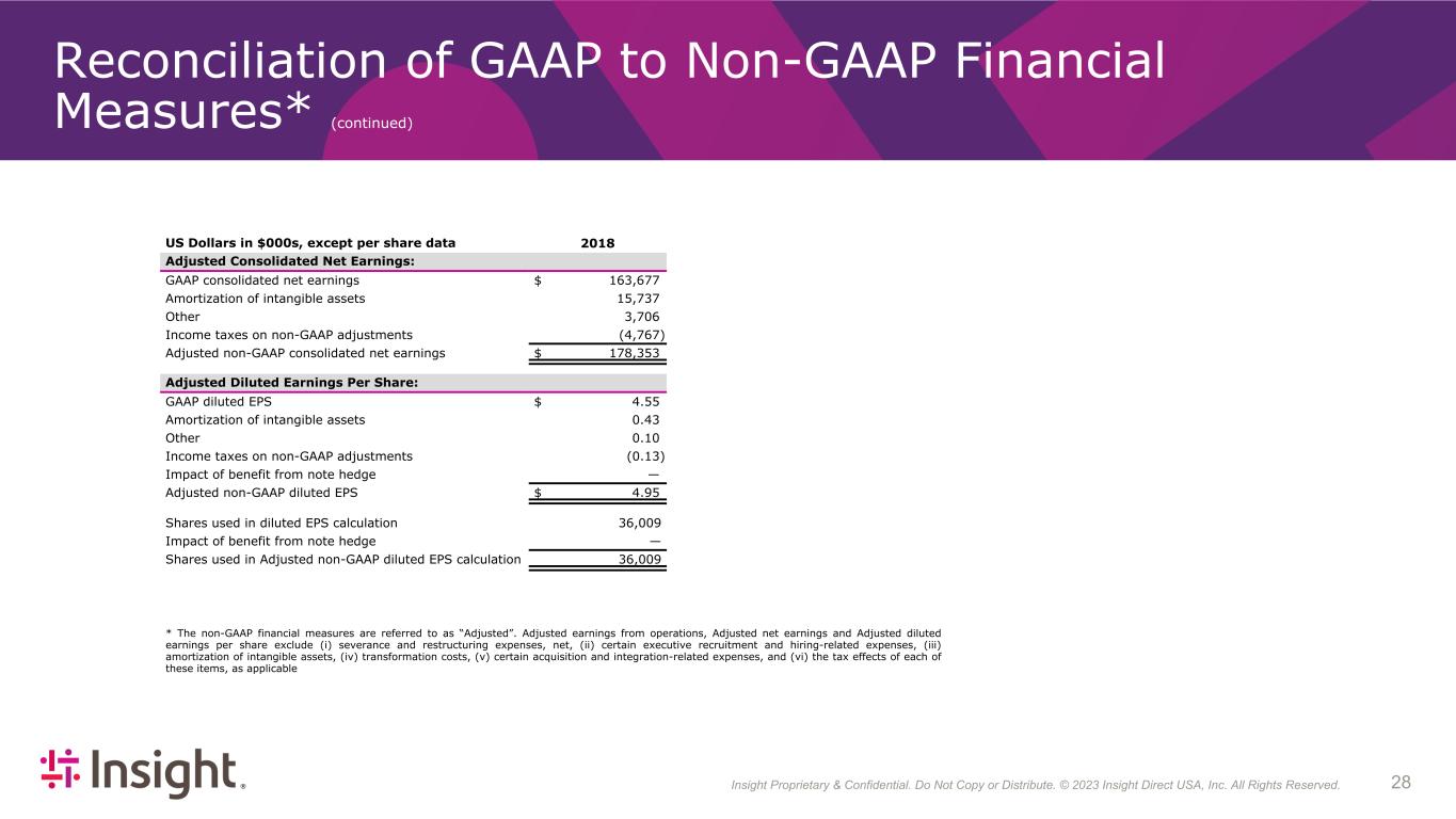 Insight Proprietary & Confidential. Do Not Copy or Distribute. © 2022 Insight Direct USA, Inc. All Rights Reserved. 283 Reconciliation of GAAP to Non-GAAP Financial Measures* (continued) * The non-GAAP financial measures are referred to as “Adjusted”. Adjusted earnings from operations, Adjusted net earnings and Adjusted diluted earnings per share exclude (i) severance and restructuring expenses, net, (ii) certain executive recruitment and hiring-related expenses, (iii) amortization of intangible assets, (iv) transformation costs, (v) certain acquisition and integration-related expenses, and (vi) the tax effects of each of these items, as applicable US Dollars in $000s, except per share data 2018 Adjusted Consolidated Net Earnings: GAAP consolidated net earnings $ 163,677 Amortization of intangible assets 15,737 Other 3,706 Income taxes on non-GAAP adjustments (4,767) Adjusted non-GAAP consolidated net earnings $ 178,353 Adjusted Diluted Earnings Per Share: GAAP diluted EPS $ 4.55 Amortization of intangible assets 0.43 Other 0.10 Income taxes on non-GAAP adjustments (0.13) Impact of benefit from note hedge — Adjusted non-GAAP diluted EPS $ 4.95 Shares used in diluted EPS calculation 36,009 Impact of benefit from note hedge — Shares used in Adjusted non-GAAP diluted EPS calculation 36,009