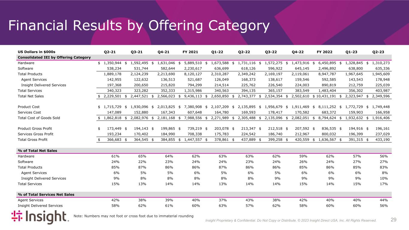 Insight Proprietary & Confidential. Do Not Copy or Distribute. © 2022 Insight Direct USA, Inc. All Rights Reserved. 293 Financial Results by Offering Category US Dollars in $000s Q2-21 Q3-21 Q4-21 FY 2021 Q1-22 Q2-22 Q3-22 Q4-22 FY 2022 Q1-23 Q2-23 Consolidated IEI by Offering Category Hardware $ 1,350,944 $ 1,592,495 $ 1,631,046 $ 5,889,510 $ 1,673,588 $ 1,731,116 $ 1,572,275 $ 1,473,916 $ 6,450,895 $ 1,328,845 $ 1,310,273 Software 538,234 531,744 582,644 2,230,617 636,699 618,126 596,922 645,145 2,496,892 638,800 635,336 Total Products 1,889,178 2,124,239 2,213,690 8,120,127 2,310,287 2,349,242 2,169,197 2,119,061 8,947,787 1,967,645 1,945,609 Agent Services 142,955 122,632 136,513 521,687 126,049 168,373 138,617 159,546 592,585 143,543 178,948 Insight Delivered Services 197,368 200,650 215,820 794,299 214,514 225,762 226,540 224,003 890,819 212,759 225,039 Total Services 340,323 323,282 352,333 1,315,986 340,563 394,135 365,157 383,549 1,483,404 356,302 403,987 Total Net Sales $ 2,229,501 $ 2,447,521 $ 2,566,023 $ 9,436,113 $ 2,650,850 $ 2,743,377 $ 2,534,354 $ 2,502,610 $ 10,431,191 $ 2,323,947 $ 2,349,596 Product Cost $ 1,715,729 $ 1,930,096 $ 2,013,825 $ 7,380,908 $ 2,107,209 $ 2,135,895 $ 1,956,679 $ 1,911,469 $ 8,111,252 $ 1,772,729 $ 1,749,448 Services Cost 147,089 152,880 167,343 607,648 164,780 169,593 178,417 170,582 683,372 159,903 166,958 Total Cost of Goods Sold $ 1,862,818 $ 2,082,976 $ 2,181,168 $ 7,988,556 $ 2,271,989 $ 2,305,488 $ 2,135,096 $ 2,082,051 $ 8,794,624 $ 1,932,632 $ 1,916,406 Product Gross Profit $ 173,449 $ 194,143 $ 199,865 $ 739,219 $ 203,078 $ 213,347 $ 212,518 $ 207,592 $ 836,535 $ 194,916 $ 196,161 Services Gross Profit 193,234 170,402 184,990 708,338 175,783 224,542 186,740 212,967 800,032 196,399 237,029 Total Gross Profit $ 366,683 $ 364,545 $ 384,855 $ 1,447,557 $ 378,861 $ 437,889 $ 399,258 $ 420,559 $ 1,636,567 $ 391,315 $ 433,190 % of Total Net Sales Hardware 61 % 65 % 64 % 62 % 63 % 63 % 62 % 59 % 62 % 57 % 56 % Software 24 % 22 % 23 % 24 % 24 % 23 % 24 % 26 % 24 % 27 % 27 % Total Products 85 % 87 % 86 % 86 % 87 % 86 % 86 % 85 % 86 % 85 % 83 % Agent Services 6 % 5 % 5 % 6 % 5 % 6 % 5 % 6 % 6 % 6 % 8 % Insight Delivered Services 9 % 8 % 8 % 8 % 8 % 8 % 9 % 9 % 9 % 9 % 10 % Total Services 15 % 13 % 14 % 14 % 13 % 14 % 14 % 15 % 14 % 15 % 17 % % of Total Services Net Sales Agent Services 42 % 38 % 39 % 40 % 37 % 43 % 38 % 42 % 40 % 40 % 44 % Insight Delivered Services 58 % 62 % 61 % 60 % 63 % 57 % 62 % 58 % 60 % 60 % 56 % Note: Numbers may not foot or cross foot due to immaterial rounding