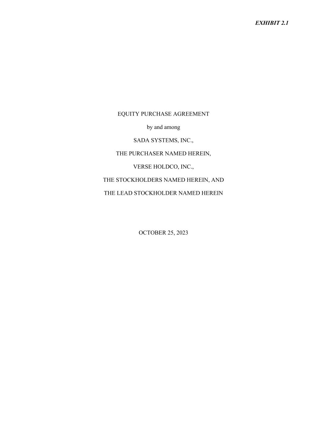 EXHIBIT 2.1 EQUITY PURCHASE AGREEMENT by and among SADA SYSTEMS, INC., THE PURCHASER NAMED HEREIN, VERSE HOLDCO, INC., THE STOCKHOLDERS NAMED HEREIN, AND THE LEAD STOCKHOLDER NAMED HEREIN OCTOBER 25, 2023