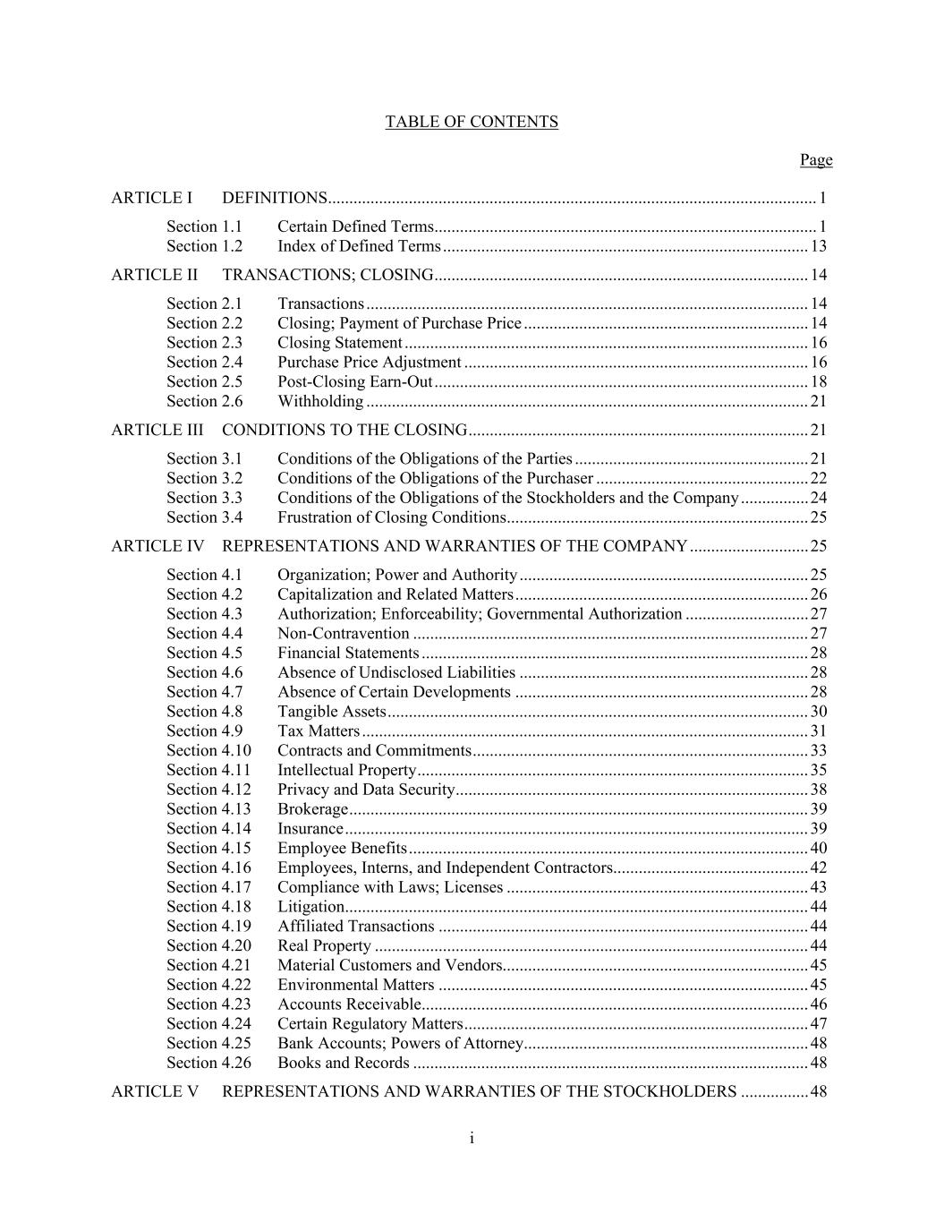 i TABLE OF CONTENTS Page ARTICLE I DEFINITIONS ................................................................................................................... 1 Section 1.1 Certain Defined Terms .......................................................................................... 1 Section 1.2 Index of Defined Terms ...................................................................................... 13 ARTICLE II TRANSACTIONS; CLOSING ........................................................................................ 14 Section 2.1 Transactions ........................................................................................................ 14 Section 2.2 Closing; Payment of Purchase Price ................................................................... 14 Section 2.3 Closing Statement ............................................................................................... 16 Section 2.4 Purchase Price Adjustment ................................................................................. 16 Section 2.5 Post-Closing Earn-Out ........................................................................................ 18 Section 2.6 Withholding ........................................................................................................ 21 ARTICLE III CONDITIONS TO THE CLOSING ................................................................................ 21 Section 3.1 Conditions of the Obligations of the Parties ....................................................... 21 Section 3.2 Conditions of the Obligations of the Purchaser .................................................. 22 Section 3.3 Conditions of the Obligations of the Stockholders and the Company ................ 24 Section 3.4 Frustration of Closing Conditions ....................................................................... 25 ARTICLE IV REPRESENTATIONS AND WARRANTIES OF THE COMPANY ............................ 25 Section 4.1 Organization; Power and Authority .................................................................... 25 Section 4.2 Capitalization and Related Matters ..................................................................... 26 Section 4.3 Authorization; Enforceability; Governmental Authorization ............................. 27 Section 4.4 Non-Contravention ............................................................................................. 27 Section 4.5 Financial Statements ........................................................................................... 28 Section 4.6 Absence of Undisclosed Liabilities .................................................................... 28 Section 4.7 Absence of Certain Developments ..................................................................... 28 Section 4.8 Tangible Assets ................................................................................................... 30 Section 4.9 Tax Matters ......................................................................................................... 31 Section 4.10 Contracts and Commitments ............................................................................... 33 Section 4.11 Intellectual Property ............................................................................................ 35 Section 4.12 Privacy and Data Security ................................................................................... 38 Section 4.13 Brokerage ............................................................................................................ 39 Section 4.14 Insurance ............................................................................................................. 39 Section 4.15 Employee Benefits .............................................................................................. 40 Section 4.16 Employees, Interns, and Independent Contractors.............................................. 42 Section 4.17 Compliance with Laws; Licenses ....................................................................... 43 Section 4.18 Litigation ............................................................................................................. 44 Section 4.19 Affiliated Transactions ....................................................................................... 44 Section 4.20 Real Property ...................................................................................................... 44 Section 4.21 Material Customers and Vendors........................................................................ 45 Section 4.22 Environmental Matters ....................................................................................... 45 Section 4.23 Accounts Receivable ........................................................................................... 46 Section 4.24 Certain Regulatory Matters ................................................................................. 47 Section 4.25 Bank Accounts; Powers of Attorney................................................................... 48 Section 4.26 Books and Records ............................................................................................. 48 ARTICLE V REPRESENTATIONS AND WARRANTIES OF THE STOCKHOLDERS ................ 48