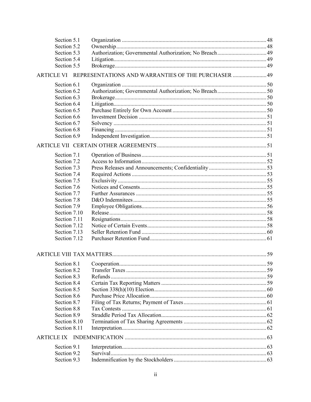 ii Section 5.1 Organization ....................................................................................................... 48 Section 5.2 Ownership ........................................................................................................... 48 Section 5.3 Authorization; Governmental Authorization; No Breach ................................... 49 Section 5.4 Litigation ............................................................................................................. 49 Section 5.5 Brokerage ............................................................................................................ 49 ARTICLE VI REPRESENTATIONS AND WARRANTIES OF THE PURCHASER ........................ 49 Section 6.1 Organization ....................................................................................................... 50 Section 6.2 Authorization; Governmental Authorization; No Breach ................................... 50 Section 6.3 Brokerage ............................................................................................................ 50 Section 6.4 Litigation ............................................................................................................. 50 Section 6.5 Purchase Entirely for Own Account ................................................................... 50 Section 6.6 Investment Decision ........................................................................................... 51 Section 6.7 Solvency ............................................................................................................. 51 Section 6.8 Financing ............................................................................................................ 51 Section 6.9 Independent Investigation ................................................................................... 51 ARTICLE VII CERTAIN OTHER AGREEMENTS .............................................................................. 51 Section 7.1 Operation of Business ......................................................................................... 51 Section 7.2 Access to Information ......................................................................................... 52 Section 7.3 Press Releases and Announcements; Confidentiality ......................................... 53 Section 7.4 Required Actions ................................................................................................ 53 Section 7.5 Exclusivity .......................................................................................................... 55 Section 7.6 Notices and Consents .......................................................................................... 55 Section 7.7 Further Assurances ............................................................................................. 55 Section 7.8 D&O Indemnitees ............................................................................................... 55 Section 7.9 Employee Obligations ......................................................................................... 56 Section 7.10 Release ................................................................................................................ 58 Section 7.11 Resignations ........................................................................................................ 58 Section 7.12 Notice of Certain Events ..................................................................................... 58 Section 7.13 Seller Retention Fund ......................................................................................... 60 Section 7.12 Purchaser Retention Fund ................................................................................... 61 ARTICLE VIII TAX MATTERS .............................................................................................................. 59 Section 8.1 Cooperation ......................................................................................................... 59 Section 8.2 Transfer Taxes .................................................................................................... 59 Section 8.3 Refunds ............................................................................................................... 59 Section 8.4 Certain Tax Reporting Matters ........................................................................... 59 Section 8.5 Section 338(h)(10) Election ................................................................................ 60 Section 8.6 Purchase Price Allocation ................................................................................... 60 Section 8.7 Filing of Tax Returns; Payment of Taxes ........................................................... 61 Section 8.8 Tax Contests ....................................................................................................... 61 Section 8.9 Straddle Period Tax Allocation ........................................................................... 62 Section 8.10 Termination of Tax Sharing Agreements ........................................................... 62 Section 8.11 Interpretation ....................................................................................................... 62 ARTICLE IX INDEMNIFICATION ..................................................................................................... 63 Section 9.1 Interpretation ....................................................................................................... 63 Section 9.2 Survival ............................................................................................................... 63 Section 9.3 Indemnification by the Stockholders .................................................................. 63