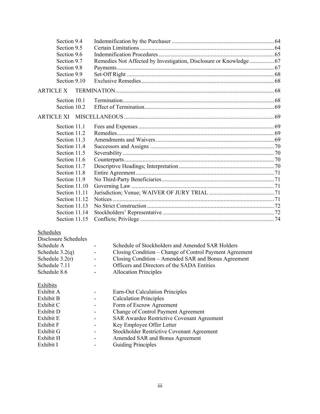 iii Section 9.4 Indemnification by the Purchaser ....................................................................... 64 Section 9.5 Certain Limitations ............................................................................................. 64 Section 9.6 Indemnification Procedures ................................................................................ 65 Section 9.7 Remedies Not Affected by Investigation, Disclosure or Knowledge ................. 67 Section 9.8 Payments ............................................................................................................. 67 Section 9.9 Set-Off Right ...................................................................................................... 68 Section 9.10 Exclusive Remedies ............................................................................................ 68 ARTICLE X TERMINATION .............................................................................................................. 68 Section 10.1 Termination ......................................................................................................... 68 Section 10.2 Effect of Termination .......................................................................................... 69 ARTICLE XI MISCELLANEOUS ........................................................................................................ 69 Section 11.1 Fees and Expenses .............................................................................................. 69 Section 11.2 Remedies ............................................................................................................. 69 Section 11.3 Amendments and Waivers .................................................................................. 69 Section 11.4 Successors and Assigns ...................................................................................... 70 Section 11.5 Severability ......................................................................................................... 70 Section 11.6 Counterparts ........................................................................................................ 70 Section 11.7 Descriptive Headings; Interpretation .................................................................. 70 Section 11.8 Entire Agreement ................................................................................................ 71 Section 11.9 No Third-Party Beneficiaries .............................................................................. 71 Section 11.10 Governing Law ................................................................................................... 71 Section 11.11 Jurisdiction; Venue; WAIVER OF JURY TRIAL ............................................. 71 Section 11.12 Notices ................................................................................................................ 71 Section 11.13 No Strict Construction ........................................................................................ 72 Section 11.14 Stockholders’ Representative ............................................................................. 72 Section 11.15 Conflicts; Privilege ............................................................................................. 74 Schedules Disclosure Schedules Schedule A - Schedule of Stockholders and Amended SAR Holders Schedule 3.2(q) - Closing Condition – Change of Control Payment Agreement Schedule 3.2(r) - Closing Condition – Amended SAR and Bonus Agreement Schedule 7.11 - Officers and Directors of the SADA Entities Schedule 8.6 - Allocation Principles Exhibits Exhibit A - Earn-Out Calculation Principles Exhibit B - Calculation Principles Exhibit C - Form of Escrow Agreement Exhibit D - Change of Control Payment Agreement Exhibit E - SAR Awardee Restrictive Covenant Agreement Exhibit F - Key Employee Offer Letter Exhibit G - Stockholder Restrictive Covenant Agreement Exhibit H - Amended SAR and Bonus Agreement Exhibit I - Guiding Principles
