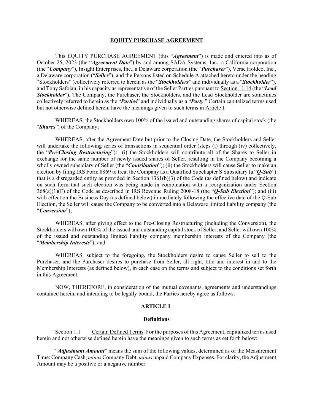 EQUITY PURCHASE AGREEMENT This EQUITY PURCHASE AGREEMENT (this “Agreement”) is made and entered into as of October 25, 2023 (the “Agreement Date”) by and among SADA Systems, Inc., a California corporation (the “Company”), Insight Enterprises, Inc., a Delaware corporation (the “Purchaser”), Verse Holdco, Inc., a Delaware corporation (“Seller”), and the Persons listed on Schedule A attached hereto under the heading “Stockholders” (collectively referred to herein as the “Stockholders” and individually as a “Stockholder”), and Tony Safoian, in his capacity as representative of the Seller Parties pursuant to Section 11.14 (the “Lead Stockholder”). The Company, the Purchaser, the Stockholders, and the Lead Stockholder are sometimes collectively referred to herein as the “Parties” and individually as a “Party.” Certain capitalized terms used but not otherwise defined herein have the meanings given to such terms in Article I. WHEREAS, the Stockholders own 100% of the issued and outstanding shares of capital stock (the “Shares”) of the Company; WHEREAS, after the Agreement Date but prior to the Closing Date, the Stockholders and Seller will undertake the following series of transactions in sequential order (steps (i) through (iv) collectively, the “Pre-Closing Restructuring”): (i) the Stockholders will contribute all of the Shares to Seller in exchange for the same number of newly issued shares of Seller, resulting in the Company becoming a wholly owned subsidiary of Seller (the “Contribution”); (ii) the Stockholders will cause Seller to make an election by filing IRS Form 8869 to treat the Company as a Qualified Subchapter S Subsidiary (a “Q-Sub”) that is a disregarded entity as provided in Section 1361(b)(3) of the Code (as defined below) and indicate on such form that such election was being made in combination with a reorganization under Section 368(a)(1)(F) of the Code as described in IRS Revenue Ruling 2008-18 (the “Q-Sub Election”); and (iii) with effect on the Business Day (as defined below) immediately following the effective date of the Q-Sub Election, the Seller will cause the Company to be converted into a Delaware limited liability company (the “Conversion”); WHEREAS, after giving effect to the Pre-Closing Restructuring (including the Conversion), the Stockholders will own 100% of the issued and outstanding capital stock of Seller, and Seller will own 100% of the issued and outstanding limited liability company membership interests of the Company (the “Membership Interests”); and WHEREAS, subject to the foregoing, the Stockholders desire to cause Seller to sell to the Purchaser, and the Purchaser desires to purchase from Seller, all right, title and interest in and to the Membership Interests (as defined below), in each case on the terms and subject to the conditions set forth in this Agreement. NOW, THEREFORE, in consideration of the mutual covenants, agreements and understandings contained herein, and intending to be legally bound, the Parties hereby agree as follows: ARTICLE I Definitions Section 1.1 Certain Defined Terms. For the purposes of this Agreement, capitalized terms used herein and not otherwise defined herein have the meanings given to such terms as set forth below: “Adjustment Amount” means the sum of the following values, determined as of the Measurement Time: Company Cash, minus Company Debt, minus unpaid Company Expenses. For clarity, the Adjustment Amount may be a positive or a negative number.