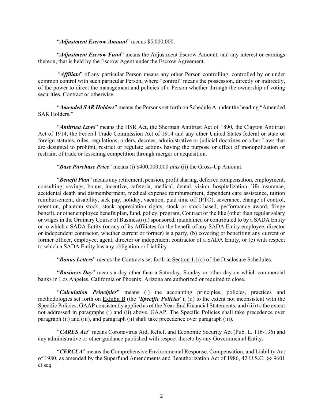 2 “Adjustment Escrow Amount” means $5,000,000. “Adjustment Escrow Fund” means the Adjustment Escrow Amount, and any interest or earnings thereon, that is held by the Escrow Agent under the Escrow Agreement. “Affiliate” of any particular Person means any other Person controlling, controlled by or under common control with such particular Person, where “control” means the possession, directly or indirectly, of the power to direct the management and policies of a Person whether through the ownership of voting securities, Contract or otherwise. “Amended SAR Holders” means the Persons set forth on Schedule A under the heading “Amended SAR Holders.” “Antitrust Laws” means the HSR Act, the Sherman Antitrust Act of 1890, the Clayton Antitrust Act of 1914, the Federal Trade Commission Act of 1914 and any other United States federal or state or foreign statutes, rules, regulations, orders, decrees, administrative or judicial doctrines or other Laws that are designed to prohibit, restrict or regulate actions having the purpose or effect of monopolization or restraint of trade or lessening competition through merger or acquisition. “Base Purchase Price” means (i) $400,000,000 plus (ii) the Gross-Up Amount. “Benefit Plan” means any retirement, pension, profit sharing, deferred compensation, employment, consulting, savings, bonus, incentive, cafeteria, medical, dental, vision, hospitalization, life insurance, accidental death and dismemberment, medical expense reimbursement, dependent care assistance, tuition reimbursement, disability, sick pay, holiday, vacation, paid time off (PTO), severance, change of control, retention, phantom stock, stock appreciation rights, stock or stock-based, performance award, fringe benefit, or other employee benefit plan, fund, policy, program, Contract or the like (other than regular salary or wages in the Ordinary Course of Business) (a) sponsored, maintained or contributed to by a SADA Entity or to which a SADA Entity (or any of its Affiliates for the benefit of any SADA Entity employee, director or independent contractor, whether current or former) is a party, (b) covering or benefiting any current or former officer, employee, agent, director or independent contractor of a SADA Entity, or (c) with respect to which a SADA Entity has any obligation or Liability. “Bonus Letters” means the Contracts set forth in Section 1.1(a) of the Disclosure Schedules. “Business Day” means a day other than a Saturday, Sunday or other day on which commercial banks in Los Angeles, California or Phoenix, Arizona are authorized or required to close. “Calculation Principles” means (i) the accounting principles, policies, practices and methodologies set forth on Exhibit B (the “Specific Policies”); (ii) to the extent not inconsistent with the Specific Policies, GAAP consistently applied as of the Year-End Financial Statements; and (iii) to the extent not addressed in paragraphs (i) and (ii) above, GAAP. The Specific Policies shall take precedence over paragraph (ii) and (iii), and paragraph (ii) shall take precedence over paragraph (iii). “CARES Act” means Coronavirus Aid, Relief, and Economic Security Act (Pub. L. 116-136) and any administrative or other guidance published with respect thereto by any Governmental Entity. “CERCLA” means the Comprehensive Environmental Response, Compensation, and Liability Act of 1980, as amended by the Superfund Amendments and Reauthorization Act of 1986, 42 U.S.C. §§ 9601 et seq.