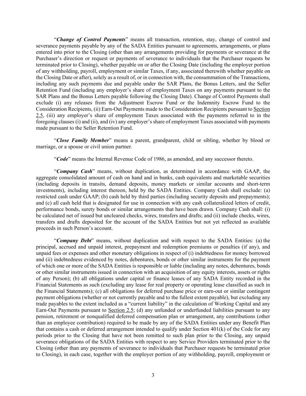 3 “Change of Control Payments” means all transaction, retention, stay, change of control and severance payments payable by any of the SADA Entities pursuant to agreements, arrangements, or plans entered into prior to the Closing (other than any arrangements providing for payments or severance at the Purchaser’s direction or request or payments of severance to individuals that the Purchaser requests be terminated prior to Closing), whether payable on or after the Closing Date (including the employer portion of any withholding, payroll, employment or similar Taxes, if any, associated therewith whether payable on the Closing Date or after), solely as a result of, or in connection with, the consummation of the Transactions, including any such payments due and payable under the SAR Plans, the Bonus Letters, and the Seller Retention Fund (including any employer’s share of employment Taxes on any payments pursuant to the SAR Plans and the Bonus Letters payable following the Closing Date). Change of Control Payments shall exclude (i) any releases from the Adjustment Escrow Fund or the Indemnity Escrow Fund to the Consideration Recipients, (ii) Earn-Out Payments made to the Consideration Recipients pursuant to Section 2.5, (iii) any employer’s share of employment Taxes associated with the payments referred to in the foregoing clauses (i) and (ii), and (iv) any employer’s share of employment Taxes associated with payments made pursuant to the Seller Retention Fund. “Close Family Member” means a parent, grandparent, child or sibling, whether by blood or marriage, or a spouse or civil union partner. “Code” means the Internal Revenue Code of 1986, as amended, and any successor thereto. “Company Cash” means, without duplication, as determined in accordance with GAAP, the aggregate consolidated amount of cash on hand and in banks, cash equivalents and marketable securities (including deposits in transits, demand deposits, money markets or similar accounts and short-term investments), including interest thereon, held by the SADA Entities. Company Cash shall exclude: (a) restricted cash under GAAP; (b) cash held by third parties (including security deposits and prepayments); and (c) all cash held that is designated for use in connection with any cash collateralized letters of credit, performance bonds, surety bonds or similar arrangements that have been drawn. Company Cash shall: (i) be calculated net of issued but uncleared checks, wires, transfers and drafts; and (ii) include checks, wires, transfers and drafts deposited for the account of the SADA Entities but not yet reflected as available proceeds in such Person’s account. “Company Debt” means, without duplication and with respect to the SADA Entities: (a) the principal, accrued and unpaid interest, prepayment and redemption premiums or penalties (if any), and unpaid fees or expenses and other monetary obligations in respect of (i) indebtedness for money borrowed and (ii) indebtedness evidenced by notes, debentures, bonds or other similar instruments for the payment of which one or more of the SADA Entities is responsible or liable (including any notes, debentures, bonds or other similar instruments issued in connection with an acquisition of any equity interests, assets or rights of any Person); (b) all obligations under capital or finance leases of any SADA Entity recorded in the Financial Statements as such (excluding any lease for real property or operating lease classified as such in the Financial Statements); (c) all obligations for deferred purchase price or earn-out or similar contingent payment obligations (whether or not currently payable and to the fullest extent payable), but excluding any trade payables to the extent included as a “current liability” in the calculation of Working Capital and any Earn-Out Payments pursuant to Section 2.5; (d) any unfunded or underfunded liabilities pursuant to any pension, retirement or nonqualified deferred compensation plan or arrangement, any contributions (other than an employee contribution) required to be made by any of the SADA Entities under any Benefit Plan that contains a cash or deferred arrangement intended to qualify under Section 401(k) of the Code for any periods prior to the Closing that have not been remitted to such plan prior to the Closing, any unpaid severance obligations of the SADA Entities with respect to any Service Providers terminated prior to the Closing (other than any payments of severance to individuals that Purchaser requests be terminated prior to Closing), in each case, together with the employer portion of any withholding, payroll, employment or