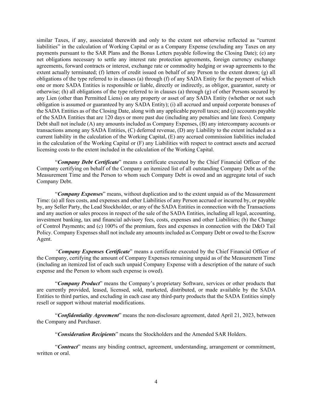 4 similar Taxes, if any, associated therewith and only to the extent not otherwise reflected as “current liabilities” in the calculation of Working Capital or as a Company Expense (excluding any Taxes on any payments pursuant to the SAR Plans and the Bonus Letters payable following the Closing Date); (e) any net obligations necessary to settle any interest rate protection agreements, foreign currency exchange agreements, forward contracts or interest, exchange rate or commodity hedging or swap agreements to the extent actually terminated; (f) letters of credit issued on behalf of any Person to the extent drawn; (g) all obligations of the type referred to in clauses (a) through (f) of any SADA Entity for the payment of which one or more SADA Entities is responsible or liable, directly or indirectly, as obligor, guarantor, surety or otherwise; (h) all obligations of the type referred to in clauses (a) through (g) of other Persons secured by any Lien (other than Permitted Liens) on any property or asset of any SADA Entity (whether or not such obligation is assumed or guaranteed by any SADA Entity); (i) all accrued and unpaid corporate bonuses of the SADA Entities as of the Closing Date, along with any applicable payroll taxes; and (j) accounts payable of the SADA Entities that are 120 days or more past due (including any penalties and late fees). Company Debt shall not include (A) any amounts included as Company Expenses, (B) any intercompany accounts or transactions among any SADA Entities, (C) deferred revenue, (D) any Liability to the extent included as a current liability in the calculation of the Working Capital, (E) any accrued commission liabilities included in the calculation of the Working Capital or (F) any Liabilities with respect to contract assets and accrued licensing costs to the extent included in the calculation of the Working Capital. “Company Debt Certificate” means a certificate executed by the Chief Financial Officer of the Company certifying on behalf of the Company an itemized list of all outstanding Company Debt as of the Measurement Time and the Person to whom such Company Debt is owed and an aggregate total of such Company Debt. “Company Expenses” means, without duplication and to the extent unpaid as of the Measurement Time: (a) all fees costs, and expenses and other Liabilities of any Person accrued or incurred by, or payable by, any Seller Party, the Lead Stockholder, or any of the SADA Entities in connection with the Transactions and any auction or sales process in respect of the sale of the SADA Entities, including all legal, accounting, investment banking, tax and financial advisory fees, costs, expenses and other Liabilities; (b) the Change of Control Payments; and (c) 100% of the premium, fees and expenses in connection with the D&O Tail Policy. Company Expenses shall not include any amounts included as Company Debt or owed to the Escrow Agent. “Company Expenses Certificate” means a certificate executed by the Chief Financial Officer of the Company, certifying the amount of Company Expenses remaining unpaid as of the Measurement Time (including an itemized list of each such unpaid Company Expense with a description of the nature of such expense and the Person to whom such expense is owed). “Company Product” means the Company’s proprietary Software, services or other products that are currently provided, leased, licensed, sold, marketed, distributed, or made available by the SADA Entities to third parties, and excluding in each case any third-party products that the SADA Entities simply resell or support without material modifications. “Confidentiality Agreement” means the non-disclosure agreement, dated April 21, 2023, between the Company and Purchaser. “Consideration Recipients” means the Stockholders and the Amended SAR Holders. “Contract” means any binding contract, agreement, understanding, arrangement or commitment, written or oral.