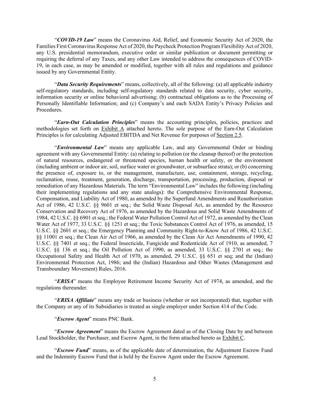 5 “COVID-19 Law” means the Coronavirus Aid, Relief, and Economic Security Act of 2020, the Families First Coronavirus Response Act of 2020, the Paycheck Protection Program Flexibility Act of 2020, any U.S. presidential memorandum, executive order or similar publication or document permitting or requiring the deferral of any Taxes, and any other Law intended to address the consequences of COVID- 19, in each case, as may be amended or modified, together with all rules and regulations and guidance issued by any Governmental Entity. “Data Security Requirements” means, collectively, all of the following: (a) all applicable industry self-regulatory standards, including self-regulatory standards related to data security, cyber security, information security or online behavioral advertising; (b) contractual obligations as to the Processing of Personally Identifiable Information; and (c) Company’s and each SADA Entity’s Privacy Policies and Procedures. “Earn-Out Calculation Principles” means the accounting principles, policies, practices and methodologies set forth on Exhibit A attached hereto. The sole purpose of the Earn-Out Calculation Principles is for calculating Adjusted EBITDA and Net Revenue for purposes of Section 2.5. “Environmental Law” means any applicable Law, and any Governmental Order or binding agreement with any Governmental Entity: (a) relating to pollution (or the cleanup thereof) or the protection of natural resources, endangered or threatened species, human health or safety, or the environment (including ambient or indoor air, soil, surface water or groundwater, or subsurface strata); or (b) concerning the presence of, exposure to, or the management, manufacture, use, containment, storage, recycling, reclamation, reuse, treatment, generation, discharge, transportation, processing, production, disposal or remediation of any Hazardous Materials. The term “Environmental Law” includes the following (including their implementing regulations and any state analogs): the Comprehensive Environmental Response, Compensation, and Liability Act of 1980, as amended by the Superfund Amendments and Reauthorization Act of 1986, 42 U.S.C. §§ 9601 et seq.; the Solid Waste Disposal Act, as amended by the Resource Conservation and Recovery Act of 1976, as amended by the Hazardous and Solid Waste Amendments of 1984, 42 U.S.C. §§ 6901 et seq.; the Federal Water Pollution Control Act of 1972, as amended by the Clean Water Act of 1977, 33 U.S.C. §§ 1251 et seq.; the Toxic Substances Control Act of 1976, as amended, 15 U.S.C. §§ 2601 et seq.; the Emergency Planning and Community Right-to-Know Act of 1986, 42 U.S.C. §§ 11001 et seq.; the Clean Air Act of 1966, as amended by the Clean Air Act Amendments of 1990, 42 U.S.C. §§ 7401 et seq.; the Federal Insecticide, Fungicide and Rodenticide Act of 1910, as amended, 7 U.S.C. §§ 136 et seq.; the Oil Pollution Act of 1990, as amended, 33 U.S.C. §§ 2701 et seq.; the Occupational Safety and Health Act of 1970, as amended, 29 U.S.C. §§ 651 et seq; and the (Indian) Environmental Protection Act, 1986; and the (Indian) Hazardous and Other Wastes (Management and Transboundary Movement) Rules, 2016. “ERISA” means the Employee Retirement Income Security Act of 1974, as amended, and the regulations thereunder. “ERISA Affiliate” means any trade or business (whether or not incorporated) that, together with the Company or any of its Subsidiaries is treated as single employer under Section 414 of the Code. “Escrow Agent” means PNC Bank. “Escrow Agreement” means the Escrow Agreement dated as of the Closing Date by and between Lead Stockholder, the Purchaser, and Escrow Agent, in the form attached hereto as Exhibit C. “Escrow Fund” means, as of the applicable date of determination, the Adjustment Escrow Fund and the Indemnity Escrow Fund that is held by the Escrow Agent under the Escrow Agreement.