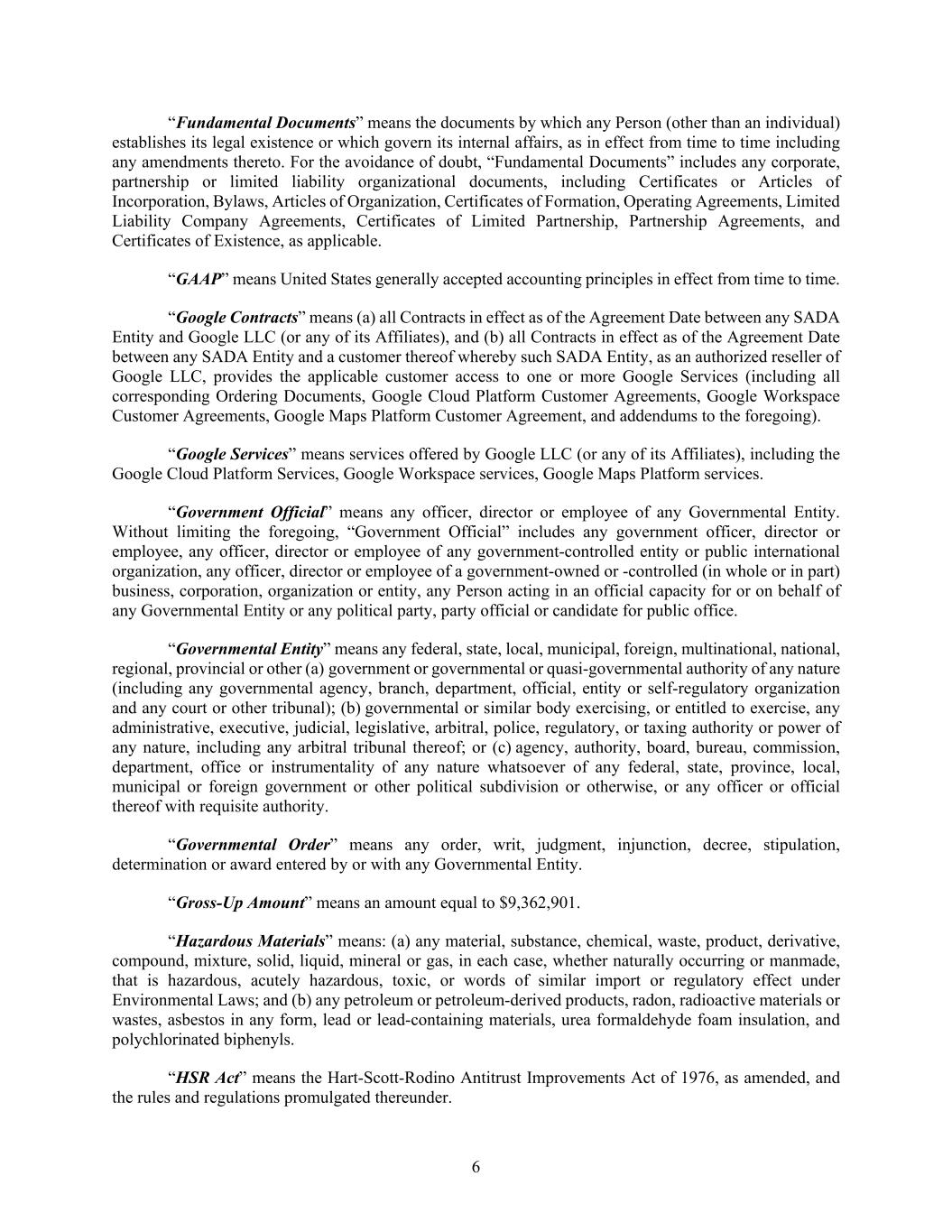 6 “Fundamental Documents” means the documents by which any Person (other than an individual) establishes its legal existence or which govern its internal affairs, as in effect from time to time including any amendments thereto. For the avoidance of doubt, “Fundamental Documents” includes any corporate, partnership or limited liability organizational documents, including Certificates or Articles of Incorporation, Bylaws, Articles of Organization, Certificates of Formation, Operating Agreements, Limited Liability Company Agreements, Certificates of Limited Partnership, Partnership Agreements, and Certificates of Existence, as applicable. “GAAP” means United States generally accepted accounting principles in effect from time to time. “Google Contracts” means (a) all Contracts in effect as of the Agreement Date between any SADA Entity and Google LLC (or any of its Affiliates), and (b) all Contracts in effect as of the Agreement Date between any SADA Entity and a customer thereof whereby such SADA Entity, as an authorized reseller of Google LLC, provides the applicable customer access to one or more Google Services (including all corresponding Ordering Documents, Google Cloud Platform Customer Agreements, Google Workspace Customer Agreements, Google Maps Platform Customer Agreement, and addendums to the foregoing). “Google Services” means services offered by Google LLC (or any of its Affiliates), including the Google Cloud Platform Services, Google Workspace services, Google Maps Platform services. “Government Official” means any officer, director or employee of any Governmental Entity. Without limiting the foregoing, “Government Official” includes any government officer, director or employee, any officer, director or employee of any government-controlled entity or public international organization, any officer, director or employee of a government-owned or -controlled (in whole or in part) business, corporation, organization or entity, any Person acting in an official capacity for or on behalf of any Governmental Entity or any political party, party official or candidate for public office. “Governmental Entity” means any federal, state, local, municipal, foreign, multinational, national, regional, provincial or other (a) government or governmental or quasi-governmental authority of any nature (including any governmental agency, branch, department, official, entity or self-regulatory organization and any court or other tribunal); (b) governmental or similar body exercising, or entitled to exercise, any administrative, executive, judicial, legislative, arbitral, police, regulatory, or taxing authority or power of any nature, including any arbitral tribunal thereof; or (c) agency, authority, board, bureau, commission, department, office or instrumentality of any nature whatsoever of any federal, state, province, local, municipal or foreign government or other political subdivision or otherwise, or any officer or official thereof with requisite authority. “Governmental Order” means any order, writ, judgment, injunction, decree, stipulation, determination or award entered by or with any Governmental Entity. “Gross-Up Amount” means an amount equal to $9,362,901. “Hazardous Materials” means: (a) any material, substance, chemical, waste, product, derivative, compound, mixture, solid, liquid, mineral or gas, in each case, whether naturally occurring or manmade, that is hazardous, acutely hazardous, toxic, or words of similar import or regulatory effect under Environmental Laws; and (b) any petroleum or petroleum-derived products, radon, radioactive materials or wastes, asbestos in any form, lead or lead-containing materials, urea formaldehyde foam insulation, and polychlorinated biphenyls. “HSR Act” means the Hart-Scott-Rodino Antitrust Improvements Act of 1976, as amended, and the rules and regulations promulgated thereunder.
