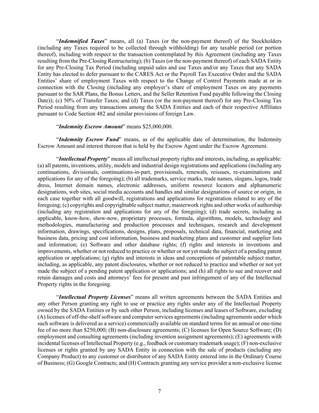 7 “Indemnified Taxes” means, all (a) Taxes (or the non-payment thereof) of the Stockholders (including any Taxes required to be collected through withholding) for any taxable period (or portion thereof), including with respect to the transaction contemplated by this Agreement (including any Taxes resulting from the Pre-Closing Restructuring); (b) Taxes (or the non-payment thereof) of each SADA Entity for any Pre-Closing Tax Period (including unpaid sales and use Taxes and/or any Taxes that any SADA Entity has elected to defer pursuant to the CARES Act or the Payroll Tax Executive Order and the SADA Entities’ share of employment Taxes with respect to the Change of Control Payments made at or in connection with the Closing (including any employer’s share of employment Taxes on any payments pursuant to the SAR Plans, the Bonus Letters, and the Seller Retention Fund payable following the Closing Date)); (c) 50% of Transfer Taxes; and (d) Taxes (or the non-payment thereof) for any Pre-Closing Tax Period resulting from any transactions among the SADA Entities and each of their respective Affiliates pursuant to Code Section 482 and similar provisions of foreign Law. “Indemnity Escrow Amount” means $25,000,000. “Indemnity Escrow Fund” means, as of the applicable date of determination, the Indemnity Escrow Amount and interest thereon that is held by the Escrow Agent under the Escrow Agreement. “Intellectual Property” means all intellectual property rights and interests, including, as applicable: (a) all patents, inventions, utility, models and industrial design registrations and applications (including any continuations, divisionals, continuations-in-part, provisionals, renewals, reissues, re-examinations and applications for any of the foregoing); (b) all trademarks, service marks, trade names, slogans, logos, trade dress, Internet domain names, electronic addresses, uniform resource locators and alphanumeric designations, web sites, social media accounts and handles and similar designations of source or origin, in each case together with all goodwill, registrations and applications for registration related to any of the foregoing; (c) copyrights and copyrightable subject matter, masterwork rights and other works of authorship (including any registration and applications for any of the foregoing); (d) trade secrets, including as applicable, know-how, show-now, proprietary processes, formula, algorithms, models, technology and methodologies, manufacturing and production processes and techniques, research and development information, drawings, specifications, designs, plans, proposals, technical data, financial, marketing and business data, pricing and cost information, business and marketing plans and customer and supplier lists and information; (e) Software and other database rights; (f) rights and interests in inventions and improvements, whether or not reduced to practice or whether or not yet made the subject of a pending patent application or applications; (g) rights and interests in ideas and conceptions of patentable subject matter, including, as applicable, any patent disclosures, whether or not reduced to practice and whether or not yet made the subject of a pending patent application or applications; and (h) all rights to sue and recover and retain damages and costs and attorneys’ fees for present and past infringement of any of the Intellectual Property rights in the foregoing. “Intellectual Property Licenses” means all written agreements between the SADA Entities and any other Person granting any right to use or practice any rights under any of the Intellectual Property owned by the SADA Entities or by such other Person, including licenses and leases of Software, excluding (A) licenses of off-the-shelf software and computer services agreements (including agreements under which such software is delivered as a service) commercially available on standard terms for an annual or one-time fee of no more than $250,000; (B) non-disclosure agreements; (C) licenses for Open Source Software; (D) employment and consulting agreements (including invention assignment agreements); (E) agreements with incidental licenses of Intellectual Property (e.g., feedback or customary trademark usage); (F) non-exclusive licenses or rights granted by any SADA Entity in connection with the sale of products (including any Company Product) to any customer or distributor of any SADA Entity entered into in the Ordinary Course of Business; (G) Google Contracts; and (H) Contracts granting any service provider a non-exclusive license