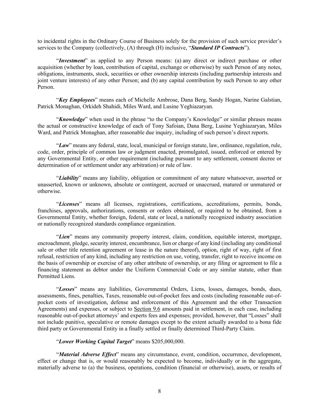 8 to incidental rights in the Ordinary Course of Business solely for the provision of such service provider’s services to the Company (collectively, (A) through (H) inclusive, “Standard IP Contracts”). “Investment” as applied to any Person means: (a) any direct or indirect purchase or other acquisition (whether by loan, contribution of capital, exchange or otherwise) by such Person of any notes, obligations, instruments, stock, securities or other ownership interests (including partnership interests and joint venture interests) of any other Person; and (b) any capital contribution by such Person to any other Person. “Key Employees” means each of Michelle Ambrose, Dana Berg, Sandy Hogan, Narine Galstian, Patrick Monaghan, Orkideh Shahidi, Miles Ward, and Lusine Yeghiazaryan. “Knowledge” when used in the phrase “to the Company’s Knowledge” or similar phrases means the actual or constructive knowledge of each of Tony Safoian, Dana Berg, Lusine Yeghiazaryan, Miles Ward, and Patrick Monaghan, after reasonable due inquiry, including of such person’s direct reports. “Law” means any federal, state, local, municipal or foreign statute, law, ordinance, regulation, rule, code, order, principle of common law or judgment enacted, promulgated, issued, enforced or entered by any Governmental Entity, or other requirement (including pursuant to any settlement, consent decree or determination of or settlement under any arbitration) or rule of law. “Liability” means any liability, obligation or commitment of any nature whatsoever, asserted or unasserted, known or unknown, absolute or contingent, accrued or unaccrued, matured or unmatured or otherwise. “Licenses” means all licenses, registrations, certifications, accreditations, permits, bonds, franchises, approvals, authorizations, consents or orders obtained, or required to be obtained, from a Governmental Entity, whether foreign, federal, state or local, a nationally recognized industry association or nationally recognized standards compliance organization. “Lien” means any community property interest, claim, condition, equitable interest, mortgage, encroachment, pledge, security interest, encumbrance, lien or charge of any kind (including any conditional sale or other title retention agreement or lease in the nature thereof), option, right of way, right of first refusal, restriction of any kind, including any restriction on use, voting, transfer, right to receive income on the basis of ownership or exercise of any other attribute of ownership, or any filing or agreement to file a financing statement as debtor under the Uniform Commercial Code or any similar statute, other than Permitted Liens. “Losses” means any liabilities, Governmental Orders, Liens, losses, damages, bonds, dues, assessments, fines, penalties, Taxes, reasonable out-of-pocket fees and costs (including reasonable out-of- pocket costs of investigation, defense and enforcement of this Agreement and the other Transaction Agreements) and expenses, or subject to Section 9.6 amounts paid in settlement, in each case, including reasonable out-of-pocket attorneys’ and experts fees and expenses; provided, however, that “Losses” shall not include punitive, speculative or remote damages except to the extent actually awarded to a bona fide third party or Governmental Entity in a finally settled or finally determined Third-Party Claim. “Lower Working Capital Target” means $205,000,000. “Material Adverse Effect” means any circumstance, event, condition, occurrence, development, effect or change that is, or would reasonably be expected to become, individually or in the aggregate, materially adverse to (a) the business, operations, condition (financial or otherwise), assets, or results of