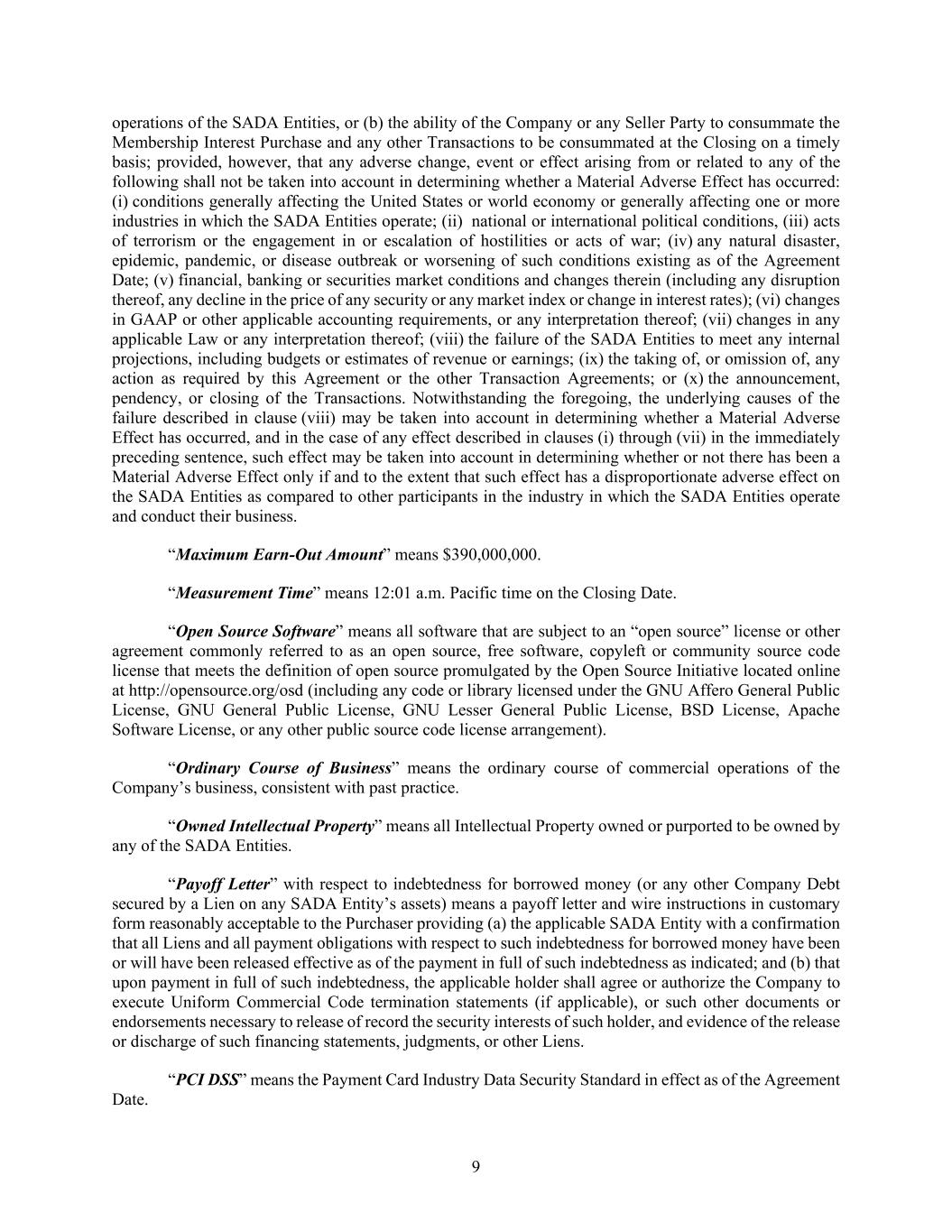9 operations of the SADA Entities, or (b) the ability of the Company or any Seller Party to consummate the Membership Interest Purchase and any other Transactions to be consummated at the Closing on a timely basis; provided, however, that any adverse change, event or effect arising from or related to any of the following shall not be taken into account in determining whether a Material Adverse Effect has occurred: (i) conditions generally affecting the United States or world economy or generally affecting one or more industries in which the SADA Entities operate; (ii) national or international political conditions, (iii) acts of terrorism or the engagement in or escalation of hostilities or acts of war; (iv) any natural disaster, epidemic, pandemic, or disease outbreak or worsening of such conditions existing as of the Agreement Date; (v) financial, banking or securities market conditions and changes therein (including any disruption thereof, any decline in the price of any security or any market index or change in interest rates); (vi) changes in GAAP or other applicable accounting requirements, or any interpretation thereof; (vii) changes in any applicable Law or any interpretation thereof; (viii) the failure of the SADA Entities to meet any internal projections, including budgets or estimates of revenue or earnings; (ix) the taking of, or omission of, any action as required by this Agreement or the other Transaction Agreements; or (x) the announcement, pendency, or closing of the Transactions. Notwithstanding the foregoing, the underlying causes of the failure described in clause (viii) may be taken into account in determining whether a Material Adverse Effect has occurred, and in the case of any effect described in clauses (i) through (vii) in the immediately preceding sentence, such effect may be taken into account in determining whether or not there has been a Material Adverse Effect only if and to the extent that such effect has a disproportionate adverse effect on the SADA Entities as compared to other participants in the industry in which the SADA Entities operate and conduct their business. “Maximum Earn-Out Amount” means $390,000,000. “Measurement Time” means 12:01 a.m. Pacific time on the Closing Date. “Open Source Software” means all software that are subject to an “open source” license or other agreement commonly referred to as an open source, free software, copyleft or community source code license that meets the definition of open source promulgated by the Open Source Initiative located online at http://opensource.org/osd (including any code or library licensed under the GNU Affero General Public License, GNU General Public License, GNU Lesser General Public License, BSD License, Apache Software License, or any other public source code license arrangement). “Ordinary Course of Business” means the ordinary course of commercial operations of the Company’s business, consistent with past practice. “Owned Intellectual Property” means all Intellectual Property owned or purported to be owned by any of the SADA Entities. “Payoff Letter” with respect to indebtedness for borrowed money (or any other Company Debt secured by a Lien on any SADA Entity’s assets) means a payoff letter and wire instructions in customary form reasonably acceptable to the Purchaser providing (a) the applicable SADA Entity with a confirmation that all Liens and all payment obligations with respect to such indebtedness for borrowed money have been or will have been released effective as of the payment in full of such indebtedness as indicated; and (b) that upon payment in full of such indebtedness, the applicable holder shall agree or authorize the Company to execute Uniform Commercial Code termination statements (if applicable), or such other documents or endorsements necessary to release of record the security interests of such holder, and evidence of the release or discharge of such financing statements, judgments, or other Liens. “PCI DSS” means the Payment Card Industry Data Security Standard in effect as of the Agreement Date.