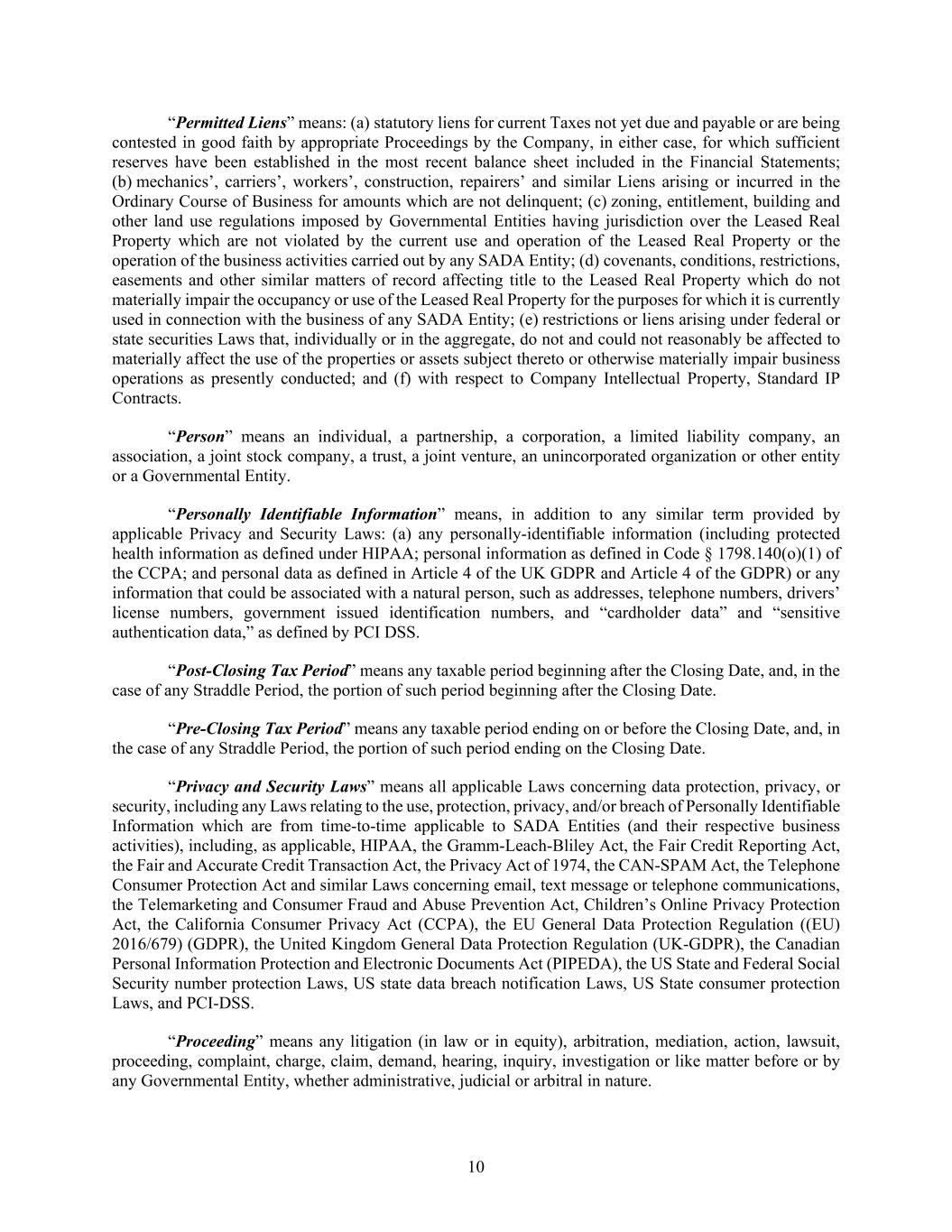 10 “Permitted Liens” means: (a) statutory liens for current Taxes not yet due and payable or are being contested in good faith by appropriate Proceedings by the Company, in either case, for which sufficient reserves have been established in the most recent balance sheet included in the Financial Statements; (b) mechanics’, carriers’, workers’, construction, repairers’ and similar Liens arising or incurred in the Ordinary Course of Business for amounts which are not delinquent; (c) zoning, entitlement, building and other land use regulations imposed by Governmental Entities having jurisdiction over the Leased Real Property which are not violated by the current use and operation of the Leased Real Property or the operation of the business activities carried out by any SADA Entity; (d) covenants, conditions, restrictions, easements and other similar matters of record affecting title to the Leased Real Property which do not materially impair the occupancy or use of the Leased Real Property for the purposes for which it is currently used in connection with the business of any SADA Entity; (e) restrictions or liens arising under federal or state securities Laws that, individually or in the aggregate, do not and could not reasonably be affected to materially affect the use of the properties or assets subject thereto or otherwise materially impair business operations as presently conducted; and (f) with respect to Company Intellectual Property, Standard IP Contracts. “Person” means an individual, a partnership, a corporation, a limited liability company, an association, a joint stock company, a trust, a joint venture, an unincorporated organization or other entity or a Governmental Entity. “Personally Identifiable Information” means, in addition to any similar term provided by applicable Privacy and Security Laws: (a) any personally-identifiable information (including protected health information as defined under HIPAA; personal information as defined in Code § 1798.140(o)(1) of the CCPA; and personal data as defined in Article 4 of the UK GDPR and Article 4 of the GDPR) or any information that could be associated with a natural person, such as addresses, telephone numbers, drivers’ license numbers, government issued identification numbers, and “cardholder data” and “sensitive authentication data,” as defined by PCI DSS. “Post-Closing Tax Period” means any taxable period beginning after the Closing Date, and, in the case of any Straddle Period, the portion of such period beginning after the Closing Date. “Pre-Closing Tax Period” means any taxable period ending on or before the Closing Date, and, in the case of any Straddle Period, the portion of such period ending on the Closing Date. “Privacy and Security Laws” means all applicable Laws concerning data protection, privacy, or security, including any Laws relating to the use, protection, privacy, and/or breach of Personally Identifiable Information which are from time-to-time applicable to SADA Entities (and their respective business activities), including, as applicable, HIPAA, the Gramm-Leach-Bliley Act, the Fair Credit Reporting Act, the Fair and Accurate Credit Transaction Act, the Privacy Act of 1974, the CAN-SPAM Act, the Telephone Consumer Protection Act and similar Laws concerning email, text message or telephone communications, the Telemarketing and Consumer Fraud and Abuse Prevention Act, Children’s Online Privacy Protection Act, the California Consumer Privacy Act (CCPA), the EU General Data Protection Regulation ((EU) 2016/679) (GDPR), the United Kingdom General Data Protection Regulation (UK-GDPR), the Canadian Personal Information Protection and Electronic Documents Act (PIPEDA), the US State and Federal Social Security number protection Laws, US state data breach notification Laws, US State consumer protection Laws, and PCI-DSS. “Proceeding” means any litigation (in law or in equity), arbitration, mediation, action, lawsuit, proceeding, complaint, charge, claim, demand, hearing, inquiry, investigation or like matter before or by any Governmental Entity, whether administrative, judicial or arbitral in nature.