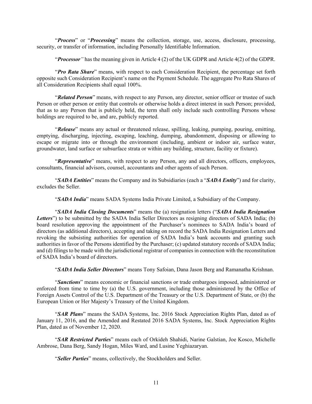 11 “Process” or “Processing” means the collection, storage, use, access, disclosure, processing, security, or transfer of information, including Personally Identifiable Information. “Processor” has the meaning given in Article 4 (2) of the UK GDPR and Article 4(2) of the GDPR. “Pro Rata Share” means, with respect to each Consideration Recipient, the percentage set forth opposite such Consideration Recipient’s name on the Payment Schedule. The aggregate Pro Rata Shares of all Consideration Recipients shall equal 100%. “Related Person” means, with respect to any Person, any director, senior officer or trustee of such Person or other person or entity that controls or otherwise holds a direct interest in such Person; provided, that as to any Person that is publicly held, the term shall only include such controlling Persons whose holdings are required to be, and are, publicly reported. “Release” means any actual or threatened release, spilling, leaking, pumping, pouring, emitting, emptying, discharging, injecting, escaping, leaching, dumping, abandonment, disposing or allowing to escape or migrate into or through the environment (including, ambient or indoor air, surface water, groundwater, land surface or subsurface strata or within any building, structure, facility or fixture). “Representative” means, with respect to any Person, any and all directors, officers, employees, consultants, financial advisors, counsel, accountants and other agents of such Person. “SADA Entities” means the Company and its Subsidiaries (each a “SADA Entity”) and for clarity, excludes the Seller. “SADA India” means SADA Systems India Private Limited, a Subsidiary of the Company. “SADA India Closing Documents” means the (a) resignation letters (“SADA India Resignation Letters”) to be submitted by the SADA India Seller Directors as resigning directors of SADA India; (b) board resolution approving the appointment of the Purchaser’s nominees to SADA India’s board of directors (as additional directors), accepting and taking on record the SADA India Resignation Letters and revoking the subsisting authorities for operation of SADA India’s bank accounts and granting such authorities in favor of the Persons identified by the Purchaser; (c) updated statutory records of SADA India; and (d) filings to be made with the jurisdictional registrar of companies in connection with the reconstitution of SADA India’s board of directors. “SADA India Seller Directors” means Tony Safoian, Dana Jason Berg and Ramanatha Krishnan. “Sanctions” means economic or financial sanctions or trade embargoes imposed, administered or enforced from time to time by (a) the U.S. government, including those administered by the Office of Foreign Assets Control of the U.S. Department of the Treasury or the U.S. Department of State, or (b) the European Union or Her Majesty’s Treasury of the United Kingdom. “SAR Plans” means the SADA Systems, Inc. 2016 Stock Appreciation Rights Plan, dated as of January 11, 2016, and the Amended and Restated 2016 SADA Systems, Inc. Stock Appreciation Rights Plan, dated as of November 12, 2020. “SAR Restricted Parties” means each of Orkideh Shahidi, Narine Galstian, Joe Kosco, Michelle Ambrose, Dana Berg, Sandy Hogan, Miles Ward, and Lusine Yeghiazaryan. “Seller Parties” means, collectively, the Stockholders and Seller.