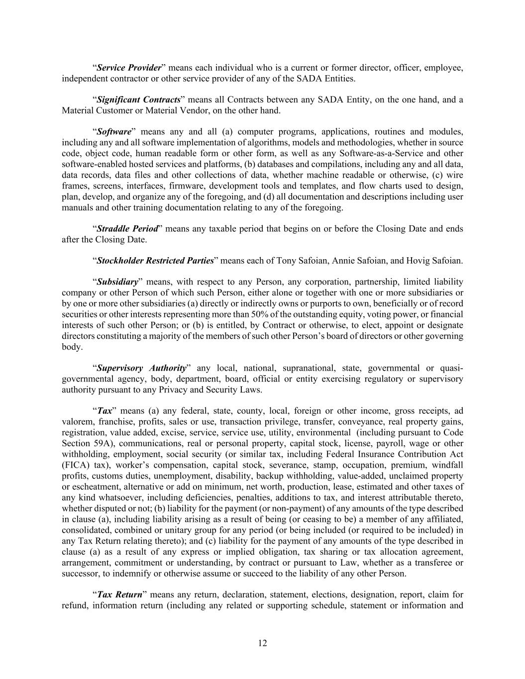 12 “Service Provider” means each individual who is a current or former director, officer, employee, independent contractor or other service provider of any of the SADA Entities. “Significant Contracts” means all Contracts between any SADA Entity, on the one hand, and a Material Customer or Material Vendor, on the other hand. “Software” means any and all (a) computer programs, applications, routines and modules, including any and all software implementation of algorithms, models and methodologies, whether in source code, object code, human readable form or other form, as well as any Software-as-a-Service and other software-enabled hosted services and platforms, (b) databases and compilations, including any and all data, data records, data files and other collections of data, whether machine readable or otherwise, (c) wire frames, screens, interfaces, firmware, development tools and templates, and flow charts used to design, plan, develop, and organize any of the foregoing, and (d) all documentation and descriptions including user manuals and other training documentation relating to any of the foregoing. “Straddle Period” means any taxable period that begins on or before the Closing Date and ends after the Closing Date. “Stockholder Restricted Parties” means each of Tony Safoian, Annie Safoian, and Hovig Safoian. “Subsidiary” means, with respect to any Person, any corporation, partnership, limited liability company or other Person of which such Person, either alone or together with one or more subsidiaries or by one or more other subsidiaries (a) directly or indirectly owns or purports to own, beneficially or of record securities or other interests representing more than 50% of the outstanding equity, voting power, or financial interests of such other Person; or (b) is entitled, by Contract or otherwise, to elect, appoint or designate directors constituting a majority of the members of such other Person’s board of directors or other governing body. “Supervisory Authority” any local, national, supranational, state, governmental or quasi- governmental agency, body, department, board, official or entity exercising regulatory or supervisory authority pursuant to any Privacy and Security Laws. “Tax” means (a) any federal, state, county, local, foreign or other income, gross receipts, ad valorem, franchise, profits, sales or use, transaction privilege, transfer, conveyance, real property gains, registration, value added, excise, service, service use, utility, environmental (including pursuant to Code Section 59A), communications, real or personal property, capital stock, license, payroll, wage or other withholding, employment, social security (or similar tax, including Federal Insurance Contribution Act (FICA) tax), worker’s compensation, capital stock, severance, stamp, occupation, premium, windfall profits, customs duties, unemployment, disability, backup withholding, value-added, unclaimed property or escheatment, alternative or add on minimum, net worth, production, lease, estimated and other taxes of any kind whatsoever, including deficiencies, penalties, additions to tax, and interest attributable thereto, whether disputed or not; (b) liability for the payment (or non-payment) of any amounts of the type described in clause (a), including liability arising as a result of being (or ceasing to be) a member of any affiliated, consolidated, combined or unitary group for any period (or being included (or required to be included) in any Tax Return relating thereto); and (c) liability for the payment of any amounts of the type described in clause (a) as a result of any express or implied obligation, tax sharing or tax allocation agreement, arrangement, commitment or understanding, by contract or pursuant to Law, whether as a transferee or successor, to indemnify or otherwise assume or succeed to the liability of any other Person. “Tax Return” means any return, declaration, statement, elections, designation, report, claim for refund, information return (including any related or supporting schedule, statement or information and