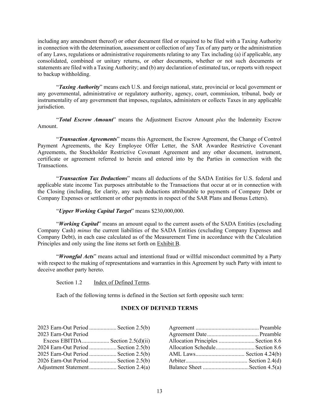 13 including any amendment thereof) or other document filed or required to be filed with a Taxing Authority in connection with the determination, assessment or collection of any Tax of any party or the administration of any Laws, regulations or administrative requirements relating to any Tax including (a) if applicable, any consolidated, combined or unitary returns, or other documents, whether or not such documents or statements are filed with a Taxing Authority; and (b) any declaration of estimated tax, or reports with respect to backup withholding. “Taxing Authority” means each U.S. and foreign national, state, provincial or local government or any governmental, administrative or regulatory authority, agency, court, commission, tribunal, body or instrumentality of any government that imposes, regulates, administers or collects Taxes in any applicable jurisdiction. “Total Escrow Amount” means the Adjustment Escrow Amount plus the Indemnity Escrow Amount. “Transaction Agreements” means this Agreement, the Escrow Agreement, the Change of Control Payment Agreements, the Key Employee Offer Letter, the SAR Awardee Restrictive Covenant Agreements, the Stockholder Restrictive Covenant Agreement and any other document, instrument, certificate or agreement referred to herein and entered into by the Parties in connection with the Transactions. “Transaction Tax Deductions” means all deductions of the SADA Entities for U.S. federal and applicable state income Tax purposes attributable to the Transactions that occur at or in connection with the Closing (including, for clarity, any such deductions attributable to payments of Company Debt or Company Expenses or settlement or other payments in respect of the SAR Plans and Bonus Letters). “Upper Working Capital Target” means $230,000,000. “Working Capital” means an amount equal to the current assets of the SADA Entities (excluding Company Cash) minus the current liabilities of the SADA Entities (excluding Company Expenses and Company Debt), in each case calculated as of the Measurement Time in accordance with the Calculation Principles and only using the line items set forth on Exhibit B. “Wrongful Acts” means actual and intentional fraud or willful misconduct committed by a Party with respect to the making of representations and warranties in this Agreement by such Party with intent to deceive another party hereto. Section 1.2 Index of Defined Terms. Each of the following terms is defined in the Section set forth opposite such term: INDEX OF DEFINED TERMS 2023 Earn-Out Period ................... Section 2.5(b) 2023 Earn-Out Period Excess EBITDA ................... Section 2.5(d)(ii) 2024 Earn-Out Period ................... Section 2.5(b) 2025 Earn-Out Period ................... Section 2.5(b) 2026 Earn-Out Period ................... Section 2.5(b) Adjustment Statement ................... Section 2.4(a) Agreement ............................................ Preamble Agreement Date .................................... Preamble Allocation Principles ......................... Section 8.6 Allocation Schedule ........................... Section 8.6 AML Laws .................................. Section 4.24(b) Arbiter ........................................... Section 2.4(d) Balance Sheet ................................ Section 4.5(a)