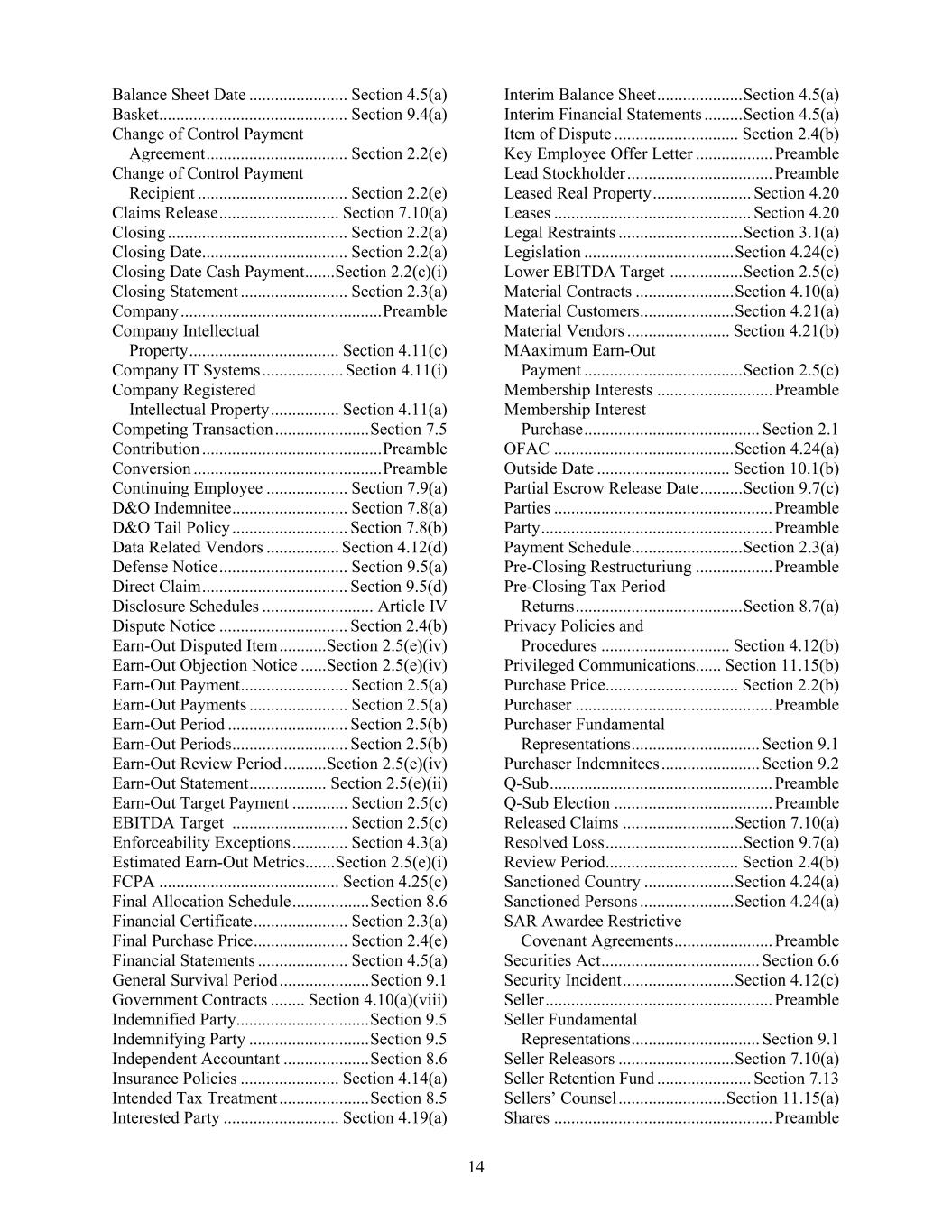 14 Balance Sheet Date ....................... Section 4.5(a) Basket ............................................ Section 9.4(a) Change of Control Payment Agreement ................................. Section 2.2(e) Change of Control Payment Recipient ................................... Section 2.2(e) Claims Release ............................ Section 7.10(a) Closing .......................................... Section 2.2(a) Closing Date.................................. Section 2.2(a) Closing Date Cash Payment ....... Section 2.2(c)(i) Closing Statement ......................... Section 2.3(a) Company ............................................... Preamble Company Intellectual Property ................................... Section 4.11(c) Company IT Systems ................... Section 4.11(i) Company Registered Intellectual Property ................ Section 4.11(a) Competing Transaction ...................... Section 7.5 Contribution .......................................... Preamble Conversion ............................................ Preamble Continuing Employee ................... Section 7.9(a) D&O Indemnitee ........................... Section 7.8(a) D&O Tail Policy ........................... Section 7.8(b) Data Related Vendors ................. Section 4.12(d) Defense Notice .............................. Section 9.5(a) Direct Claim .................................. Section 9.5(d) Disclosure Schedules .......................... Article IV Dispute Notice .............................. Section 2.4(b) Earn-Out Disputed Item ........... Section 2.5(e)(iv) Earn-Out Objection Notice ...... Section 2.5(e)(iv) Earn-Out Payment ......................... Section 2.5(a) Earn-Out Payments ....................... Section 2.5(a) Earn-Out Period ............................ Section 2.5(b) Earn-Out Periods ........................... Section 2.5(b) Earn-Out Review Period .......... Section 2.5(e)(iv) Earn-Out Statement .................. Section 2.5(e)(ii) Earn-Out Target Payment ............. Section 2.5(c) EBITDA Target ........................... Section 2.5(c) Enforceability Exceptions ............. Section 4.3(a) Estimated Earn-Out Metrics....... Section 2.5(e)(i) FCPA .......................................... Section 4.25(c) Final Allocation Schedule .................. Section 8.6 Financial Certificate ...................... Section 2.3(a) Final Purchase Price ...................... Section 2.4(e) Financial Statements ..................... Section 4.5(a) General Survival Period ..................... Section 9.1 Government Contracts ........ Section 4.10(a)(viii) Indemnified Party ............................... Section 9.5 Indemnifying Party ............................ Section 9.5 Independent Accountant .................... Section 8.6 Insurance Policies ....................... Section 4.14(a) Intended Tax Treatment ..................... Section 8.5 Interested Party ........................... Section 4.19(a) Interim Balance Sheet .................... Section 4.5(a) Interim Financial Statements ......... Section 4.5(a) Item of Dispute ............................. Section 2.4(b) Key Employee Offer Letter .................. Preamble Lead Stockholder .................................. Preamble Leased Real Property ....................... Section 4.20 Leases .............................................. Section 4.20 Legal Restraints ............................. Section 3.1(a) Legislation ................................... Section 4.24(c) Lower EBITDA Target ................. Section 2.5(c) Material Contracts ....................... Section 4.10(a) Material Customers ...................... Section 4.21(a) Material Vendors ........................ Section 4.21(b) MAaximum Earn-Out Payment ..................................... Section 2.5(c) Membership Interests ........................... Preamble Membership Interest Purchase ......................................... Section 2.1 OFAC .......................................... Section 4.24(a) Outside Date ............................... Section 10.1(b) Partial Escrow Release Date .......... Section 9.7(c) Parties ................................................... Preamble Party ...................................................... Preamble Payment Schedule .......................... Section 2.3(a) Pre-Closing Restructuriung .................. Preamble Pre-Closing Tax Period Returns ....................................... Section 8.7(a) Privacy Policies and Procedures .............................. Section 4.12(b) Privileged Communications ...... Section 11.15(b) Purchase Price ............................... Section 2.2(b) Purchaser .............................................. Preamble Purchaser Fundamental Representations .............................. Section 9.1 Purchaser Indemnitees ....................... Section 9.2 Q-Sub .................................................... Preamble Q-Sub Election ..................................... Preamble Released Claims .......................... Section 7.10(a) Resolved Loss ................................ Section 9.7(a) Review Period ............................... Section 2.4(b) Sanctioned Country ..................... Section 4.24(a) Sanctioned Persons ...................... Section 4.24(a) SAR Awardee Restrictive Covenant Agreements ....................... Preamble Securities Act ..................................... Section 6.6 Security Incident .......................... Section 4.12(c) Seller ..................................................... Preamble Seller Fundamental Representations .............................. Section 9.1 Seller Releasors ........................... Section 7.10(a) Seller Retention Fund ...................... Section 7.13 Sellers’ Counsel ......................... Section 11.15(a) Shares ................................................... Preamble