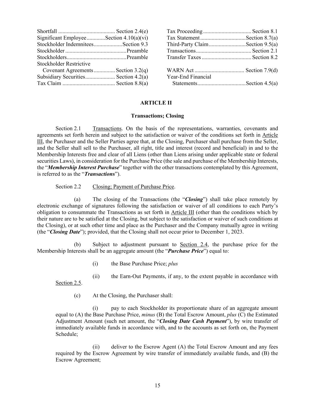 15 Shortfall ........................................ Section 2.4(e) Significant Employee ............. Section 4.10(a)(vi) Stockholder Indemnitees .................... Section 9.3 Stockholder ........................................... Preamble Stockholders .......................................... Preamble Stockholder Restrictive Covenant Agreements ............... Section 3.2(q) Subsidiary Securities ..................... Section 4.2(a) Tax Claim ..................................... Section 8.8(a) Tax Proceeding .................................. Section 8.1 Tax Statement ................................ Section 8.7(a) Third-Party Claim .......................... Section 9.5(a) Transactions ....................................... Section 2.1 Transfer Taxes ................................... Section 8.2 WARN Act ................................... Section 7.9(d) Year-End Financial Statements .................................. Section 4.5(a) ARTICLE II Transactions; Closing Section 2.1 Transactions. On the basis of the representations, warranties, covenants and agreements set forth herein and subject to the satisfaction or waiver of the conditions set forth in Article III, the Purchaser and the Seller Parties agree that, at the Closing, Purchaser shall purchase from the Seller, and the Seller shall sell to the Purchaser, all right, title and interest (record and beneficial) in and to the Membership Interests free and clear of all Liens (other than Liens arising under applicable state or federal securities Laws), in consideration for the Purchase Price (the sale and purchase of the Membership Interests, the “Membership Interest Purchase” together with the other transactions contemplated by this Agreement, is referred to as the “Transactions”). Section 2.2 Closing; Payment of Purchase Price. (a) The closing of the Transactions (the “Closing”) shall take place remotely by electronic exchange of signatures following the satisfaction or waiver of all conditions to each Party’s obligation to consummate the Transactions as set forth in Article III (other than the conditions which by their nature are to be satisfied at the Closing, but subject to the satisfaction or waiver of such conditions at the Closing), or at such other time and place as the Purchaser and the Company mutually agree in writing (the “Closing Date”); provided, that the Closing shall not occur prior to December 1, 2023. (b) Subject to adjustment pursuant to Section 2.4, the purchase price for the Membership Interests shall be an aggregate amount (the “Purchase Price”) equal to: (i) the Base Purchase Price; plus (ii) the Earn-Out Payments, if any, to the extent payable in accordance with Section 2.5. (c) At the Closing, the Purchaser shall: (i) pay to each Stockholder its proportionate share of an aggregate amount equal to (A) the Base Purchase Price, minus (B) the Total Escrow Amount, plus (C) the Estimated Adjustment Amount (such net amount, the “Closing Date Cash Payment”), by wire transfer of immediately available funds in accordance with, and to the accounts as set forth on, the Payment Schedule; (ii) deliver to the Escrow Agent (A) the Total Escrow Amount and any fees required by the Escrow Agreement by wire transfer of immediately available funds, and (B) the Escrow Agreement;