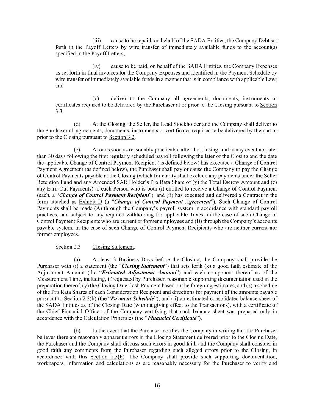 16 (iii) cause to be repaid, on behalf of the SADA Entities, the Company Debt set forth in the Payoff Letters by wire transfer of immediately available funds to the account(s) specified in the Payoff Letters; (iv) cause to be paid, on behalf of the SADA Entities, the Company Expenses as set forth in final invoices for the Company Expenses and identified in the Payment Schedule by wire transfer of immediately available funds in a manner that is in compliance with applicable Law; and (v) deliver to the Company all agreements, documents, instruments or certificates required to be delivered by the Purchaser at or prior to the Closing pursuant to Section 3.3. (d) At the Closing, the Seller, the Lead Stockholder and the Company shall deliver to the Purchaser all agreements, documents, instruments or certificates required to be delivered by them at or prior to the Closing pursuant to Section 3.2. (e) At or as soon as reasonably practicable after the Closing, and in any event not later than 30 days following the first regularly scheduled payroll following the later of the Closing and the date the applicable Change of Control Payment Recipient (as defined below) has executed a Change of Control Payment Agreement (as defined below), the Purchaser shall pay or cause the Company to pay the Change of Control Payments payable at the Closing (which for clarity shall exclude any payments under the Seller Retention Fund and any Amended SAR Holder’s Pro Rata Share of (y) the Total Escrow Amount and (z) any Earn-Out Payments) to each Person who is both (i) entitled to receive a Change of Control Payment (each, a “Change of Control Payment Recipient”), and (ii) has executed and delivered a Contract in the form attached as Exhibit D (a “Change of Control Payment Agreement”). Such Change of Control Payments shall be made (A) through the Company’s payroll system in accordance with standard payroll practices, and subject to any required withholding for applicable Taxes, in the case of such Change of Control Payment Recipients who are current or former employees and (B) through the Company’s accounts payable system, in the case of such Change of Control Payment Recipients who are neither current nor former employees. Section 2.3 Closing Statement. (a) At least 3 Business Days before the Closing, the Company shall provide the Purchaser with (i) a statement (the “Closing Statement”) that sets forth (x) a good faith estimate of the Adjustment Amount (the “Estimated Adjustment Amount”) and each component thereof as of the Measurement Time, including, if requested by Purchaser, reasonable supporting documentation used in the preparation thereof, (y) the Closing Date Cash Payment based on the foregoing estimates, and (z) a schedule of the Pro Rata Shares of each Consideration Recipient and directions for payment of the amounts payable pursuant to Section 2.2(b) (the “Payment Schedule”), and (ii) an estimated consolidated balance sheet of the SADA Entities as of the Closing Date (without giving effect to the Transactions), with a certificate of the Chief Financial Officer of the Company certifying that such balance sheet was prepared only in accordance with the Calculation Principles (the “Financial Certificate”). (b) In the event that the Purchaser notifies the Company in writing that the Purchaser believes there are reasonably apparent errors in the Closing Statement delivered prior to the Closing Date, the Purchaser and the Company shall discuss such errors in good faith and the Company shall consider in good faith any comments from the Purchaser regarding such alleged errors prior to the Closing, in accordance with this Section 2.3(b). The Company shall provide such supporting documentation, workpapers, information and calculations as are reasonably necessary for the Purchaser to verify and
