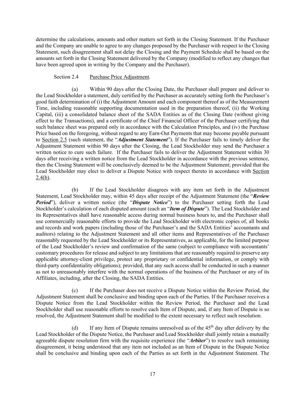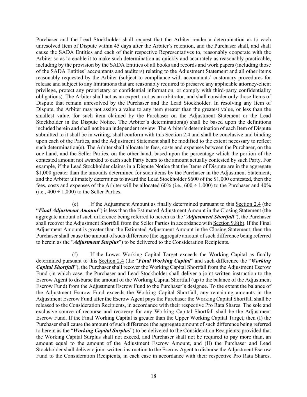 18 Purchaser and the Lead Stockholder shall request that the Arbiter render a determination as to each unresolved Item of Dispute within 45 days after the Arbiter’s retention, and the Purchaser shall, and shall cause the SADA Entities and each of their respective Representatives to, reasonably cooperate with the Arbiter so as to enable it to make such determination as quickly and accurately as reasonably practicable, including by the provision by the SADA Entities of all books and records and work papers (including those of the SADA Entities’ accountants and auditors) relating to the Adjustment Statement and all other items reasonably requested by the Arbiter (subject to compliance with accountants’ customary procedures for release and subject to any limitations that are reasonably required to preserve any applicable attorney-client privilege, protect any proprietary or confidential information, or comply with third-party confidentiality obligations). The Arbiter shall act as an expert, not as an arbitrator, and shall consider only those Items of Dispute that remain unresolved by the Purchaser and the Lead Stockholder. In resolving any Item of Dispute, the Arbiter may not assign a value to any item greater than the greatest value, or less than the smallest value, for such item claimed by the Purchaser on the Adjustment Statement or the Lead Stockholder in the Dispute Notice. The Arbiter’s determination(s) shall be based upon the definitions included herein and shall not be an independent review. The Arbiter’s determination of each Item of Dispute submitted to it shall be in writing, shall conform with this Section 2.4 and shall be conclusive and binding upon each of the Parties, and the Adjustment Statement shall be modified to the extent necessary to reflect such determination(s). The Arbiter shall allocate its fees, costs and expenses between the Purchaser, on the one hand, and the Seller Parties, on the other hand, based upon the percentage which the portion of the contested amount not awarded to each such Party bears to the amount actually contested by such Party. For example, if the Lead Stockholder claims in a Dispute Notice that the Items of Dispute are in the aggregate $1,000 greater than the amounts determined for such items by the Purchaser in the Adjustment Statement, and the Arbiter ultimately determines to award the Lead Stockholder $600 of the $1,000 contested, then the fees, costs and expenses of the Arbiter will be allocated 60% (i.e., 600 ÷ 1,000) to the Purchaser and 40% (i.e., 400 ÷ 1,000) to the Seller Parties. (e) If the Adjustment Amount as finally determined pursuant to this Section 2.4 (the “Final Adjustment Amount”) is less than the Estimated Adjustment Amount in the Closing Statement (the aggregate amount of such difference being referred to herein as the “Adjustment Shortfall”), the Purchaser shall recover the Adjustment Shortfall from the Seller Parties in accordance with Section 9.8(b). If the Final Adjustment Amount is greater than the Estimated Adjustment Amount in the Closing Statement, then the Purchaser shall cause the amount of such difference (the aggregate amount of such difference being referred to herein as the “Adjustment Surplus”) to be delivered to the Consideration Recipients. (f) If the Lower Working Capital Target exceeds the Working Capital as finally determined pursuant to this Section 2.4 (the “Final Working Capital” and such difference the “Working Capital Shortfall”), the Purchaser shall recover the Working Capital Shortfall from the Adjustment Escrow Fund (in which case, the Purchaser and Lead Stockholder shall deliver a joint written instruction to the Escrow Agent to disburse the amount of the Working Capital Shortfall (up to the balance of the Adjustment Escrow Fund) from the Adjustment Escrow Fund to the Purchaser’s designee. To the extent the balance of the Adjustment Escrow Fund exceeds the Working Capital Shortfall, any remaining amounts in the Adjustment Escrow Fund after the Escrow Agent pays the Purchaser the Working Capital Shortfall shall be released to the Consideration Recipients, in accordance with their respective Pro Rata Shares. The sole and exclusive source of recourse and recovery for any Working Capital Shortfall shall be the Adjustment Escrow Fund. If the Final Working Capital is greater than the Upper Working Capital Target, then (I) the Purchaser shall cause the amount of such difference (the aggregate amount of such difference being referred to herein as the “Working Capital Surplus”) to be delivered to the Consideration Recipients; provided that the Working Capital Surplus shall not exceed, and Purchaser shall not be required to pay more than, an amount equal to the amount of the Adjustment Escrow Amount, and (II) the Purchaser and Lead Stockholder shall deliver a joint written instruction to the Escrow Agent to disburse the Adjustment Escrow Fund to the Consideration Recipients, in each case in accordance with their respective Pro Rata Shares.