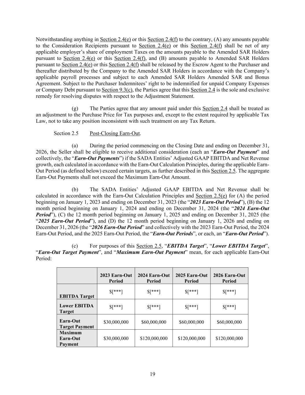 19 Notwithstanding anything in Section 2.4(e) or this Section 2.4(f) to the contrary, (A) any amounts payable to the Consideration Recipients pursuant to Section 2.4(e) or this Section 2.4(f) shall be net of any applicable employer’s share of employment Taxes on the amounts payable to the Amended SAR Holders pursuant to Section 2.4(e) or this Section 2.4(f), and (B) amounts payable to Amended SAR Holders pursuant to Section 2.4(e) or this Section 2.4(f) shall be released by the Escrow Agent to the Purchaser and thereafter distributed by the Company to the Amended SAR Holders in accordance with the Company’s applicable payroll processes and subject to each Amended SAR Holders Amended SAR and Bonus Agreement. Subject to the Purchaser Indemnitees’ right to be indemnified for unpaid Company Expenses or Company Debt pursuant to Section 9.3(c), the Parties agree that this Section 2.4 is the sole and exclusive remedy for resolving disputes with respect to the Adjustment Statement. (g) The Parties agree that any amount paid under this Section 2.4 shall be treated as an adjustment to the Purchase Price for Tax purposes and, except to the extent required by applicable Tax Law, not to take any position inconsistent with such treatment on any Tax Return. Section 2.5 Post-Closing Earn-Out. (a) During the period commencing on the Closing Date and ending on December 31, 2026, the Seller shall be eligible to receive additional consideration (each an “Earn-Out Payment” and collectively, the “Earn-Out Payments”) if the SADA Entities’ Adjusted GAAP EBITDA and Net Revenue growth, each calculated in accordance with the Earn-Out Calculation Principles, during the applicable Earn- Out Period (as defined below) exceed certain targets, as further described in this Section 2.5. The aggregate Earn-Out Payments shall not exceed the Maximum Earn-Out Amount. (b) The SADA Entities’ Adjusted GAAP EBITDA and Net Revenue shall be calculated in accordance with the Earn-Out Calculation Principles and Section 2.5(e) for (A) the period beginning on January 1, 2023 and ending on December 31, 2023 (the “2023 Earn-Out Period”), (B) the 12 month period beginning on January 1, 2024 and ending on December 31, 2024 (the “2024 Earn-Out Period”), (C) the 12 month period beginning on January 1, 2025 and ending on December 31, 2025 (the “2025 Earn-Out Period”), and (D) the 12 month period beginning on January 1, 2026 and ending on December 31, 2026 (the “2026 Earn-Out Period” and collectively with the 2023 Earn-Out Period, the 2024 Earn-Out Period, and the 2025 Earn-Out Period, the “Earn-Out Periods”, or each, an “Earn-Out Period”). (c) For purposes of this Section 2.5, “EBITDA Target”, “Lower EBITDA Target”, “Earn-Out Target Payment”, and “Maximum Earn-Out Payment” mean, for each applicable Earn-Out Period: 2023 Earn-Out Period 2024 Earn-Out Period 2025 Earn-Out Period 2026 Earn-Out Period EBITDA Target $[***] $[***] $[***] $[***] Lower EBITDA Target $[***] $[***] $[***] $[***] Earn-Out Target Payment $30,000,000 $60,000,000 $60,000,000 $60,000,000 Maximum Earn-Out Payment $30,000,000 $120,000,000 $120,000,000 $120,000,000