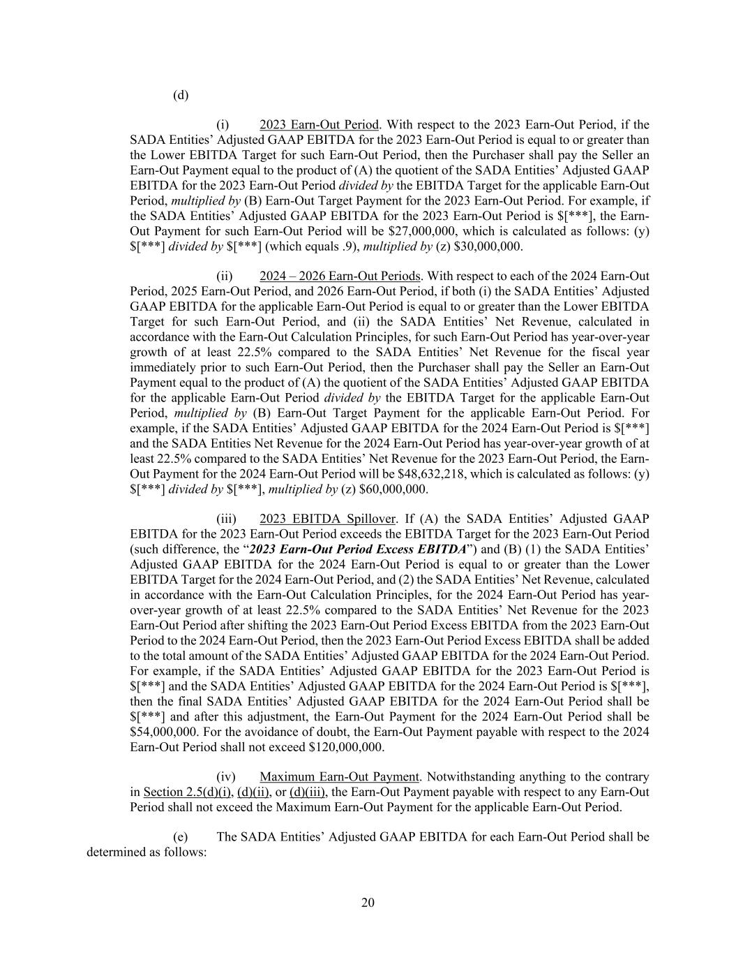 20 (d) (i) 2023 Earn-Out Period. With respect to the 2023 Earn-Out Period, if the SADA Entities’ Adjusted GAAP EBITDA for the 2023 Earn-Out Period is equal to or greater than the Lower EBITDA Target for such Earn-Out Period, then the Purchaser shall pay the Seller an Earn-Out Payment equal to the product of (A) the quotient of the SADA Entities’ Adjusted GAAP EBITDA for the 2023 Earn-Out Period divided by the EBITDA Target for the applicable Earn-Out Period, multiplied by (B) Earn-Out Target Payment for the 2023 Earn-Out Period. For example, if the SADA Entities’ Adjusted GAAP EBITDA for the 2023 Earn-Out Period is $[***], the Earn- Out Payment for such Earn-Out Period will be $27,000,000, which is calculated as follows: (y) $[***] divided by $[***] (which equals .9), multiplied by (z) $30,000,000. (ii) 2024 – 2026 Earn-Out Periods. With respect to each of the 2024 Earn-Out Period, 2025 Earn-Out Period, and 2026 Earn-Out Period, if both (i) the SADA Entities’ Adjusted GAAP EBITDA for the applicable Earn-Out Period is equal to or greater than the Lower EBITDA Target for such Earn-Out Period, and (ii) the SADA Entities’ Net Revenue, calculated in accordance with the Earn-Out Calculation Principles, for such Earn-Out Period has year-over-year growth of at least 22.5% compared to the SADA Entities’ Net Revenue for the fiscal year immediately prior to such Earn-Out Period, then the Purchaser shall pay the Seller an Earn-Out Payment equal to the product of (A) the quotient of the SADA Entities’ Adjusted GAAP EBITDA for the applicable Earn-Out Period divided by the EBITDA Target for the applicable Earn-Out Period, multiplied by (B) Earn-Out Target Payment for the applicable Earn-Out Period. For example, if the SADA Entities’ Adjusted GAAP EBITDA for the 2024 Earn-Out Period is $[***] and the SADA Entities Net Revenue for the 2024 Earn-Out Period has year-over-year growth of at least 22.5% compared to the SADA Entities’ Net Revenue for the 2023 Earn-Out Period, the Earn- Out Payment for the 2024 Earn-Out Period will be $48,632,218, which is calculated as follows: (y) $[***] divided by $[***], multiplied by (z) $60,000,000. (iii) 2023 EBITDA Spillover. If (A) the SADA Entities’ Adjusted GAAP EBITDA for the 2023 Earn-Out Period exceeds the EBITDA Target for the 2023 Earn-Out Period (such difference, the “2023 Earn-Out Period Excess EBITDA”) and (B) (1) the SADA Entities’ Adjusted GAAP EBITDA for the 2024 Earn-Out Period is equal to or greater than the Lower EBITDA Target for the 2024 Earn-Out Period, and (2) the SADA Entities’ Net Revenue, calculated in accordance with the Earn-Out Calculation Principles, for the 2024 Earn-Out Period has year- over-year growth of at least 22.5% compared to the SADA Entities’ Net Revenue for the 2023 Earn-Out Period after shifting the 2023 Earn-Out Period Excess EBITDA from the 2023 Earn-Out Period to the 2024 Earn-Out Period, then the 2023 Earn-Out Period Excess EBITDA shall be added to the total amount of the SADA Entities’ Adjusted GAAP EBITDA for the 2024 Earn-Out Period. For example, if the SADA Entities’ Adjusted GAAP EBITDA for the 2023 Earn-Out Period is $[***] and the SADA Entities’ Adjusted GAAP EBITDA for the 2024 Earn-Out Period is $[***], then the final SADA Entities’ Adjusted GAAP EBITDA for the 2024 Earn-Out Period shall be $[***] and after this adjustment, the Earn-Out Payment for the 2024 Earn-Out Period shall be $54,000,000. For the avoidance of doubt, the Earn-Out Payment payable with respect to the 2024 Earn-Out Period shall not exceed $120,000,000. (iv) Maximum Earn-Out Payment. Notwithstanding anything to the contrary in Section 2.5(d)(i), (d)(ii), or (d)(iii), the Earn-Out Payment payable with respect to any Earn-Out Period shall not exceed the Maximum Earn-Out Payment for the applicable Earn-Out Period. (e) The SADA Entities’ Adjusted GAAP EBITDA for each Earn-Out Period shall be determined as follows: