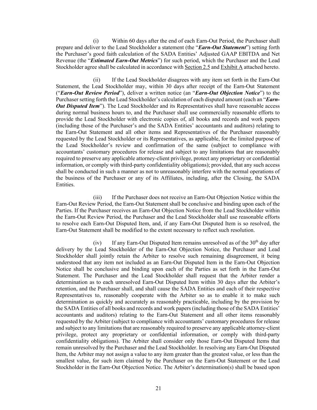 21 (i) Within 60 days after the end of each Earn-Out Period, the Purchaser shall prepare and deliver to the Lead Stockholder a statement (the “Earn-Out Statement”) setting forth the Purchaser’s good faith calculation of the SADA Entities’ Adjusted GAAP EBITDA and Net Revenue (the “Estimated Earn-Out Metrics”) for such period, which the Purchaser and the Lead Stockholder agree shall be calculated in accordance with Section 2.5 and Exhibit A attached hereto. (ii) If the Lead Stockholder disagrees with any item set forth in the Earn-Out Statement, the Lead Stockholder may, within 30 days after receipt of the Earn-Out Statement (“Earn-Out Review Period”), deliver a written notice (an “Earn-Out Objection Notice”) to the Purchaser setting forth the Lead Stockholder’s calculation of each disputed amount (each an “Earn- Out Disputed Item”). The Lead Stockholder and its Representatives shall have reasonable access during normal business hours to, and the Purchaser shall use commercially reasonable efforts to provide the Lead Stockholder with electronic copies of, all books and records and work papers (including those of the Purchaser’s and the SADA Entities’ accountants and auditors) relating to the Earn-Out Statement and all other items and Representatives of the Purchaser reasonably requested by the Lead Stockholder or its Representatives, as applicable, for the limited purpose of the Lead Stockholder’s review and confirmation of the same (subject to compliance with accountants’ customary procedures for release and subject to any limitations that are reasonably required to preserve any applicable attorney-client privilege, protect any proprietary or confidential information, or comply with third-party confidentiality obligations); provided, that any such access shall be conducted in such a manner as not to unreasonably interfere with the normal operations of the business of the Purchaser or any of its Affiliates, including, after the Closing, the SADA Entities. (iii) If the Purchaser does not receive an Earn-Out Objection Notice within the Earn-Out Review Period, the Earn-Out Statement shall be conclusive and binding upon each of the Parties. If the Purchaser receives an Earn-Out Objection Notice from the Lead Stockholder within the Earn-Out Review Period, the Purchaser and the Lead Stockholder shall use reasonable efforts to resolve each Earn-Out Disputed Item, and, if any Earn-Out Disputed Item is so resolved, the Earn-Out Statement shall be modified to the extent necessary to reflect such resolution. (iv) If any Earn-Out Disputed Item remains unresolved as of the 30th day after delivery by the Lead Stockholder of the Earn-Out Objection Notice, the Purchaser and Lead Stockholder shall jointly retain the Arbiter to resolve such remaining disagreement, it being understood that any item not included as an Earn-Out Disputed Item in the Earn-Out Objection Notice shall be conclusive and binding upon each of the Parties as set forth in the Earn-Out Statement. The Purchaser and the Lead Stockholder shall request that the Arbiter render a determination as to each unresolved Earn-Out Disputed Item within 30 days after the Arbiter’s retention, and the Purchaser shall, and shall cause the SADA Entities and each of their respective Representatives to, reasonably cooperate with the Arbiter so as to enable it to make such determination as quickly and accurately as reasonably practicable, including by the provision by the SADA Entities of all books and records and work papers (including those of the SADA Entities’ accountants and auditors) relating to the Earn-Out Statement and all other items reasonably requested by the Arbiter (subject to compliance with accountants’ customary procedures for release and subject to any limitations that are reasonably required to preserve any applicable attorney-client privilege, protect any proprietary or confidential information, or comply with third-party confidentiality obligations). The Arbiter shall consider only those Earn-Out Disputed Items that remain unresolved by the Purchaser and the Lead Stockholder. In resolving any Earn-Out Disputed Item, the Arbiter may not assign a value to any item greater than the greatest value, or less than the smallest value, for such item claimed by the Purchaser on the Earn-Out Statement or the Lead Stockholder in the Earn-Out Objection Notice. The Arbiter’s determination(s) shall be based upon