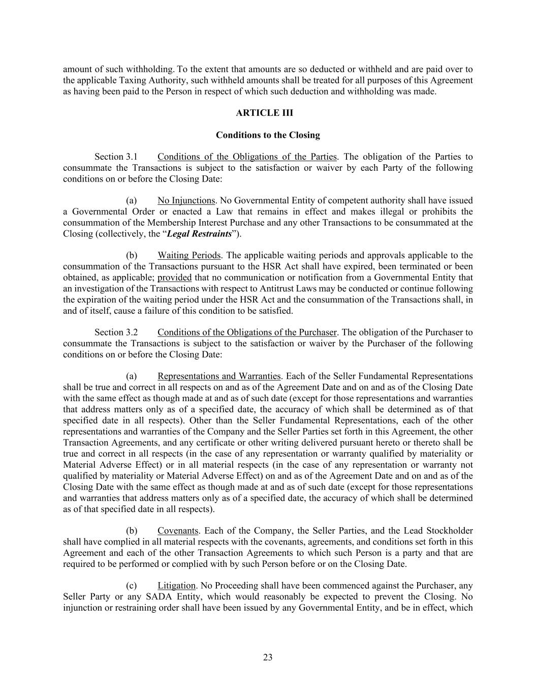 23 amount of such withholding. To the extent that amounts are so deducted or withheld and are paid over to the applicable Taxing Authority, such withheld amounts shall be treated for all purposes of this Agreement as having been paid to the Person in respect of which such deduction and withholding was made. ARTICLE III Conditions to the Closing Section 3.1 Conditions of the Obligations of the Parties. The obligation of the Parties to consummate the Transactions is subject to the satisfaction or waiver by each Party of the following conditions on or before the Closing Date: (a) No Injunctions. No Governmental Entity of competent authority shall have issued a Governmental Order or enacted a Law that remains in effect and makes illegal or prohibits the consummation of the Membership Interest Purchase and any other Transactions to be consummated at the Closing (collectively, the “Legal Restraints”). (b) Waiting Periods. The applicable waiting periods and approvals applicable to the consummation of the Transactions pursuant to the HSR Act shall have expired, been terminated or been obtained, as applicable; provided that no communication or notification from a Governmental Entity that an investigation of the Transactions with respect to Antitrust Laws may be conducted or continue following the expiration of the waiting period under the HSR Act and the consummation of the Transactions shall, in and of itself, cause a failure of this condition to be satisfied. Section 3.2 Conditions of the Obligations of the Purchaser. The obligation of the Purchaser to consummate the Transactions is subject to the satisfaction or waiver by the Purchaser of the following conditions on or before the Closing Date: (a) Representations and Warranties. Each of the Seller Fundamental Representations shall be true and correct in all respects on and as of the Agreement Date and on and as of the Closing Date with the same effect as though made at and as of such date (except for those representations and warranties that address matters only as of a specified date, the accuracy of which shall be determined as of that specified date in all respects). Other than the Seller Fundamental Representations, each of the other representations and warranties of the Company and the Seller Parties set forth in this Agreement, the other Transaction Agreements, and any certificate or other writing delivered pursuant hereto or thereto shall be true and correct in all respects (in the case of any representation or warranty qualified by materiality or Material Adverse Effect) or in all material respects (in the case of any representation or warranty not qualified by materiality or Material Adverse Effect) on and as of the Agreement Date and on and as of the Closing Date with the same effect as though made at and as of such date (except for those representations and warranties that address matters only as of a specified date, the accuracy of which shall be determined as of that specified date in all respects). (b) Covenants. Each of the Company, the Seller Parties, and the Lead Stockholder shall have complied in all material respects with the covenants, agreements, and conditions set forth in this Agreement and each of the other Transaction Agreements to which such Person is a party and that are required to be performed or complied with by such Person before or on the Closing Date. (c) Litigation. No Proceeding shall have been commenced against the Purchaser, any Seller Party or any SADA Entity, which would reasonably be expected to prevent the Closing. No injunction or restraining order shall have been issued by any Governmental Entity, and be in effect, which