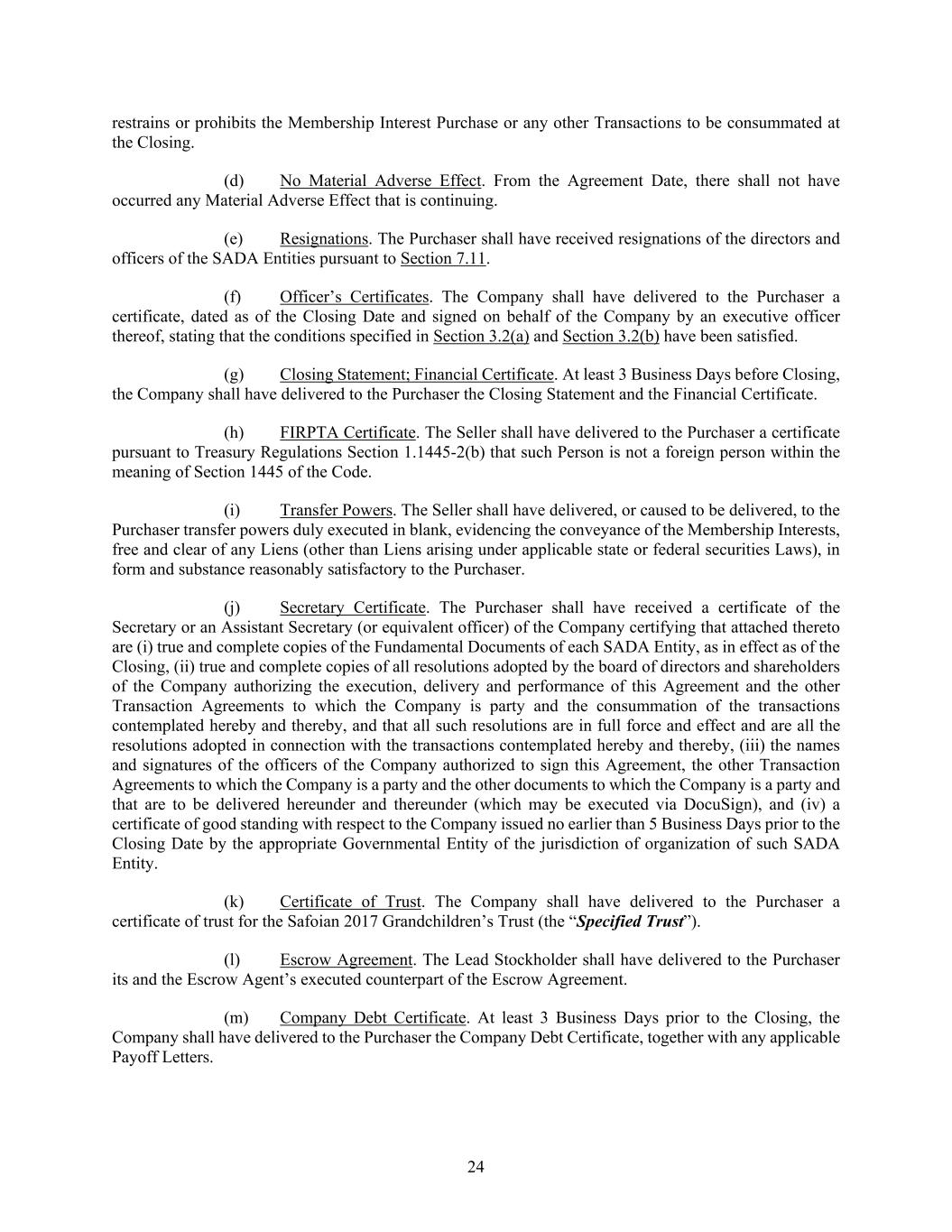 24 restrains or prohibits the Membership Interest Purchase or any other Transactions to be consummated at the Closing. (d) No Material Adverse Effect. From the Agreement Date, there shall not have occurred any Material Adverse Effect that is continuing. (e) Resignations. The Purchaser shall have received resignations of the directors and officers of the SADA Entities pursuant to Section 7.11. (f) Officer’s Certificates. The Company shall have delivered to the Purchaser a certificate, dated as of the Closing Date and signed on behalf of the Company by an executive officer thereof, stating that the conditions specified in Section 3.2(a) and Section 3.2(b) have been satisfied. (g) Closing Statement; Financial Certificate. At least 3 Business Days before Closing, the Company shall have delivered to the Purchaser the Closing Statement and the Financial Certificate. (h) FIRPTA Certificate. The Seller shall have delivered to the Purchaser a certificate pursuant to Treasury Regulations Section 1.1445-2(b) that such Person is not a foreign person within the meaning of Section 1445 of the Code. (i) Transfer Powers. The Seller shall have delivered, or caused to be delivered, to the Purchaser transfer powers duly executed in blank, evidencing the conveyance of the Membership Interests, free and clear of any Liens (other than Liens arising under applicable state or federal securities Laws), in form and substance reasonably satisfactory to the Purchaser. (j) Secretary Certificate. The Purchaser shall have received a certificate of the Secretary or an Assistant Secretary (or equivalent officer) of the Company certifying that attached thereto are (i) true and complete copies of the Fundamental Documents of each SADA Entity, as in effect as of the Closing, (ii) true and complete copies of all resolutions adopted by the board of directors and shareholders of the Company authorizing the execution, delivery and performance of this Agreement and the other Transaction Agreements to which the Company is party and the consummation of the transactions contemplated hereby and thereby, and that all such resolutions are in full force and effect and are all the resolutions adopted in connection with the transactions contemplated hereby and thereby, (iii) the names and signatures of the officers of the Company authorized to sign this Agreement, the other Transaction Agreements to which the Company is a party and the other documents to which the Company is a party and that are to be delivered hereunder and thereunder (which may be executed via DocuSign), and (iv) a certificate of good standing with respect to the Company issued no earlier than 5 Business Days prior to the Closing Date by the appropriate Governmental Entity of the jurisdiction of organization of such SADA Entity. (k) Certificate of Trust. The Company shall have delivered to the Purchaser a certificate of trust for the Safoian 2017 Grandchildren’s Trust (the “Specified Trust”). (l) Escrow Agreement. The Lead Stockholder shall have delivered to the Purchaser its and the Escrow Agent’s executed counterpart of the Escrow Agreement. (m) Company Debt Certificate. At least 3 Business Days prior to the Closing, the Company shall have delivered to the Purchaser the Company Debt Certificate, together with any applicable Payoff Letters.