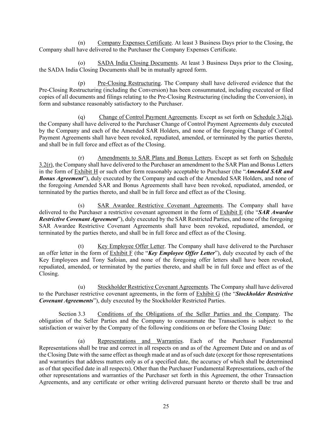 25 (n) Company Expenses Certificate. At least 3 Business Days prior to the Closing, the Company shall have delivered to the Purchaser the Company Expenses Certificate. (o) SADA India Closing Documents. At least 3 Business Days prior to the Closing, the SADA India Closing Documents shall be in mutually agreed form. (p) Pre-Closing Restructuring. The Company shall have delivered evidence that the Pre-Closing Restructuring (including the Conversion) has been consummated, including executed or filed copies of all documents and filings relating to the Pre-Closing Restructuring (including the Conversion), in form and substance reasonably satisfactory to the Purchaser. (q) Change of Control Payment Agreements. Except as set forth on Schedule 3.2(q), the Company shall have delivered to the Purchaser Change of Control Payment Agreements duly executed by the Company and each of the Amended SAR Holders, and none of the foregoing Change of Control Payment Agreements shall have been revoked, repudiated, amended, or terminated by the parties thereto, and shall be in full force and effect as of the Closing. (r) Amendments to SAR Plans and Bonus Letters. Except as set forth on Schedule 3.2(r), the Company shall have delivered to the Purchaser an amendment to the SAR Plan and Bonus Letters in the form of Exhibit H or such other form reasonably acceptable to Purchaser (the “Amended SAR and Bonus Agreement”), duly executed by the Company and each of the Amended SAR Holders, and none of the foregoing Amended SAR and Bonus Agreements shall have been revoked, repudiated, amended, or terminated by the parties thereto, and shall be in full force and effect as of the Closing. (s) SAR Awardee Restrictive Covenant Agreements. The Company shall have delivered to the Purchaser a restrictive covenant agreement in the form of Exhibit E (the “SAR Awardee Restrictive Covenant Agreement”), duly executed by the SAR Restricted Parties, and none of the foregoing SAR Awardee Restrictive Covenant Agreements shall have been revoked, repudiated, amended, or terminated by the parties thereto, and shall be in full force and effect as of the Closing. (t) Key Employee Offer Letter. The Company shall have delivered to the Purchaser an offer letter in the form of Exhibit F (the “Key Employee Offer Letter”), duly executed by each of the Key Employees and Tony Safoian, and none of the foregoing offer letters shall have been revoked, repudiated, amended, or terminated by the parties thereto, and shall be in full force and effect as of the Closing. (u) Stockholder Restrictive Covenant Agreements. The Company shall have delivered to the Purchaser restrictive covenant agreements, in the form of Exhibit G (the “Stockholder Restrictive Covenant Agreements”), duly executed by the Stockholder Restricted Parties. Section 3.3 Conditions of the Obligations of the Seller Parties and the Company. The obligation of the Seller Parties and the Company to consummate the Transactions is subject to the satisfaction or waiver by the Company of the following conditions on or before the Closing Date: (a) Representations and Warranties. Each of the Purchaser Fundamental Representations shall be true and correct in all respects on and as of the Agreement Date and on and as of the Closing Date with the same effect as though made at and as of such date (except for those representations and warranties that address matters only as of a specified date, the accuracy of which shall be determined as of that specified date in all respects). Other than the Purchaser Fundamental Representations, each of the other representations and warranties of the Purchaser set forth in this Agreement, the other Transaction Agreements, and any certificate or other writing delivered pursuant hereto or thereto shall be true and