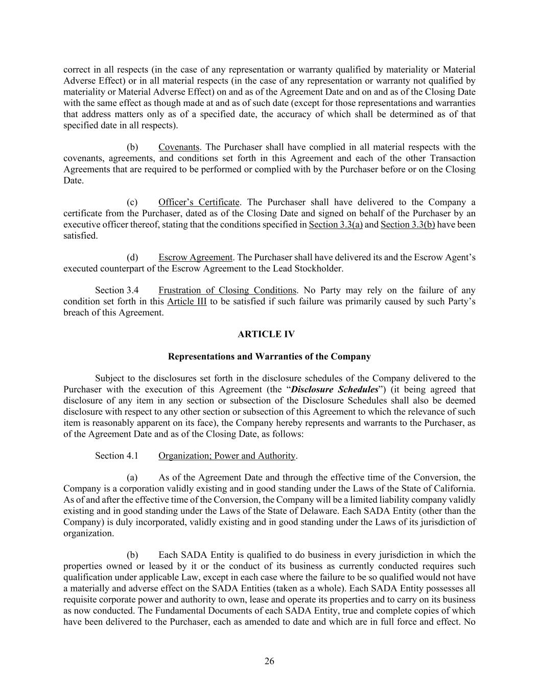 26 correct in all respects (in the case of any representation or warranty qualified by materiality or Material Adverse Effect) or in all material respects (in the case of any representation or warranty not qualified by materiality or Material Adverse Effect) on and as of the Agreement Date and on and as of the Closing Date with the same effect as though made at and as of such date (except for those representations and warranties that address matters only as of a specified date, the accuracy of which shall be determined as of that specified date in all respects). (b) Covenants. The Purchaser shall have complied in all material respects with the covenants, agreements, and conditions set forth in this Agreement and each of the other Transaction Agreements that are required to be performed or complied with by the Purchaser before or on the Closing Date. (c) Officer’s Certificate. The Purchaser shall have delivered to the Company a certificate from the Purchaser, dated as of the Closing Date and signed on behalf of the Purchaser by an executive officer thereof, stating that the conditions specified in Section 3.3(a) and Section 3.3(b) have been satisfied. (d) Escrow Agreement. The Purchaser shall have delivered its and the Escrow Agent’s executed counterpart of the Escrow Agreement to the Lead Stockholder. Section 3.4 Frustration of Closing Conditions. No Party may rely on the failure of any condition set forth in this Article III to be satisfied if such failure was primarily caused by such Party’s breach of this Agreement. ARTICLE IV Representations and Warranties of the Company Subject to the disclosures set forth in the disclosure schedules of the Company delivered to the Purchaser with the execution of this Agreement (the “Disclosure Schedules”) (it being agreed that disclosure of any item in any section or subsection of the Disclosure Schedules shall also be deemed disclosure with respect to any other section or subsection of this Agreement to which the relevance of such item is reasonably apparent on its face), the Company hereby represents and warrants to the Purchaser, as of the Agreement Date and as of the Closing Date, as follows: Section 4.1 Organization; Power and Authority. (a) As of the Agreement Date and through the effective time of the Conversion, the Company is a corporation validly existing and in good standing under the Laws of the State of California. As of and after the effective time of the Conversion, the Company will be a limited liability company validly existing and in good standing under the Laws of the State of Delaware. Each SADA Entity (other than the Company) is duly incorporated, validly existing and in good standing under the Laws of its jurisdiction of organization. (b) Each SADA Entity is qualified to do business in every jurisdiction in which the properties owned or leased by it or the conduct of its business as currently conducted requires such qualification under applicable Law, except in each case where the failure to be so qualified would not have a materially and adverse effect on the SADA Entities (taken as a whole). Each SADA Entity possesses all requisite corporate power and authority to own, lease and operate its properties and to carry on its business as now conducted. The Fundamental Documents of each SADA Entity, true and complete copies of which have been delivered to the Purchaser, each as amended to date and which are in full force and effect. No