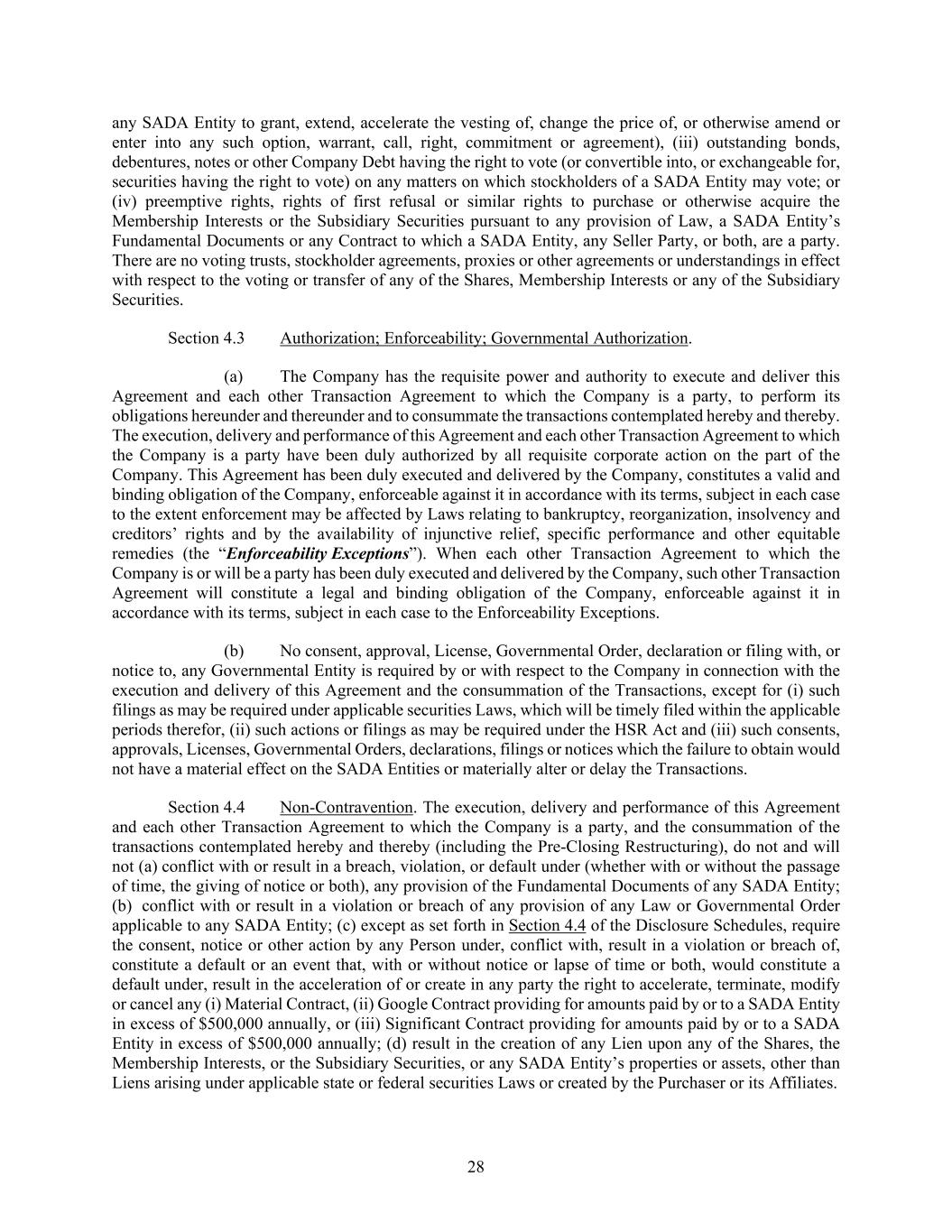 28 any SADA Entity to grant, extend, accelerate the vesting of, change the price of, or otherwise amend or enter into any such option, warrant, call, right, commitment or agreement), (iii) outstanding bonds, debentures, notes or other Company Debt having the right to vote (or convertible into, or exchangeable for, securities having the right to vote) on any matters on which stockholders of a SADA Entity may vote; or (iv) preemptive rights, rights of first refusal or similar rights to purchase or otherwise acquire the Membership Interests or the Subsidiary Securities pursuant to any provision of Law, a SADA Entity’s Fundamental Documents or any Contract to which a SADA Entity, any Seller Party, or both, are a party. There are no voting trusts, stockholder agreements, proxies or other agreements or understandings in effect with respect to the voting or transfer of any of the Shares, Membership Interests or any of the Subsidiary Securities. Section 4.3 Authorization; Enforceability; Governmental Authorization. (a) The Company has the requisite power and authority to execute and deliver this Agreement and each other Transaction Agreement to which the Company is a party, to perform its obligations hereunder and thereunder and to consummate the transactions contemplated hereby and thereby. The execution, delivery and performance of this Agreement and each other Transaction Agreement to which the Company is a party have been duly authorized by all requisite corporate action on the part of the Company. This Agreement has been duly executed and delivered by the Company, constitutes a valid and binding obligation of the Company, enforceable against it in accordance with its terms, subject in each case to the extent enforcement may be affected by Laws relating to bankruptcy, reorganization, insolvency and creditors’ rights and by the availability of injunctive relief, specific performance and other equitable remedies (the “Enforceability Exceptions”). When each other Transaction Agreement to which the Company is or will be a party has been duly executed and delivered by the Company, such other Transaction Agreement will constitute a legal and binding obligation of the Company, enforceable against it in accordance with its terms, subject in each case to the Enforceability Exceptions. (b) No consent, approval, License, Governmental Order, declaration or filing with, or notice to, any Governmental Entity is required by or with respect to the Company in connection with the execution and delivery of this Agreement and the consummation of the Transactions, except for (i) such filings as may be required under applicable securities Laws, which will be timely filed within the applicable periods therefor, (ii) such actions or filings as may be required under the HSR Act and (iii) such consents, approvals, Licenses, Governmental Orders, declarations, filings or notices which the failure to obtain would not have a material effect on the SADA Entities or materially alter or delay the Transactions. Section 4.4 Non-Contravention. The execution, delivery and performance of this Agreement and each other Transaction Agreement to which the Company is a party, and the consummation of the transactions contemplated hereby and thereby (including the Pre-Closing Restructuring), do not and will not (a) conflict with or result in a breach, violation, or default under (whether with or without the passage of time, the giving of notice or both), any provision of the Fundamental Documents of any SADA Entity; (b) conflict with or result in a violation or breach of any provision of any Law or Governmental Order applicable to any SADA Entity; (c) except as set forth in Section 4.4 of the Disclosure Schedules, require the consent, notice or other action by any Person under, conflict with, result in a violation or breach of, constitute a default or an event that, with or without notice or lapse of time or both, would constitute a default under, result in the acceleration of or create in any party the right to accelerate, terminate, modify or cancel any (i) Material Contract, (ii) Google Contract providing for amounts paid by or to a SADA Entity in excess of $500,000 annually, or (iii) Significant Contract providing for amounts paid by or to a SADA Entity in excess of $500,000 annually; (d) result in the creation of any Lien upon any of the Shares, the Membership Interests, or the Subsidiary Securities, or any SADA Entity’s properties or assets, other than Liens arising under applicable state or federal securities Laws or created by the Purchaser or its Affiliates.