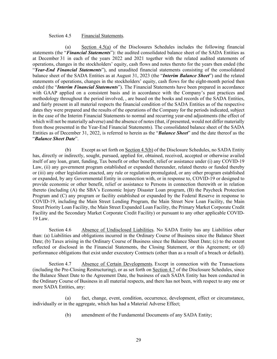 29 Section 4.5 Financial Statements. (a) Section 4.5(a) of the Disclosures Schedules includes the following financial statements (the “Financial Statements”): the audited consolidated balance sheet of the SADA Entities as at December 31 in each of the years 2022 and 2021 together with the related audited statements of operations, changes in the stockholders’ equity, cash flows and notes thereto for the years then ended (the “Year-End Financial Statements”), and unaudited financial statements consisting of the consolidated balance sheet of the SADA Entities as at August 31, 2023 (the “Interim Balance Sheet”) and the related statements of operations, changes in the stockholders’ equity, cash flows for the eight-month period then ended (the “Interim Financial Statements”). The Financial Statements have been prepared in accordance with GAAP applied on a consistent basis and in accordance with the Company’s past practices and methodology throughout the period involved, , are based on the books and records of the SADA Entities, and fairly present in all material respects the financial condition of the SADA Entities as of the respective dates they were prepared and the results of the operations of the Company for the periods indicated, subject in the case of the Interim Financial Statements to normal and recurring year-end adjustments (the effect of which will not be materially adverse) and the absence of notes (that, if presented, would not differ materially from those presented in the Year-End Financial Statements). The consolidated balance sheet of the SADA Entities as of December 31, 2022, is referred to herein as the “Balance Sheet” and the date thereof as the “Balance Sheet Date”. (b) Except as set forth on Section 4.5(b) of the Disclosure Schedules, no SADA Entity has, directly or indirectly, sought, pursued, applied for, obtained, received, accepted or otherwise availed itself of any loan, grant, funding, Tax benefit or other benefit, relief or assistance under (i) any COVID-19 Law, (ii) any government program established or expanded thereunder, related thereto or funded thereby or (iii) any other legislation enacted, any rule or regulation promulgated, or any other program established or expanded, by any Governmental Entity in connection with, or in response to, COVID-19 or designed to provide economic or other benefit, relief or assistance to Persons in connection therewith or in relation thereto (including (A) the SBA’s Economic Injury Disaster Loan program, (B) the Paycheck Protection Program and (C) any program or facility established or expanded by the Federal Reserve in response to COVID-19, including the Main Street Lending Program, the Main Street New Loan Facility, the Main Street Priority Loan Facility, the Main Street Expanded Loan Facility, the Primary Market Corporate Credit Facility and the Secondary Market Corporate Credit Facility) or pursuant to any other applicable COVID- 19 Law. Section 4.6 Absence of Undisclosed Liabilities. No SADA Entity has any Liabilities other than: (a) Liabilities and obligations incurred in the Ordinary Course of Business since the Balance Sheet Date; (b) Taxes arising in the Ordinary Course of Business since the Balance Sheet Date; (c) to the extent reflected or disclosed in the Financial Statements, the Closing Statement, or this Agreement; or (d) performance obligations that exist under executory Contracts (other than as a result of a breach or default). Section 4.7 Absence of Certain Developments. Except in connection with the Transactions (including the Pre-Closing Restructuring), or as set forth on Section 4.7 of the Disclosure Schedules, since the Balance Sheet Date to the Agreement Date, the business of each SADA Entity has been conducted in the Ordinary Course of Business in all material respects, and there has not been, with respect to any one or more SADA Entities, any: (a) fact, change, event, condition, occurrence, development, effect or circumstance, individually or in the aggregate, which has had a Material Adverse Effect; (b) amendment of the Fundamental Documents of any SADA Entity;