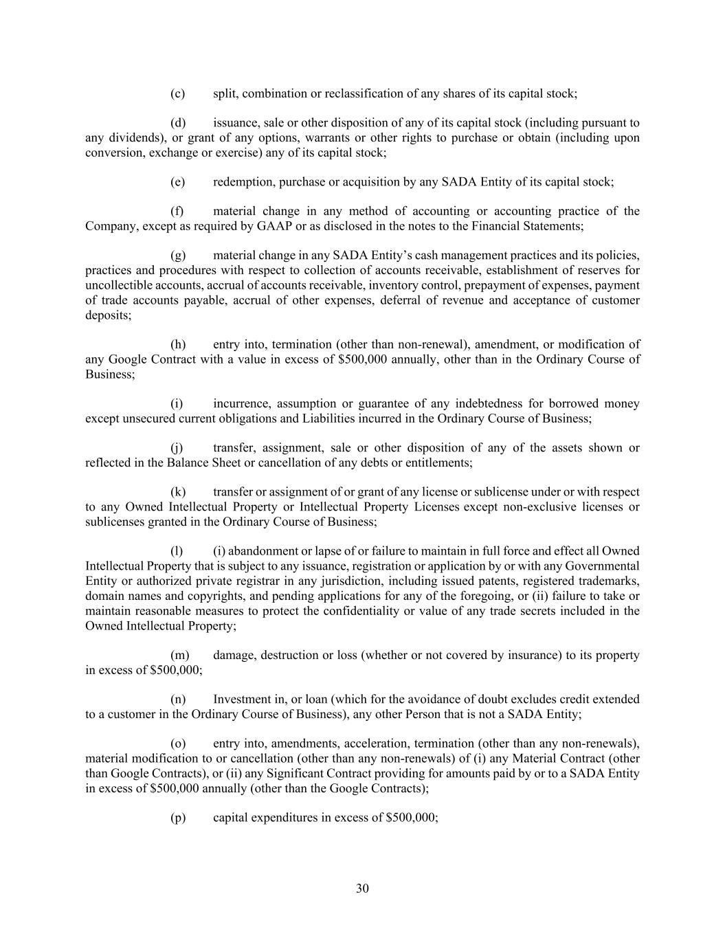 30 (c) split, combination or reclassification of any shares of its capital stock; (d) issuance, sale or other disposition of any of its capital stock (including pursuant to any dividends), or grant of any options, warrants or other rights to purchase or obtain (including upon conversion, exchange or exercise) any of its capital stock; (e) redemption, purchase or acquisition by any SADA Entity of its capital stock; (f) material change in any method of accounting or accounting practice of the Company, except as required by GAAP or as disclosed in the notes to the Financial Statements; (g) material change in any SADA Entity’s cash management practices and its policies, practices and procedures with respect to collection of accounts receivable, establishment of reserves for uncollectible accounts, accrual of accounts receivable, inventory control, prepayment of expenses, payment of trade accounts payable, accrual of other expenses, deferral of revenue and acceptance of customer deposits; (h) entry into, termination (other than non-renewal), amendment, or modification of any Google Contract with a value in excess of $500,000 annually, other than in the Ordinary Course of Business; (i) incurrence, assumption or guarantee of any indebtedness for borrowed money except unsecured current obligations and Liabilities incurred in the Ordinary Course of Business; (j) transfer, assignment, sale or other disposition of any of the assets shown or reflected in the Balance Sheet or cancellation of any debts or entitlements; (k) transfer or assignment of or grant of any license or sublicense under or with respect to any Owned Intellectual Property or Intellectual Property Licenses except non-exclusive licenses or sublicenses granted in the Ordinary Course of Business; (l) (i) abandonment or lapse of or failure to maintain in full force and effect all Owned Intellectual Property that is subject to any issuance, registration or application by or with any Governmental Entity or authorized private registrar in any jurisdiction, including issued patents, registered trademarks, domain names and copyrights, and pending applications for any of the foregoing, or (ii) failure to take or maintain reasonable measures to protect the confidentiality or value of any trade secrets included in the Owned Intellectual Property; (m) damage, destruction or loss (whether or not covered by insurance) to its property in excess of $500,000; (n) Investment in, or loan (which for the avoidance of doubt excludes credit extended to a customer in the Ordinary Course of Business), any other Person that is not a SADA Entity; (o) entry into, amendments, acceleration, termination (other than any non-renewals), material modification to or cancellation (other than any non-renewals) of (i) any Material Contract (other than Google Contracts), or (ii) any Significant Contract providing for amounts paid by or to a SADA Entity in excess of $500,000 annually (other than the Google Contracts); (p) capital expenditures in excess of $500,000;