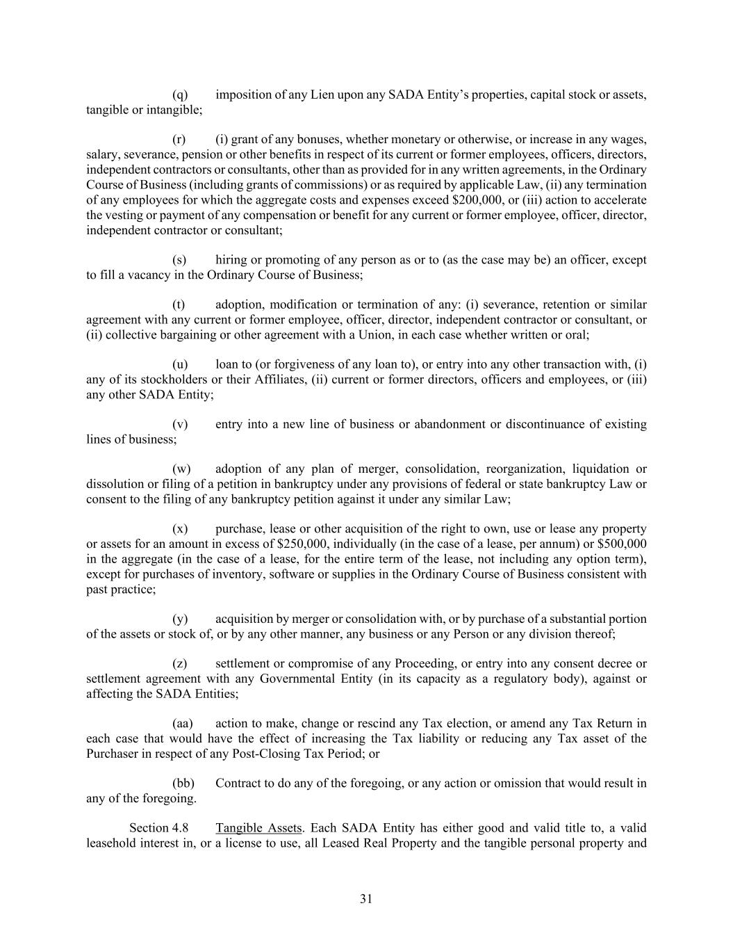 31 (q) imposition of any Lien upon any SADA Entity’s properties, capital stock or assets, tangible or intangible; (r) (i) grant of any bonuses, whether monetary or otherwise, or increase in any wages, salary, severance, pension or other benefits in respect of its current or former employees, officers, directors, independent contractors or consultants, other than as provided for in any written agreements, in the Ordinary Course of Business (including grants of commissions) or as required by applicable Law, (ii) any termination of any employees for which the aggregate costs and expenses exceed $200,000, or (iii) action to accelerate the vesting or payment of any compensation or benefit for any current or former employee, officer, director, independent contractor or consultant; (s) hiring or promoting of any person as or to (as the case may be) an officer, except to fill a vacancy in the Ordinary Course of Business; (t) adoption, modification or termination of any: (i) severance, retention or similar agreement with any current or former employee, officer, director, independent contractor or consultant, or (ii) collective bargaining or other agreement with a Union, in each case whether written or oral; (u) loan to (or forgiveness of any loan to), or entry into any other transaction with, (i) any of its stockholders or their Affiliates, (ii) current or former directors, officers and employees, or (iii) any other SADA Entity; (v) entry into a new line of business or abandonment or discontinuance of existing lines of business; (w) adoption of any plan of merger, consolidation, reorganization, liquidation or dissolution or filing of a petition in bankruptcy under any provisions of federal or state bankruptcy Law or consent to the filing of any bankruptcy petition against it under any similar Law; (x) purchase, lease or other acquisition of the right to own, use or lease any property or assets for an amount in excess of $250,000, individually (in the case of a lease, per annum) or $500,000 in the aggregate (in the case of a lease, for the entire term of the lease, not including any option term), except for purchases of inventory, software or supplies in the Ordinary Course of Business consistent with past practice; (y) acquisition by merger or consolidation with, or by purchase of a substantial portion of the assets or stock of, or by any other manner, any business or any Person or any division thereof; (z) settlement or compromise of any Proceeding, or entry into any consent decree or settlement agreement with any Governmental Entity (in its capacity as a regulatory body), against or affecting the SADA Entities; (aa) action to make, change or rescind any Tax election, or amend any Tax Return in each case that would have the effect of increasing the Tax liability or reducing any Tax asset of the Purchaser in respect of any Post-Closing Tax Period; or (bb) Contract to do any of the foregoing, or any action or omission that would result in any of the foregoing. Section 4.8 Tangible Assets. Each SADA Entity has either good and valid title to, a valid leasehold interest in, or a license to use, all Leased Real Property and the tangible personal property and