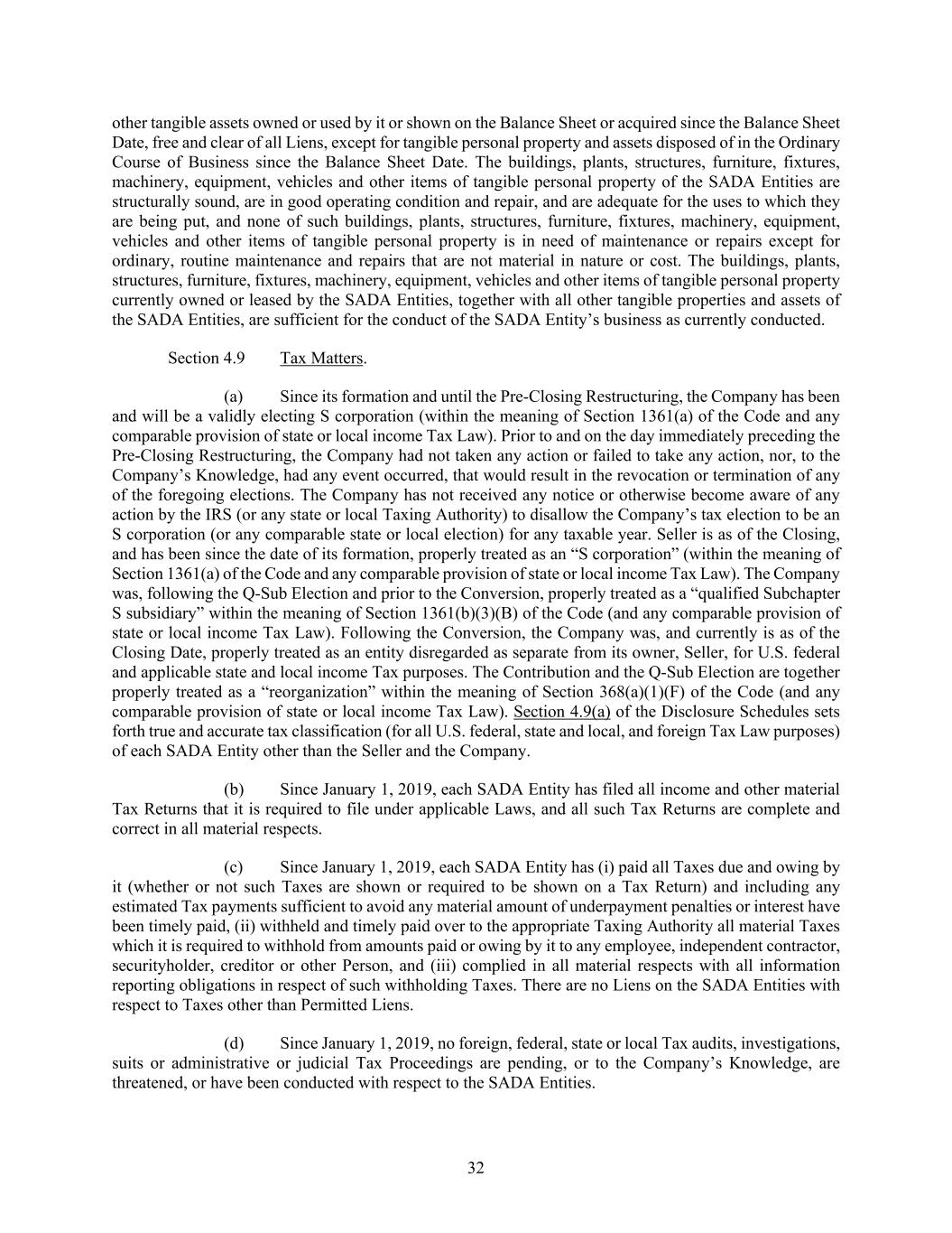 32 other tangible assets owned or used by it or shown on the Balance Sheet or acquired since the Balance Sheet Date, free and clear of all Liens, except for tangible personal property and assets disposed of in the Ordinary Course of Business since the Balance Sheet Date. The buildings, plants, structures, furniture, fixtures, machinery, equipment, vehicles and other items of tangible personal property of the SADA Entities are structurally sound, are in good operating condition and repair, and are adequate for the uses to which they are being put, and none of such buildings, plants, structures, furniture, fixtures, machinery, equipment, vehicles and other items of tangible personal property is in need of maintenance or repairs except for ordinary, routine maintenance and repairs that are not material in nature or cost. The buildings, plants, structures, furniture, fixtures, machinery, equipment, vehicles and other items of tangible personal property currently owned or leased by the SADA Entities, together with all other tangible properties and assets of the SADA Entities, are sufficient for the conduct of the SADA Entity’s business as currently conducted. Section 4.9 Tax Matters. (a) Since its formation and until the Pre-Closing Restructuring, the Company has been and will be a validly electing S corporation (within the meaning of Section 1361(a) of the Code and any comparable provision of state or local income Tax Law). Prior to and on the day immediately preceding the Pre-Closing Restructuring, the Company had not taken any action or failed to take any action, nor, to the Company’s Knowledge, had any event occurred, that would result in the revocation or termination of any of the foregoing elections. The Company has not received any notice or otherwise become aware of any action by the IRS (or any state or local Taxing Authority) to disallow the Company’s tax election to be an S corporation (or any comparable state or local election) for any taxable year. Seller is as of the Closing, and has been since the date of its formation, properly treated as an “S corporation” (within the meaning of Section 1361(a) of the Code and any comparable provision of state or local income Tax Law). The Company was, following the Q-Sub Election and prior to the Conversion, properly treated as a “qualified Subchapter S subsidiary” within the meaning of Section 1361(b)(3)(B) of the Code (and any comparable provision of state or local income Tax Law). Following the Conversion, the Company was, and currently is as of the Closing Date, properly treated as an entity disregarded as separate from its owner, Seller, for U.S. federal and applicable state and local income Tax purposes. The Contribution and the Q-Sub Election are together properly treated as a “reorganization” within the meaning of Section 368(a)(1)(F) of the Code (and any comparable provision of state or local income Tax Law). Section 4.9(a) of the Disclosure Schedules sets forth true and accurate tax classification (for all U.S. federal, state and local, and foreign Tax Law purposes) of each SADA Entity other than the Seller and the Company. (b) Since January 1, 2019, each SADA Entity has filed all income and other material Tax Returns that it is required to file under applicable Laws, and all such Tax Returns are complete and correct in all material respects. (c) Since January 1, 2019, each SADA Entity has (i) paid all Taxes due and owing by it (whether or not such Taxes are shown or required to be shown on a Tax Return) and including any estimated Tax payments sufficient to avoid any material amount of underpayment penalties or interest have been timely paid, (ii) withheld and timely paid over to the appropriate Taxing Authority all material Taxes which it is required to withhold from amounts paid or owing by it to any employee, independent contractor, securityholder, creditor or other Person, and (iii) complied in all material respects with all information reporting obligations in respect of such withholding Taxes. There are no Liens on the SADA Entities with respect to Taxes other than Permitted Liens. (d) Since January 1, 2019, no foreign, federal, state or local Tax audits, investigations, suits or administrative or judicial Tax Proceedings are pending, or to the Company’s Knowledge, are threatened, or have been conducted with respect to the SADA Entities.