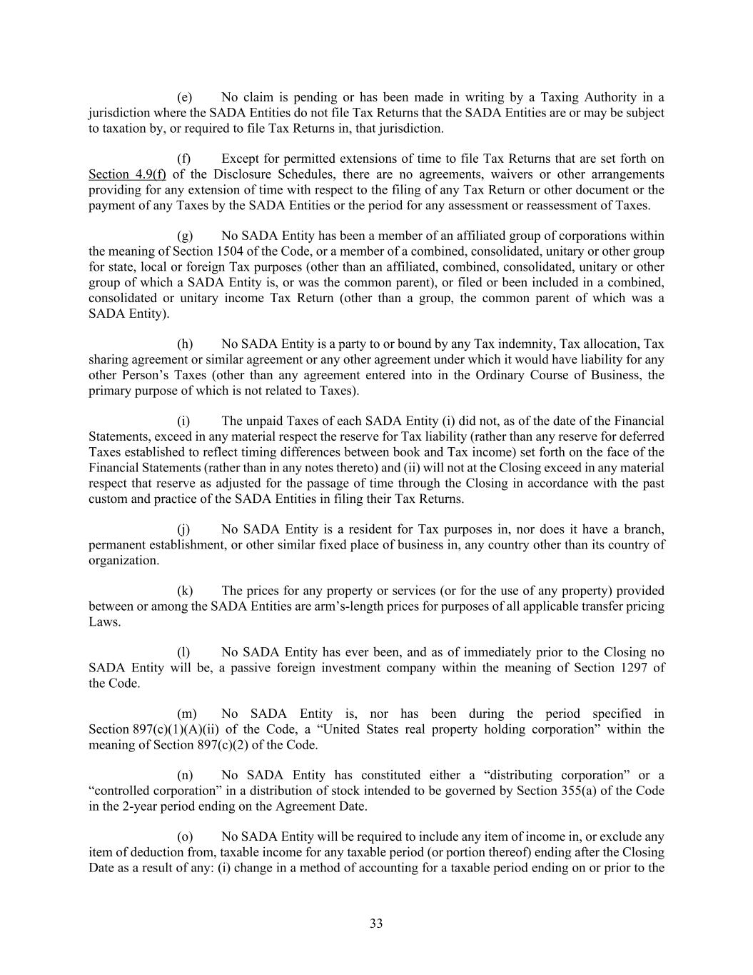 33 (e) No claim is pending or has been made in writing by a Taxing Authority in a jurisdiction where the SADA Entities do not file Tax Returns that the SADA Entities are or may be subject to taxation by, or required to file Tax Returns in, that jurisdiction. (f) Except for permitted extensions of time to file Tax Returns that are set forth on Section 4.9(f) of the Disclosure Schedules, there are no agreements, waivers or other arrangements providing for any extension of time with respect to the filing of any Tax Return or other document or the payment of any Taxes by the SADA Entities or the period for any assessment or reassessment of Taxes. (g) No SADA Entity has been a member of an affiliated group of corporations within the meaning of Section 1504 of the Code, or a member of a combined, consolidated, unitary or other group for state, local or foreign Tax purposes (other than an affiliated, combined, consolidated, unitary or other group of which a SADA Entity is, or was the common parent), or filed or been included in a combined, consolidated or unitary income Tax Return (other than a group, the common parent of which was a SADA Entity). (h) No SADA Entity is a party to or bound by any Tax indemnity, Tax allocation, Tax sharing agreement or similar agreement or any other agreement under which it would have liability for any other Person’s Taxes (other than any agreement entered into in the Ordinary Course of Business, the primary purpose of which is not related to Taxes). (i) The unpaid Taxes of each SADA Entity (i) did not, as of the date of the Financial Statements, exceed in any material respect the reserve for Tax liability (rather than any reserve for deferred Taxes established to reflect timing differences between book and Tax income) set forth on the face of the Financial Statements (rather than in any notes thereto) and (ii) will not at the Closing exceed in any material respect that reserve as adjusted for the passage of time through the Closing in accordance with the past custom and practice of the SADA Entities in filing their Tax Returns. (j) No SADA Entity is a resident for Tax purposes in, nor does it have a branch, permanent establishment, or other similar fixed place of business in, any country other than its country of organization. (k) The prices for any property or services (or for the use of any property) provided between or among the SADA Entities are arm’s-length prices for purposes of all applicable transfer pricing Laws. (l) No SADA Entity has ever been, and as of immediately prior to the Closing no SADA Entity will be, a passive foreign investment company within the meaning of Section 1297 of the Code. (m) No SADA Entity is, nor has been during the period specified in Section 897(c)(1)(A)(ii) of the Code, a “United States real property holding corporation” within the meaning of Section 897(c)(2) of the Code. (n) No SADA Entity has constituted either a “distributing corporation” or a “controlled corporation” in a distribution of stock intended to be governed by Section 355(a) of the Code in the 2-year period ending on the Agreement Date. (o) No SADA Entity will be required to include any item of income in, or exclude any item of deduction from, taxable income for any taxable period (or portion thereof) ending after the Closing Date as a result of any: (i) change in a method of accounting for a taxable period ending on or prior to the