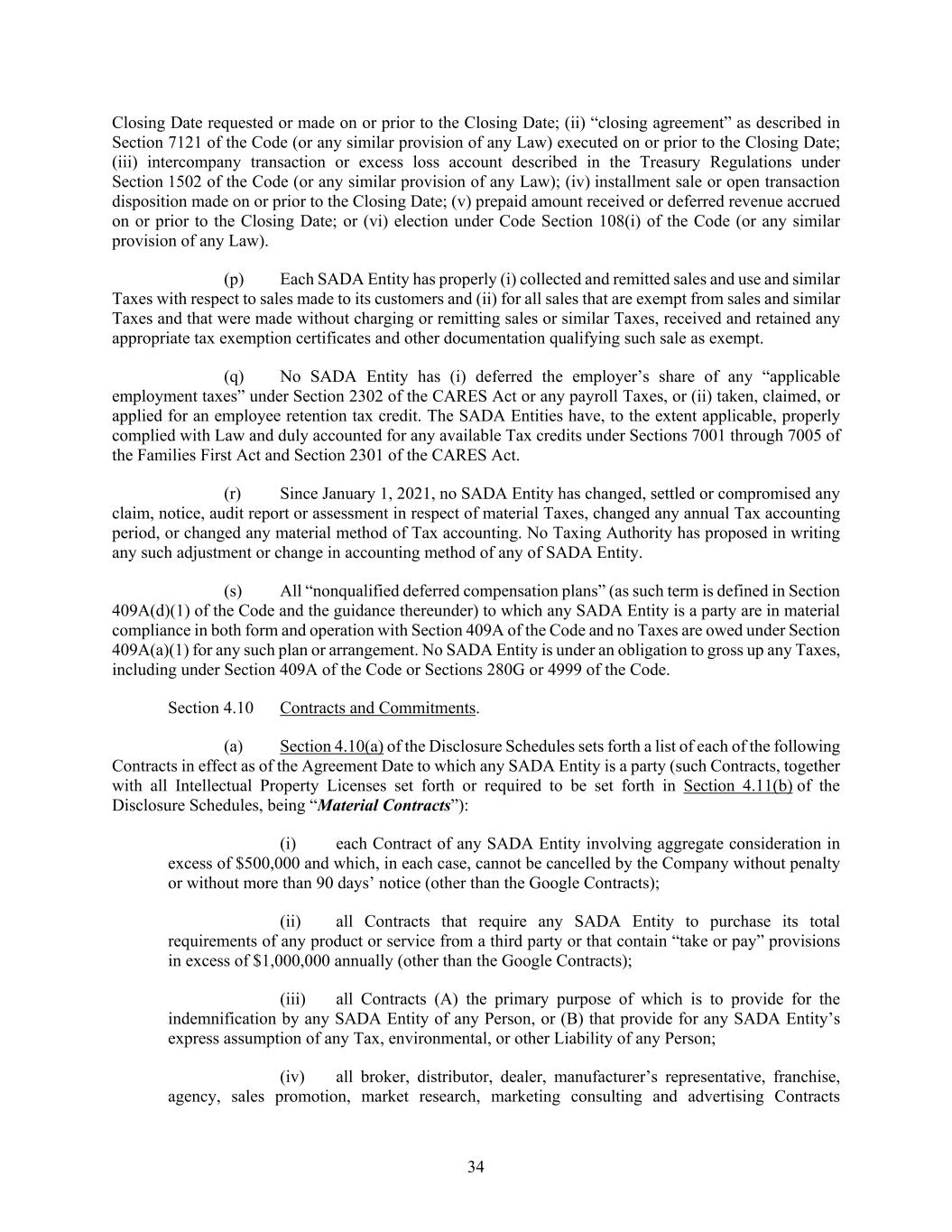 34 Closing Date requested or made on or prior to the Closing Date; (ii) “closing agreement” as described in Section 7121 of the Code (or any similar provision of any Law) executed on or prior to the Closing Date; (iii) intercompany transaction or excess loss account described in the Treasury Regulations under Section 1502 of the Code (or any similar provision of any Law); (iv) installment sale or open transaction disposition made on or prior to the Closing Date; (v) prepaid amount received or deferred revenue accrued on or prior to the Closing Date; or (vi) election under Code Section 108(i) of the Code (or any similar provision of any Law). (p) Each SADA Entity has properly (i) collected and remitted sales and use and similar Taxes with respect to sales made to its customers and (ii) for all sales that are exempt from sales and similar Taxes and that were made without charging or remitting sales or similar Taxes, received and retained any appropriate tax exemption certificates and other documentation qualifying such sale as exempt. (q) No SADA Entity has (i) deferred the employer’s share of any “applicable employment taxes” under Section 2302 of the CARES Act or any payroll Taxes, or (ii) taken, claimed, or applied for an employee retention tax credit. The SADA Entities have, to the extent applicable, properly complied with Law and duly accounted for any available Tax credits under Sections 7001 through 7005 of the Families First Act and Section 2301 of the CARES Act. (r) Since January 1, 2021, no SADA Entity has changed, settled or compromised any claim, notice, audit report or assessment in respect of material Taxes, changed any annual Tax accounting period, or changed any material method of Tax accounting. No Taxing Authority has proposed in writing any such adjustment or change in accounting method of any of SADA Entity. (s) All “nonqualified deferred compensation plans” (as such term is defined in Section 409A(d)(1) of the Code and the guidance thereunder) to which any SADA Entity is a party are in material compliance in both form and operation with Section 409A of the Code and no Taxes are owed under Section 409A(a)(1) for any such plan or arrangement. No SADA Entity is under an obligation to gross up any Taxes, including under Section 409A of the Code or Sections 280G or 4999 of the Code. Section 4.10 Contracts and Commitments. (a) Section 4.10(a) of the Disclosure Schedules sets forth a list of each of the following Contracts in effect as of the Agreement Date to which any SADA Entity is a party (such Contracts, together with all Intellectual Property Licenses set forth or required to be set forth in Section 4.11(b) of the Disclosure Schedules, being “Material Contracts”): (i) each Contract of any SADA Entity involving aggregate consideration in excess of $500,000 and which, in each case, cannot be cancelled by the Company without penalty or without more than 90 days’ notice (other than the Google Contracts); (ii) all Contracts that require any SADA Entity to purchase its total requirements of any product or service from a third party or that contain “take or pay” provisions in excess of $1,000,000 annually (other than the Google Contracts); (iii) all Contracts (A) the primary purpose of which is to provide for the indemnification by any SADA Entity of any Person, or (B) that provide for any SADA Entity’s express assumption of any Tax, environmental, or other Liability of any Person; (iv) all broker, distributor, dealer, manufacturer’s representative, franchise, agency, sales promotion, market research, marketing consulting and advertising Contracts