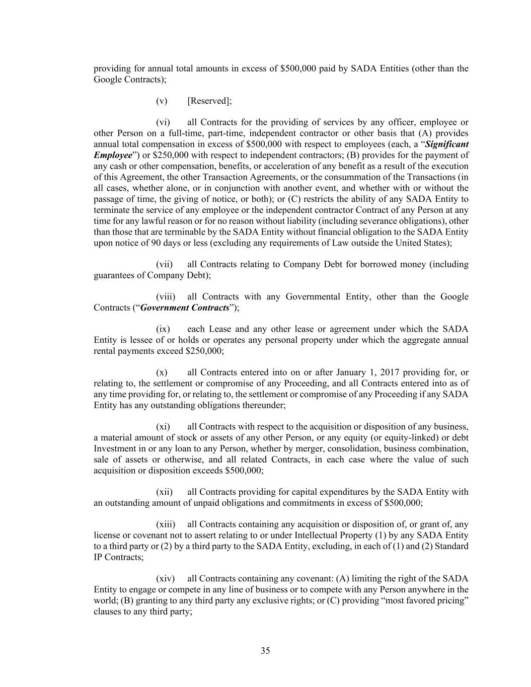 35 providing for annual total amounts in excess of $500,000 paid by SADA Entities (other than the Google Contracts); (v) [Reserved]; (vi) all Contracts for the providing of services by any officer, employee or other Person on a full-time, part-time, independent contractor or other basis that (A) provides annual total compensation in excess of $500,000 with respect to employees (each, a “Significant Employee”) or $250,000 with respect to independent contractors; (B) provides for the payment of any cash or other compensation, benefits, or acceleration of any benefit as a result of the execution of this Agreement, the other Transaction Agreements, or the consummation of the Transactions (in all cases, whether alone, or in conjunction with another event, and whether with or without the passage of time, the giving of notice, or both); or (C) restricts the ability of any SADA Entity to terminate the service of any employee or the independent contractor Contract of any Person at any time for any lawful reason or for no reason without liability (including severance obligations), other than those that are terminable by the SADA Entity without financial obligation to the SADA Entity upon notice of 90 days or less (excluding any requirements of Law outside the United States); (vii) all Contracts relating to Company Debt for borrowed money (including guarantees of Company Debt); (viii) all Contracts with any Governmental Entity, other than the Google Contracts (“Government Contracts”); (ix) each Lease and any other lease or agreement under which the SADA Entity is lessee of or holds or operates any personal property under which the aggregate annual rental payments exceed $250,000; (x) all Contracts entered into on or after January 1, 2017 providing for, or relating to, the settlement or compromise of any Proceeding, and all Contracts entered into as of any time providing for, or relating to, the settlement or compromise of any Proceeding if any SADA Entity has any outstanding obligations thereunder; (xi) all Contracts with respect to the acquisition or disposition of any business, a material amount of stock or assets of any other Person, or any equity (or equity-linked) or debt Investment in or any loan to any Person, whether by merger, consolidation, business combination, sale of assets or otherwise, and all related Contracts, in each case where the value of such acquisition or disposition exceeds $500,000; (xii) all Contracts providing for capital expenditures by the SADA Entity with an outstanding amount of unpaid obligations and commitments in excess of $500,000; (xiii) all Contracts containing any acquisition or disposition of, or grant of, any license or covenant not to assert relating to or under Intellectual Property (1) by any SADA Entity to a third party or (2) by a third party to the SADA Entity, excluding, in each of (1) and (2) Standard IP Contracts; (xiv) all Contracts containing any covenant: (A) limiting the right of the SADA Entity to engage or compete in any line of business or to compete with any Person anywhere in the world; (B) granting to any third party any exclusive rights; or (C) providing “most favored pricing” clauses to any third party;