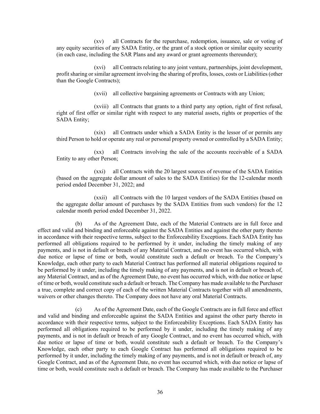 36 (xv) all Contracts for the repurchase, redemption, issuance, sale or voting of any equity securities of any SADA Entity, or the grant of a stock option or similar equity security (in each case, including the SAR Plans and any award or grant agreements thereunder); (xvi) all Contracts relating to any joint venture, partnerships, joint development, profit sharing or similar agreement involving the sharing of profits, losses, costs or Liabilities (other than the Google Contracts); (xvii) all collective bargaining agreements or Contracts with any Union; (xviii) all Contracts that grants to a third party any option, right of first refusal, right of first offer or similar right with respect to any material assets, rights or properties of the SADA Entity; (xix) all Contracts under which a SADA Entity is the lessor of or permits any third Person to hold or operate any real or personal property owned or controlled by a SADA Entity; (xx) all Contracts involving the sale of the accounts receivable of a SADA Entity to any other Person; (xxi) all Contracts with the 20 largest sources of revenue of the SADA Entities (based on the aggregate dollar amount of sales to the SADA Entities) for the 12-calendar month period ended December 31, 2022; and (xxii) all Contracts with the 10 largest vendors of the SADA Entities (based on the aggregate dollar amount of purchases by the SADA Entities from such vendors) for the 12 calendar month period ended December 31, 2022. (b) As of the Agreement Date, each of the Material Contracts are in full force and effect and valid and binding and enforceable against the SADA Entities and against the other party thereto in accordance with their respective terms, subject to the Enforceability Exceptions. Each SADA Entity has performed all obligations required to be performed by it under, including the timely making of any payments, and is not in default or breach of any Material Contract, and no event has occurred which, with due notice or lapse of time or both, would constitute such a default or breach. To the Company’s Knowledge, each other party to each Material Contract has performed all material obligations required to be performed by it under, including the timely making of any payments, and is not in default or breach of, any Material Contract, and as of the Agreement Date, no event has occurred which, with due notice or lapse of time or both, would constitute such a default or breach. The Company has made available to the Purchaser a true, complete and correct copy of each of the written Material Contracts together with all amendments, waivers or other changes thereto. The Company does not have any oral Material Contracts. (c) As of the Agreement Date, each of the Google Contracts are in full force and effect and valid and binding and enforceable against the SADA Entities and against the other party thereto in accordance with their respective terms, subject to the Enforceability Exceptions. Each SADA Entity has performed all obligations required to be performed by it under, including the timely making of any payments, and is not in default or breach of any Google Contract, and no event has occurred which, with due notice or lapse of time or both, would constitute such a default or breach. To the Company’s Knowledge, each other party to each Google Contract has performed all obligations required to be performed by it under, including the timely making of any payments, and is not in default or breach of, any Google Contract, and as of the Agreement Date, no event has occurred which, with due notice or lapse of time or both, would constitute such a default or breach. The Company has made available to the Purchaser