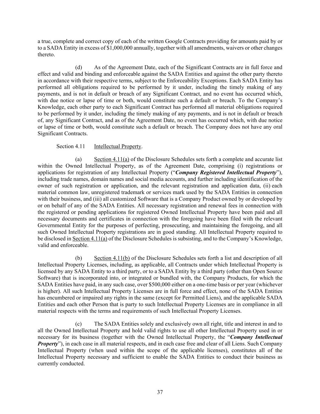 37 a true, complete and correct copy of each of the written Google Contracts providing for amounts paid by or to a SADA Entity in excess of $1,000,000 annually, together with all amendments, waivers or other changes thereto. (d) As of the Agreement Date, each of the Significant Contracts are in full force and effect and valid and binding and enforceable against the SADA Entities and against the other party thereto in accordance with their respective terms, subject to the Enforceability Exceptions. Each SADA Entity has performed all obligations required to be performed by it under, including the timely making of any payments, and is not in default or breach of any Significant Contract, and no event has occurred which, with due notice or lapse of time or both, would constitute such a default or breach. To the Company’s Knowledge, each other party to each Significant Contract has performed all material obligations required to be performed by it under, including the timely making of any payments, and is not in default or breach of, any Significant Contract, and as of the Agreement Date, no event has occurred which, with due notice or lapse of time or both, would constitute such a default or breach. The Company does not have any oral Significant Contracts. Section 4.11 Intellectual Property. (a) Section 4.11(a) of the Disclosure Schedules sets forth a complete and accurate list within the Owned Intellectual Property, as of the Agreement Date, comprising (i) registrations or applications for registration of any Intellectual Property (“Company Registered Intellectual Property”), including trade names, domain names and social media accounts, and further including identification of the owner of such registration or application, and the relevant registration and application data, (ii) each material common law, unregistered trademark or services mark used by the SADA Entities in connection with their business, and (iii) all customized Software that is a Company Product owned by or developed by or on behalf of any of the SADA Entities. All necessary registration and renewal fees in connection with the registered or pending applications for registered Owned Intellectual Property have been paid and all necessary documents and certificates in connection with the foregoing have been filed with the relevant Governmental Entity for the purposes of perfecting, prosecuting, and maintaining the foregoing, and all such Owned Intellectual Property registrations are in good standing. All Intellectual Property required to be disclosed in Section 4.11(a) of the Disclosure Schedules is subsisting, and to the Company’s Knowledge, valid and enforceable. (b) Section 4.11(b) of the Disclosure Schedules sets forth a list and description of all Intellectual Property Licenses, including, as applicable, all Contracts under which Intellectual Property is licensed by any SADA Entity to a third party, or to a SADA Entity by a third party (other than Open Source Software) that is incorporated into, or integrated or bundled with, the Company Products, for which the SADA Entities have paid, in any such case, over $500,000 either on a one-time basis or per year (whichever is higher). All such Intellectual Property Licenses are in full force and effect, none of the SADA Entities has encumbered or impaired any rights in the same (except for Permitted Liens), and the applicable SADA Entities and each other Person that is party to such Intellectual Property Licenses are in compliance in all material respects with the terms and requirements of such Intellectual Property Licenses. (c) The SADA Entities solely and exclusively own all right, title and interest in and to all the Owned Intellectual Property and hold valid rights to use all other Intellectual Property used in or necessary for its business (together with the Owned Intellectual Property, the “Company Intellectual Property”), in each case in all material respects, and in each case free and clear of all Liens. Such Company Intellectual Property (when used within the scope of the applicable licenses), constitutes all of the Intellectual Property necessary and sufficient to enable the SADA Entities to conduct their business as currently conducted.