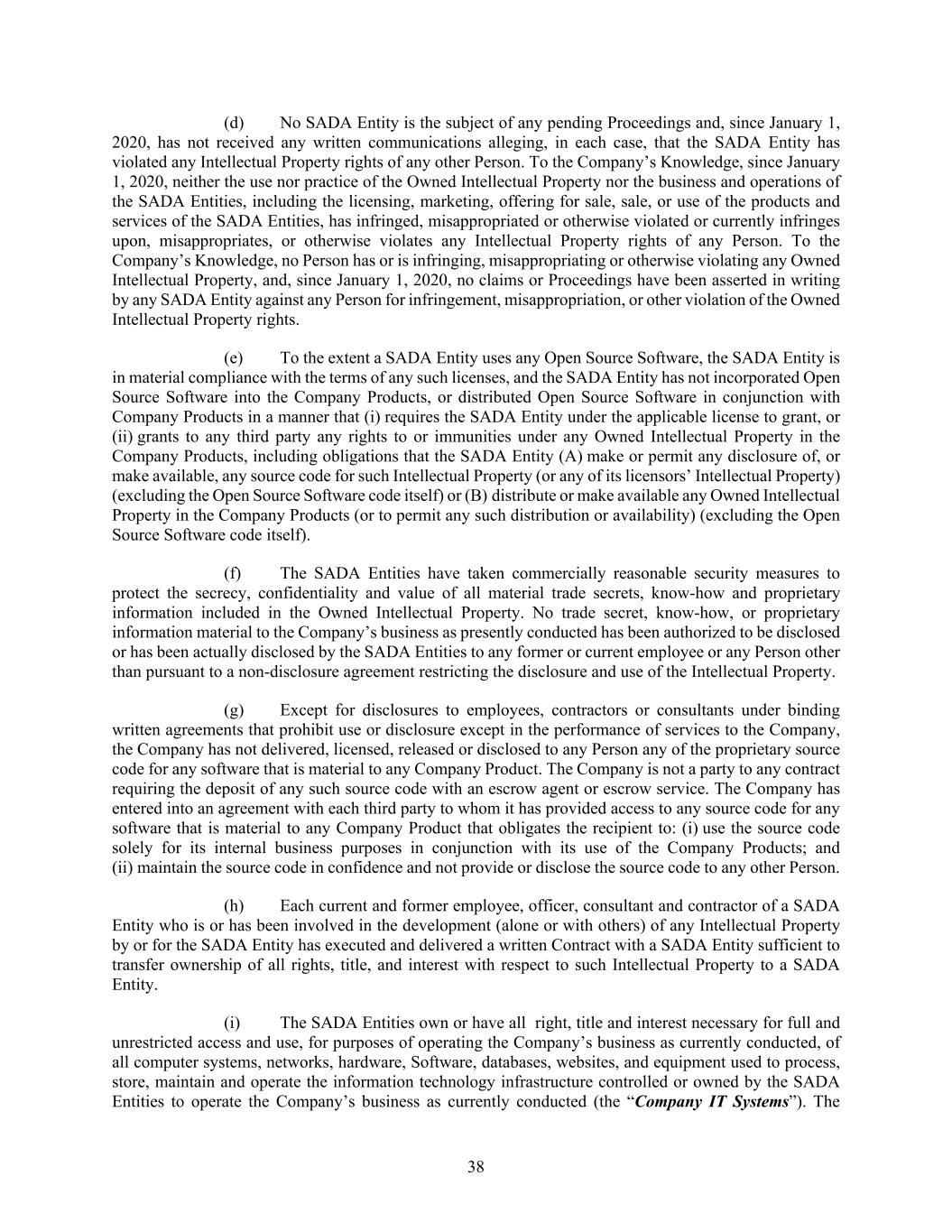 38 (d) No SADA Entity is the subject of any pending Proceedings and, since January 1, 2020, has not received any written communications alleging, in each case, that the SADA Entity has violated any Intellectual Property rights of any other Person. To the Company’s Knowledge, since January 1, 2020, neither the use nor practice of the Owned Intellectual Property nor the business and operations of the SADA Entities, including the licensing, marketing, offering for sale, sale, or use of the products and services of the SADA Entities, has infringed, misappropriated or otherwise violated or currently infringes upon, misappropriates, or otherwise violates any Intellectual Property rights of any Person. To the Company’s Knowledge, no Person has or is infringing, misappropriating or otherwise violating any Owned Intellectual Property, and, since January 1, 2020, no claims or Proceedings have been asserted in writing by any SADA Entity against any Person for infringement, misappropriation, or other violation of the Owned Intellectual Property rights. (e) To the extent a SADA Entity uses any Open Source Software, the SADA Entity is in material compliance with the terms of any such licenses, and the SADA Entity has not incorporated Open Source Software into the Company Products, or distributed Open Source Software in conjunction with Company Products in a manner that (i) requires the SADA Entity under the applicable license to grant, or (ii) grants to any third party any rights to or immunities under any Owned Intellectual Property in the Company Products, including obligations that the SADA Entity (A) make or permit any disclosure of, or make available, any source code for such Intellectual Property (or any of its licensors’ Intellectual Property) (excluding the Open Source Software code itself) or (B) distribute or make available any Owned Intellectual Property in the Company Products (or to permit any such distribution or availability) (excluding the Open Source Software code itself). (f) The SADA Entities have taken commercially reasonable security measures to protect the secrecy, confidentiality and value of all material trade secrets, know-how and proprietary information included in the Owned Intellectual Property. No trade secret, know-how, or proprietary information material to the Company’s business as presently conducted has been authorized to be disclosed or has been actually disclosed by the SADA Entities to any former or current employee or any Person other than pursuant to a non-disclosure agreement restricting the disclosure and use of the Intellectual Property. (g) Except for disclosures to employees, contractors or consultants under binding written agreements that prohibit use or disclosure except in the performance of services to the Company, the Company has not delivered, licensed, released or disclosed to any Person any of the proprietary source code for any software that is material to any Company Product. The Company is not a party to any contract requiring the deposit of any such source code with an escrow agent or escrow service. The Company has entered into an agreement with each third party to whom it has provided access to any source code for any software that is material to any Company Product that obligates the recipient to: (i) use the source code solely for its internal business purposes in conjunction with its use of the Company Products; and (ii) maintain the source code in confidence and not provide or disclose the source code to any other Person. (h) Each current and former employee, officer, consultant and contractor of a SADA Entity who is or has been involved in the development (alone or with others) of any Intellectual Property by or for the SADA Entity has executed and delivered a written Contract with a SADA Entity sufficient to transfer ownership of all rights, title, and interest with respect to such Intellectual Property to a SADA Entity. (i) The SADA Entities own or have all right, title and interest necessary for full and unrestricted access and use, for purposes of operating the Company’s business as currently conducted, of all computer systems, networks, hardware, Software, databases, websites, and equipment used to process, store, maintain and operate the information technology infrastructure controlled or owned by the SADA Entities to operate the Company’s business as currently conducted (the “Company IT Systems”). The