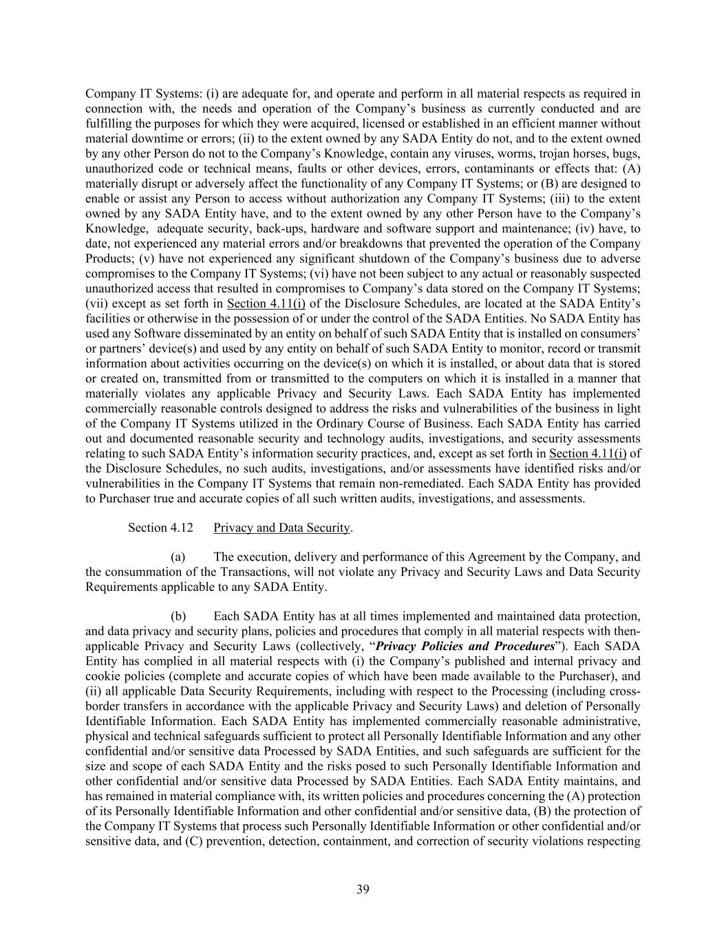 39 Company IT Systems: (i) are adequate for, and operate and perform in all material respects as required in connection with, the needs and operation of the Company’s business as currently conducted and are fulfilling the purposes for which they were acquired, licensed or established in an efficient manner without material downtime or errors; (ii) to the extent owned by any SADA Entity do not, and to the extent owned by any other Person do not to the Company’s Knowledge, contain any viruses, worms, trojan horses, bugs, unauthorized code or technical means, faults or other devices, errors, contaminants or effects that: (A) materially disrupt or adversely affect the functionality of any Company IT Systems; or (B) are designed to enable or assist any Person to access without authorization any Company IT Systems; (iii) to the extent owned by any SADA Entity have, and to the extent owned by any other Person have to the Company’s Knowledge, adequate security, back-ups, hardware and software support and maintenance; (iv) have, to date, not experienced any material errors and/or breakdowns that prevented the operation of the Company Products; (v) have not experienced any significant shutdown of the Company’s business due to adverse compromises to the Company IT Systems; (vi) have not been subject to any actual or reasonably suspected unauthorized access that resulted in compromises to Company’s data stored on the Company IT Systems; (vii) except as set forth in Section 4.11(i) of the Disclosure Schedules, are located at the SADA Entity’s facilities or otherwise in the possession of or under the control of the SADA Entities. No SADA Entity has used any Software disseminated by an entity on behalf of such SADA Entity that is installed on consumers’ or partners’ device(s) and used by any entity on behalf of such SADA Entity to monitor, record or transmit information about activities occurring on the device(s) on which it is installed, or about data that is stored or created on, transmitted from or transmitted to the computers on which it is installed in a manner that materially violates any applicable Privacy and Security Laws. Each SADA Entity has implemented commercially reasonable controls designed to address the risks and vulnerabilities of the business in light of the Company IT Systems utilized in the Ordinary Course of Business. Each SADA Entity has carried out and documented reasonable security and technology audits, investigations, and security assessments relating to such SADA Entity’s information security practices, and, except as set forth in Section 4.11(i) of the Disclosure Schedules, no such audits, investigations, and/or assessments have identified risks and/or vulnerabilities in the Company IT Systems that remain non-remediated. Each SADA Entity has provided to Purchaser true and accurate copies of all such written audits, investigations, and assessments. Section 4.12 Privacy and Data Security. (a) The execution, delivery and performance of this Agreement by the Company, and the consummation of the Transactions, will not violate any Privacy and Security Laws and Data Security Requirements applicable to any SADA Entity. (b) Each SADA Entity has at all times implemented and maintained data protection, and data privacy and security plans, policies and procedures that comply in all material respects with then- applicable Privacy and Security Laws (collectively, “Privacy Policies and Procedures”). Each SADA Entity has complied in all material respects with (i) the Company’s published and internal privacy and cookie policies (complete and accurate copies of which have been made available to the Purchaser), and (ii) all applicable Data Security Requirements, including with respect to the Processing (including cross- border transfers in accordance with the applicable Privacy and Security Laws) and deletion of Personally Identifiable Information. Each SADA Entity has implemented commercially reasonable administrative, physical and technical safeguards sufficient to protect all Personally Identifiable Information and any other confidential and/or sensitive data Processed by SADA Entities, and such safeguards are sufficient for the size and scope of each SADA Entity and the risks posed to such Personally Identifiable Information and other confidential and/or sensitive data Processed by SADA Entities. Each SADA Entity maintains, and has remained in material compliance with, its written policies and procedures concerning the (A) protection of its Personally Identifiable Information and other confidential and/or sensitive data, (B) the protection of the Company IT Systems that process such Personally Identifiable Information or other confidential and/or sensitive data, and (C) prevention, detection, containment, and correction of security violations respecting