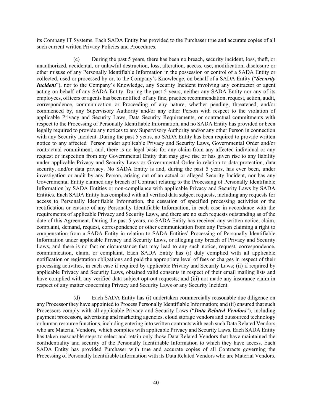 40 its Company IT Systems. Each SADA Entity has provided to the Purchaser true and accurate copies of all such current written Privacy Policies and Procedures. (c) During the past 5 years, there has been no breach, security incident, loss, theft, or unauthorized, accidental, or unlawful destruction, loss, alteration, access, use, modification, disclosure or other misuse of any Personally Identifiable Information in the possession or control of a SADA Entity or collected, used or processed by or, to the Company’s Knowledge, on behalf of a SADA Entity (“Security Incident”), nor to the Company’s Knowledge, any Security Incident involving any contractor or agent acting on behalf of any SADA Entity. During the past 5 years, neither any SADA Entity nor any of its employees, officers or agents has been notified of any fine, practice recommendation, request, action, audit, correspondence, communication or Proceeding of any nature, whether pending, threatened, and/or commenced by, any Supervisory Authority and/or any other Person with respect to the violation of applicable Privacy and Security Laws, Data Security Requirements, or contractual commitments with respect to the Processing of Personally Identifiable Information, and no SADA Entity has provided or been legally required to provide any notices to any Supervisory Authority and/or any other Person in connection with any Security Incident. During the past 5 years, no SADA Entity has been required to provide written notice to any affected Person under applicable Privacy and Security Laws, Governmental Order and/or contractual commitment, and, there is no legal basis for any claim from any affected individual or any request or inspection from any Governmental Entity that may give rise or has given rise to any liability under applicable Privacy and Security Laws or Governmental Order in relation to data protection, data security, and/or data privacy. No SADA Entity is and, during the past 5 years, has ever been, under investigation or audit by any Person, arising out of an actual or alleged Security Incident, nor has any Governmental Entity claimed any breach of Contract relating to the Processing of Personally Identifiable Information by SADA Entities or non-compliance with applicable Privacy and Security Laws by SADA Entities. Each SADA Entity has complied with all verified data subject requests, including any requests for access to Personally Identifiable Information, the cessation of specified processing activities or the rectification or erasure of any Personally Identifiable Information, in each case in accordance with the requirements of applicable Privacy and Security Laws, and there are no such requests outstanding as of the date of this Agreement. During the past 5 years, no SADA Entity has received any written notice, claim, complaint, demand, request, correspondence or other communication from any Person claiming a right to compensation from a SADA Entity in relation to SADA Entities’ Processing of Personally Identifiable Information under applicable Privacy and Security Laws, or alleging any breach of Privacy and Security Laws, and there is no fact or circumstance that may lead to any such notice, request, correspondence, communication, claim, or complaint. Each SADA Entity has (i) duly complied with all applicable notification or registration obligations and paid the appropriate level of fees or charges in respect of their processing activities, in each case if required by applicable Privacy and Security Laws; (ii) if required by applicable Privacy and Security Laws, obtained valid consents in respect of their email mailing lists and have complied with any verified data subject opt-out requests; and (iii) not made any insurance claim in respect of any matter concerning Privacy and Security Laws or any Security Incident. (d) Each SADA Entity has (i) undertaken commercially reasonable due diligence on any Processor they have appointed to Process Personally Identifiable Information; and (ii) ensured that such Processors comply with all applicable Privacy and Security Laws (“Data Related Vendors”), including payment processors, advertising and marketing agencies, cloud storage vendors and outsourced technology or human resource functions, including entering into written contracts with each such Data Related Vendors who are Material Vendors, which complies with applicable Privacy and Security Laws. Each SADA Entity has taken reasonable steps to select and retain only those Data Related Vendors that have maintained the confidentiality and security of the Personally Identifiable Information to which they have access. Each SADA Entity has provided Purchaser with true and accurate copies of all Contracts governing the Processing of Personally Identifiable Information with its Data Related Vendors who are Material Vendors.