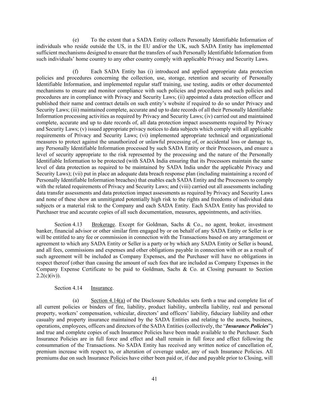 41 (e) To the extent that a SADA Entity collects Personally Identifiable Information of individuals who reside outside the US, in the EU and/or the UK, such SADA Entity has implemented sufficient mechanisms designed to ensure that the transfers of such Personally Identifiable Information from such individuals’ home country to any other country comply with applicable Privacy and Security Laws. (f) Each SADA Entity has (i) introduced and applied appropriate data protection policies and procedures concerning the collection, use, storage, retention and security of Personally Identifiable Information, and implemented regular staff training, use testing, audits or other documented mechanisms to ensure and monitor compliance with such policies and procedures and such policies and procedures are in compliance with Privacy and Security Laws; (ii) appointed a data protection officer and published their name and contract details on such entity’s website if required to do so under Privacy and Security Laws; (iii) maintained complete, accurate and up to date records of all their Personally Identifiable Information processing activities as required by Privacy and Security Laws; (iv) carried out and maintained complete, accurate and up to date records of, all data protection impact assessments required by Privacy and Security Laws; (v) issued appropriate privacy notices to data subjects which comply with all applicable requirements of Privacy and Security Laws; (vi) implemented appropriate technical and organizational measures to protect against the unauthorized or unlawful processing of, or accidental loss or damage to, any Personally Identifiable Information processed by such SADA Entity or their Processors, and ensure a level of security appropriate to the risk represented by the processing and the nature of the Personally Identifiable Information to be protected (with SADA India ensuring that its Processors maintain the same level of data protection as required to be maintained by SADA India under the applicable Privacy and Security Laws); (vii) put in place an adequate data breach response plan (including maintaining a record of Personally Identifiable Information breaches) that enables each SADA Entity and the Processors to comply with the related requirements of Privacy and Security Laws; and (viii) carried out all assessments including data transfer assessments and data protection impact assessments as required by Privacy and Security Laws and none of these show an unmitigated potentially high risk to the rights and freedoms of individual data subjects or a material risk to the Company and each SADA Entity. Each SADA Entity has provided to Purchaser true and accurate copies of all such documentation, measures, appointments, and activities. Section 4.13 Brokerage. Except for Goldman, Sachs & Co., no agent, broker, investment banker, financial advisor or other similar firm engaged by or on behalf of any SADA Entity or Seller is or will be entitled to any fee or commission in connection with the Transactions based on any arrangement or agreement to which any SADA Entity or Seller is a party or by which any SADA Entity or Seller is bound, and all fees, commissions and expenses and other obligations payable in connection with or as a result of such agreement will be included as Company Expenses, and the Purchaser will have no obligations in respect thereof (other than causing the amount of such fees that are included as Company Expenses in the Company Expense Certificate to be paid to Goldman, Sachs & Co. at Closing pursuant to Section 2.2(c)(iv)). Section 4.14 Insurance. (a) Section 4.14(a) of the Disclosure Schedules sets forth a true and complete list of all current policies or binders of fire, liability, product liability, umbrella liability, real and personal property, workers’ compensation, vehicular, directors’ and officers’ liability, fiduciary liability and other casualty and property insurance maintained by the SADA Entities and relating to the assets, business, operations, employees, officers and directors of the SADA Entities (collectively, the “Insurance Policies”) and true and complete copies of such Insurance Policies have been made available to the Purchaser. Such Insurance Policies are in full force and effect and shall remain in full force and effect following the consummation of the Transactions. No SADA Entity has received any written notice of cancellation of, premium increase with respect to, or alteration of coverage under, any of such Insurance Policies. All premiums due on such Insurance Policies have either been paid or, if due and payable prior to Closing, will