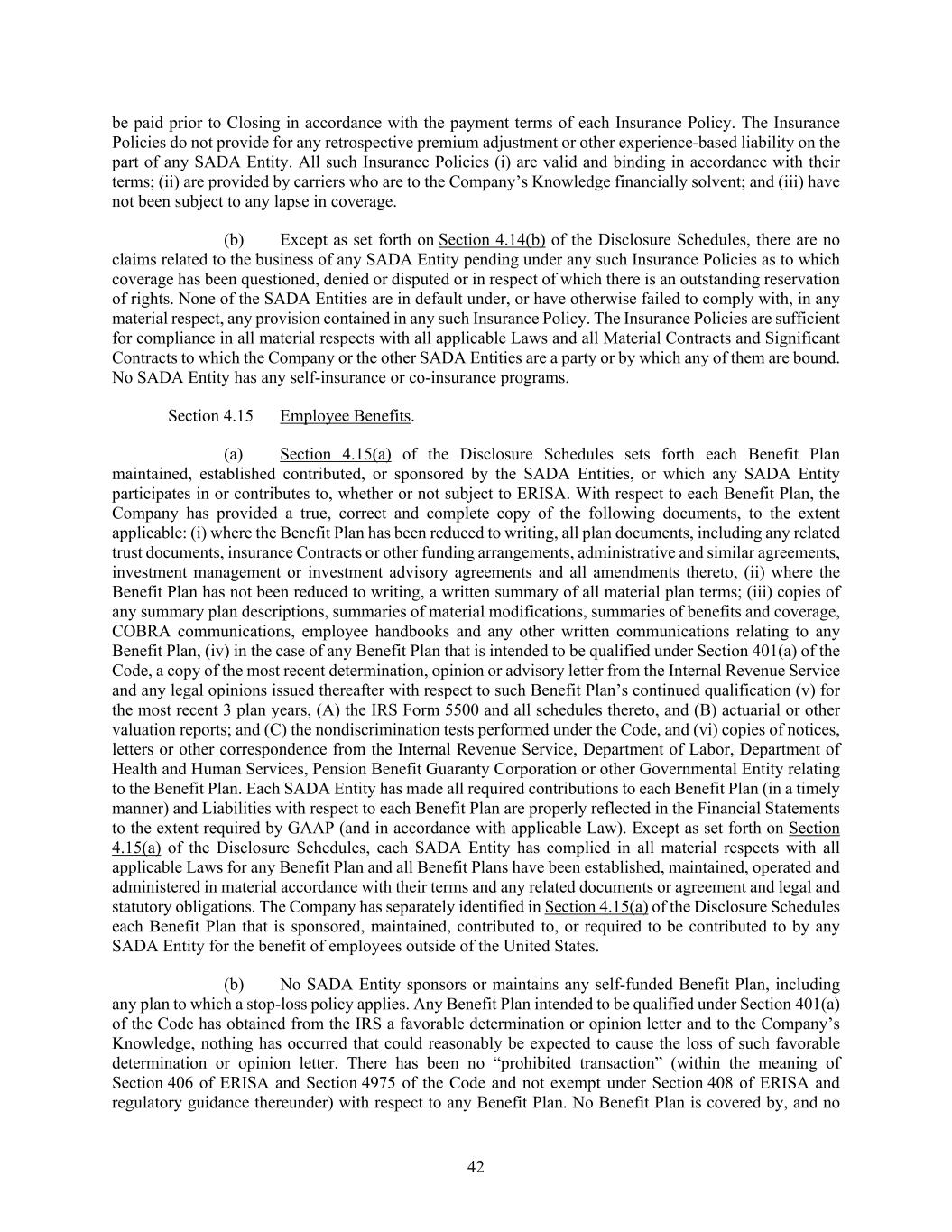 42 be paid prior to Closing in accordance with the payment terms of each Insurance Policy. The Insurance Policies do not provide for any retrospective premium adjustment or other experience-based liability on the part of any SADA Entity. All such Insurance Policies (i) are valid and binding in accordance with their terms; (ii) are provided by carriers who are to the Company’s Knowledge financially solvent; and (iii) have not been subject to any lapse in coverage. (b) Except as set forth on Section 4.14(b) of the Disclosure Schedules, there are no claims related to the business of any SADA Entity pending under any such Insurance Policies as to which coverage has been questioned, denied or disputed or in respect of which there is an outstanding reservation of rights. None of the SADA Entities are in default under, or have otherwise failed to comply with, in any material respect, any provision contained in any such Insurance Policy. The Insurance Policies are sufficient for compliance in all material respects with all applicable Laws and all Material Contracts and Significant Contracts to which the Company or the other SADA Entities are a party or by which any of them are bound. No SADA Entity has any self-insurance or co-insurance programs. Section 4.15 Employee Benefits. (a) Section 4.15(a) of the Disclosure Schedules sets forth each Benefit Plan maintained, established contributed, or sponsored by the SADA Entities, or which any SADA Entity participates in or contributes to, whether or not subject to ERISA. With respect to each Benefit Plan, the Company has provided a true, correct and complete copy of the following documents, to the extent applicable: (i) where the Benefit Plan has been reduced to writing, all plan documents, including any related trust documents, insurance Contracts or other funding arrangements, administrative and similar agreements, investment management or investment advisory agreements and all amendments thereto, (ii) where the Benefit Plan has not been reduced to writing, a written summary of all material plan terms; (iii) copies of any summary plan descriptions, summaries of material modifications, summaries of benefits and coverage, COBRA communications, employee handbooks and any other written communications relating to any Benefit Plan, (iv) in the case of any Benefit Plan that is intended to be qualified under Section 401(a) of the Code, a copy of the most recent determination, opinion or advisory letter from the Internal Revenue Service and any legal opinions issued thereafter with respect to such Benefit Plan’s continued qualification (v) for the most recent 3 plan years, (A) the IRS Form 5500 and all schedules thereto, and (B) actuarial or other valuation reports; and (C) the nondiscrimination tests performed under the Code, and (vi) copies of notices, letters or other correspondence from the Internal Revenue Service, Department of Labor, Department of Health and Human Services, Pension Benefit Guaranty Corporation or other Governmental Entity relating to the Benefit Plan. Each SADA Entity has made all required contributions to each Benefit Plan (in a timely manner) and Liabilities with respect to each Benefit Plan are properly reflected in the Financial Statements to the extent required by GAAP (and in accordance with applicable Law). Except as set forth on Section 4.15(a) of the Disclosure Schedules, each SADA Entity has complied in all material respects with all applicable Laws for any Benefit Plan and all Benefit Plans have been established, maintained, operated and administered in material accordance with their terms and any related documents or agreement and legal and statutory obligations. The Company has separately identified in Section 4.15(a) of the Disclosure Schedules each Benefit Plan that is sponsored, maintained, contributed to, or required to be contributed to by any SADA Entity for the benefit of employees outside of the United States. (b) No SADA Entity sponsors or maintains any self-funded Benefit Plan, including any plan to which a stop-loss policy applies. Any Benefit Plan intended to be qualified under Section 401(a) of the Code has obtained from the IRS a favorable determination or opinion letter and to the Company’s Knowledge, nothing has occurred that could reasonably be expected to cause the loss of such favorable determination or opinion letter. There has been no “prohibited transaction” (within the meaning of Section 406 of ERISA and Section 4975 of the Code and not exempt under Section 408 of ERISA and regulatory guidance thereunder) with respect to any Benefit Plan. No Benefit Plan is covered by, and no
